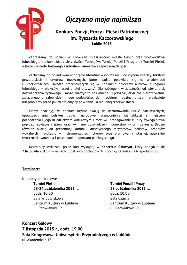 Ojczyzno moja najmilsza Konkurs Poezji, Prozy i Pieśni Patriotycznej im. Ryszarda Kaczorowskiego Lublin 2015 Zapraszamy do udziału w Konkursie mieszkańców miasta Lublin oraz województwa lubelskiego. Konkurs składa się z dwóch Turniejów: Turniej Poezji i Prozy oraz Turniej Pieśni, a także Koncertu Galowego z udziałem Laureatów i zaproszonych gości. Zachęcamy do poszukiwań w obrębie literatury współczesnej, do wyboru wierszy, tekstów prozatorskich i utworów muzycznych, które rzadko pojawiają się na akademiach i uroczystościach. Uwadze prezentujących się w Konkursie polecamy autorów z regionu lubelskiego – piewców naszej „małej ojczyzny”. Dla każdego - w zależności od wieku, płci, doświadczenia życiowego - może znaczyć to coś innego. "Ojczyzna", czyli coś nierozerwalnie związanego z człowiekiem: jego podowórko, dom rodzinny, rodzina, bliscy i przyjaciele lub problemy przed jakimi stajemy żyjąc w takiej, a nie innej rzeczywistości. Mamy nadzieję, że Konkurs będzie okazją do kształtowania uczuć patriotycznych, upowszechniania polskiej tradycji narodowej, wzmocnienia identyfikacji z miejscem pochodzenia i jego dziedzictwem kulturowym. Umożliwi propagowanie kultury żywego słowa poprzez recytację i śpiew oraz wymianę doświadczeń i pomysłów w tym zakresie. Będzie również okazją do prezentacji dorobku artystycznego recytatorów, solistów, zespołów wokalnych i wokalno – instrumentalnych, chórów oraz promowania własnej, autorskiej twórczości, tworzenia i poszerzania repertuaru patriotycznego. Uczestnicy wskazani przez Jury wystąpią w Koncercie Galowym, który odbędzie się 7 listopada 2015 r. w ramach lubelskich obchodów 97. rocznicy Odzyskania Niepodległości. Terminarz: Koncerty konkursowe Turniej Pieśni 23-24 października 2015 r., godz. 10.00 Sala Widowiskowa Centrum Kultury w Lublinie ul. Peowiaków 12 Turniej Poezji i Prozy 28 października 2015 r., godz. 10.00 Sala Czarna Centrum Kultury w Lublinie ul. Peowiaków 12 Koncert Galowy 7 listopada 2015 r., godz. 19.00 Sala Kongresowa Uniwersytetu Przyrodniczego w Lublinie ul. Akademicka 15 Zasady uczestnictwa: - Turniej Pieśni – konkurs wokalny 23 października (piątek) - godz. 10.00 - soliści i zespoły - godz. 16.00 - chóry 24 października (sobota) - godz. 10.00 - chóry w przypadku dużej liczy zgłoszeń dodatkowo 25 października (niedziela) - godz. 10.00 - soliści i zespoły Kategorie konkursowe: chóry zespoły wokalne/soliści Kategorie wiekowe: uczniowie szkoły podstawowej gimnazjaliści uczniowie szkół średnich i dorośli Do uczestnictwa zapraszamy chóry dziecięce i młodzieżowe, zespoły wokalne i wokalno– instrumentalne działające przy szkołach, domach kultury i parafiach oraz solistów. Uczestnicy przygotowują dwie pieśni lub piosenki nawiązujące do tematyki Konkursu. Zachęcamy do poszukiwań utworów muzycznych, które rzadko pojawiają się na szkolnych akademiach i uroczystościach. Czas prezentacji nie może przekroczyć 10 min. Prosimy o przygotowanie podkładów muzyczne na płycie w formacie audio CD oraz na nośniku pendrive w formacie mp3. - Turniej Poezji i Prozy – konkurs recytatorski 28 października (środa), godz. 10.00 w przypadku dużej liczy zgłoszeń dodatkowo 28 października (czwartek), godz. 10.00 Kategorie wiekowe: uczniowie szkoły podstawowej gimnazjaliści uczniowie szkół średnich i dorośli W tym roku uczestników obowiązuje prezentacja jednego utworu (wiersz lub fragment prozy). Zachęcamy do wyboru tekstów mało znanych, nieprezentowanych w poprzednich edycjach Konkursu. Mamy nadzieję, że poszukiwania repertuarowe zaowocują wykonywaniem tekstów, które są bliskie recytatorom. Opisujących i mówiących o własnym, indywidualnym rozumieniu pojęcia "Ojczyzna". Czas prezentacji nie może przekroczyć 5 min. I. II. Prezentacje oceniać będzie Jury powołane przez organizatorów. Jury będzie brać pod uwagę: dobór repertuaru, jego niestandardowość, kulturę słowa, poprawność muzyczną, interpretację utworów, ogólny wyraz artystyczny. III. W razie przekroczenia czasu prezentacji Jury ma prawo przerwać prezentację i odstąpić od jej oceny. IV. Werdykt Jury jest niepodważalny. V. W Koncercie Galowym udział wezmą laureaci wskazani przez Jury oraz wykonawcy zaproszeni przez organizatorów. VI. Laureaci Konkursu otrzymają nagrody finansowe oraz rzeczowe. VII. Organizatorzy zapewniają obsługę techniczną przesłuchań i Koncertu Galowego – nagłośnienie, oświetlenie, fortepian lub pianino. Pozostałe instrumenty muzyczne wykonawcy zapewniają we własnym zakresie. VIII. Informacje o kolejności prezentacji nie będą podawane. Uczestników i ich opiekunów obowiązuje obecność od początku do końca danego turnieju. IX. Organizatorzy zapewniają instruktorom i nauczycielom rozmowy z konsultantami-jurorami. Zgłoszenia: Konkurs adresowany jest do młodzieży szkolnej, akademickiej oraz dorosłych mieszkańców miasta Lublin oraz województwa lubelskiego. Liczba zgłoszeń z placówki (szkoła, ośrodek kultury, parafia) – nie więcej niż 2 podmioty wykonawcze w każdej kategorii. Zachęcamy do przeprowadzenia wstępnych eliminacji w obrębie placówki. Wykonawcy dorośli mogą zgłaszać się indywidualnie. Prawidłowo wypełnione karty zgłoszenia ( tytuł utworu, autor tekstu, autor muzyki, dane do kontaktu i inne) należy dostarczyć osobiście, listownie bądź drogą mailową w nieprzekraczalnym terminie do dnia 16 października 2015 r. na adres Edukacji Kulturalnej. UWAGA! Karty niewypełnione w całości nie będą uwzględniane. Informacje o Konkursie można znaleźć na stronie www.ck.lublin.pl Dane kontaktowe: Edukacja Kulturalna Centrum Kultury w Lublinie ul. Peowiaków 12, pok 223 20-007 Lublin tel. (81) 466-61-51, 466 -61-15 [email protected] Organizatorzy: Dział Edukacji Kulturalnej Centrum Kultury w Lublinie Wydział Kultury Urzędu Miasta Lublin Wy