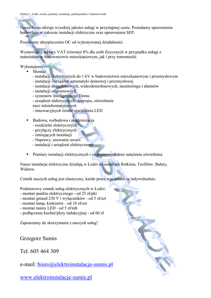 Elektryk - Łódź, awarie, pomiary, instalacje, profesjonalnie i fachowo Łódź Nasza firma oferuje wysokiej jakości usługi w przystępnej cenie. Posiadamy uprawnienia budowlane w zakresie instalacji elektryczne oraz uprawnienia SEP. Posiadamy ubezpieczenie OC od wykonywanej działalności. Wystawiamy faktury VAT (również 8% dla osób fizycznych w przypadku usługi z materiałem w budownictwie mieszkaniowym, jak i przy remontach). Wykonujemy: Montaż - instalacji elektrycznych do 1 kV w budownictwie mieszkaniowym i przemysłowym - instalacji i urządzeń automatyki domowej i przemysłowej - instalacji domofonowych, wideodomofonowych, monitoringu i alarmów - instalacji odgromowych - systemów Inteligentnego Domu - urządzeń elektrycznych, osprzętu, oświetlenia sieci teleinformatycznych - innowacyjnych źródeł oświetlenia LED Budowa, rozbudowa i modernizacja - rozdzielni elektrycznych - przyłączy elektrycznych - istniejących instalacji - Naprawy, usuwanie awarii - instalacji i urządzeń elektrycznych Pomiary instalacji elektrycznych i odgromowych oraz natężenia oświetlenia Nasze instalacje elektryczne działają w Łodzi na osiedlach Retkinia, Teofilów, Bałuty, Widzew. Cennik naszych usług jest elastyczny, każde prace wyceniane są indywidualnie. Podstawowy cennik usług elektrycznych w Łodzi: - montaż punktu elektrycznego - od 25 zł/pkt - montaż gniazd 230 V i wyłączników - od 5 zł/szt - montaż lamp, kinkietów - od 10 zł/szt - montaż taśmy LED - od 5 zł/mb - podłączenie kuchni/płyty indukcyjnej - od 60 zł Zapraszamy do skorzystania z naszych usług! Grzegorz Sumis Tel. 605 464 309 e-mail: [email protected] www.elektroinstalacje-sumis.pl