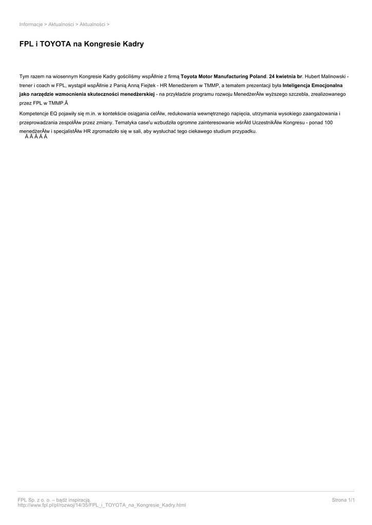 Informacje > Aktualności > Aktualności > FPL i TOYOTA na Kongresie Kadry Tym razem na wiosennym Kongresie Kadry gościliśmy wspĂłlnie z firmą Toyota Motor Manufacturing Poland. 24 kwietnia br. Hubert Malinowski trener i coach w FPL, wystąpił wspĂłlnie z Panią Anną Fiejtek - HR Menedżerem w TMMP, a tematem prezentacji była Inteligencja Emocjonalna jako narzędzie wzmocnienia skuteczności menedżerskiej - na przykładzie programu rozwoju MenedżerĂłw wyższego szczebla, zrealizowanego przez FPL w TMMP. Kompetencje EQ pojawiły się m.in. w kontekście osiągania celĂłw, redukowania wewnętrznego napięcia, utrzymania wysokiego zaangażowania i przeprowadzania zespołĂłw przez zmiany. Tematyka case'u wzbudziła ogromne zainteresowanie wśrĂłd UczestnikĂłw Kongresu - ponad 100 menedżerĂłw i specjalistĂłw HR zgromadziło się w sali, aby wysłuchać tego ciekawego studium przypadku.  FPL Sp. z o. o. – bądź inspiracją. http://www.fpl.pl/pl/rozwoj/14/35/FPL_i_TOYOTA_na_Kongresie_Kadry.html Strona 1/1