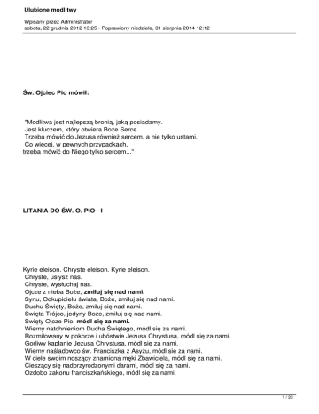 Ulubione modlitwy Wpisany przez Administrator sobota, 22 grudnia 2012 13:25 - Poprawiony niedziela, 31 sierpnia 2014 12:12 Św. Ojciec Pio mówił: "Modlitwa jest najlepszą bronią, jaką posiadamy. Jest kluczem, który otwiera Boże Serce. Trzeba mówić do Jezusa również sercem, a nie tylko ustami. Co więcej, w pewnych przypadkach, trzeba mówić do Niego tylko sercem..." LITANIA DO ŚW. O. PIO - I Kyrie eleison. Chryste eleison. Kyrie eleison. Chryste, usłysz nas. Chryste, wysłuchaj nas. Ojcze z nieba Boże, zmiłuj się nad nami. Synu, Odkupicielu świata, Boże, zmiłuj się nad nami. Duchu Święty, Boże, zmiłuj się nad nami. Święta Trójco, jedyny Boże, zmiłuj się nad nami. Święty Ojcze Pio, módl się za nami. Wierny natchnieniom Ducha Świętego, módl się za nami. Rozmiłowany w pokorze i ubóstwie Jezusa Chrystusa, módl się za nami. Gorliwy kapłanie Jezusa Chrystusa, módl się za nami. Wierny naśladowco św. Franciszka z Asyżu, módl się za nami. W ciele swoim noszący znamiona męki Zbawiciela, módl się za nami. Cieszący się nadprzyrodzonymi darami, módl się za nami. Ozdobo zakonu franciszkańskiego, módl się za nami. 1 / 23 Ulubione modlitwy Wpisany przez Administrator sobota, 22 grudnia 2012 13:25 - Poprawiony niedziela, 31 sierpnia 2014 12:12 Niosący światu dobro i pokój, módl się za nami. Wybrane naczynie świętości i łaski, módl się za nami. Niezmordowany w jednaniu grzeszników z Bogiem, módl się za nami. Postrachu duchów piekielnych, módl się za nami. Zdobywający serca prostotą i mocą Słowa Bożego, módl się za nami. Nauczający bardziej przykładem niż słowem, módl się za nami. Wzorze miłości Boga i bliźniego, módl się za nami. Spotykający Chrystusa w każdym człowieku, módl się za nami. Opiekunie cierpiących, módl się za nami. Pociecho nieszczęśliwych, módl się za nami. Znoszący upokorzenia z cierpliwością, módl się za nami. Mężny wśród przeciwności, módl się za nami. Wzorze franciszkańskiego ubóstwa, módl się za nami. Wzorze czystości kapłańskiej, módl się za nami. Mężu doskonałego posłuszeństwa, módl się za nami. Miłośniku życia ukrytego, módl się za nami., módl się za nami. Mężu modlitwy, skupienia i kontemplacji, módl się za nami. Nauczycielu modlitwy garnących się do Chrystusa, módl się za nami. Możny nasz orędowniku u Boga, módl się za nami. Módl się za nami św. Ojcze Pio, abyśmy się stali godnymi obietnic Chrystusowych 2 / 23 Ulubione modlitwy Wpisany przez Administrator sobota, 22 grudnia 2012 13:25 - Poprawiony niedziela, 31 sierpnia 2014 12:12 Módlmy się: Boże, Ty sprawiłeś, że św. Ojciec Pio żył w ubóstwie i pokorze, by w ten sposób upodobnić się do Twojego Syna, Jezusa Chrystusa; spraw, prosimy Cię, abyśmy postępując tą samą drogą, z jego pomocą naśladowali Twojego Syna i zjednoczyli się z Tobą w pełni wesela i miłości. Amen. LITANIA DO ŚW. O. PIO - II Kyrie elejson. Chryste elejson. Kyrie elejson Chryste usłysz nas, Chryste wysłuchaj nas Ojcze z nieba Boże, zmiłuj się nad nami! Synu Odkupicielu świata Boże, Duchu Święty Boże, Święta Trójco, jedyny Boże, Święta Maryjo, módl się za nami! Święty Ojcze Pio, miłośniku Krzyża Chrystusowego, Święty Ojcze Pio, z miłością noszący Rany Jezusa, wydzielające zapach fiołków, Święty Ojcze Pio, ukochany synu naszej Matki, którą wysławiałeś najbardziej wśród stworzeń na niebie i na ziemi, Święty Ojcze Pio, mistycznie przeżywający mękę Chrystusa w czasie sprawowania Najświętszej Eucharystii, Święty Ojcze Pio, niestrudzony więźniu konfesjonału i powierniku grzeszników, Święty Ojcze Pio, wierny przyjacielu potrzebujących, Święty Ojcze Pio, niosący pomoc swym duchowym synom i córom, Święty Ojcze Pio, wzorze życia duchowego, Święty Ojcze Pio, niosący nadzieję pogrążonym w rozpaczy, Święty Ojcze Pio, bezgranicznie ufający w Miłosierdzie i Miłość Bożą, Święty Ojcze Pio, z pokorą i miłością znoszący ból i cierpienie charyzmatów, Święty Ojcze Pio, pomagający Chrystusowi zbawiać grzeszników, Święty Ojcze Pio, kapłanie zawierzenia Bogu, Święty Ojcze Pio, miłośniku ubóstwa, Święty Ojcze Pio, mężnie zwyciężający zakusy złego, Święty Ojcze Pio, niestrudzenie Bogu powierzający wszystkich grzeszników świata, Święty Ojcze Pio, trwający na dziękczynieniu po Mszy Świętej, Święty Ojcze Pio, skarbnico duchowych owoców, Baranku Boży, który gładzisz grzechy świata, przepuść nam Panie! Baranku Boży, który gładzisz grzechy świata, wysłuchaj nas Panie! 3 / 23 Ulubione modlitwy Wpisany przez Administrator sobota, 22 grudnia 2012 13:25 - Poprawiony niedziela, 31 sierpnia 2014 12:12 Baranku Boży, który gładzisz grzechy świata, zmiłuj się nad nami! K. Módl się za nami, Święty Ojcze Pio, W. Abyśmy się stali godnymi uproszonych łask. Módlmy się: Boże, Ty sprawiłeś, że Święty Ojciec Pio żył w ubóstwie i pokorze, by w ten sposób upodobnić się do Twojego Syna, Jezusa Chrystusa; spraw, prosimy Cię, abyśmy postępując tą samą drogą, z jego pomocą naśladowali Twojego Syna i zjednoczyli się z Tobą w pełni wesela i miłości. Amen. 4 / 23 Ulubione modlitwy Wpisany przez Administrator sobota, 22 grudnia 2012 13:25 - Poprawiony niedziela, 31 sierpnia 2014 12:12 NOWENNA DO ŚW. O. PIO DZIEŃ PIERWSZY Święty Ojcze Pio, z przekonaniem uczyłeś, że Opatrzność Boża «mieszając radość ze łzami w życiu ludzi i całych narodów prowadzi do osiągnięcia ostatecznego celu; że za widoczną ręką człowieka jest zawsze ukryta ręka Boga», wstawiaj się za mną, bym w mojej trudnej sprawie..., którą przedstawiam Bogu, przyjął z wiarą Jego wolę. Ojcze nasz... Zdrowaś... Chwała Ojcu... DZIEŃ DRUGI 5 / 23 Ulubione modlitwy Wpisany przez Administrator sobota, 22 grudnia 2012 13:25 - Poprawiony niedziela, 31 sierpnia 2014 12:12 Świ