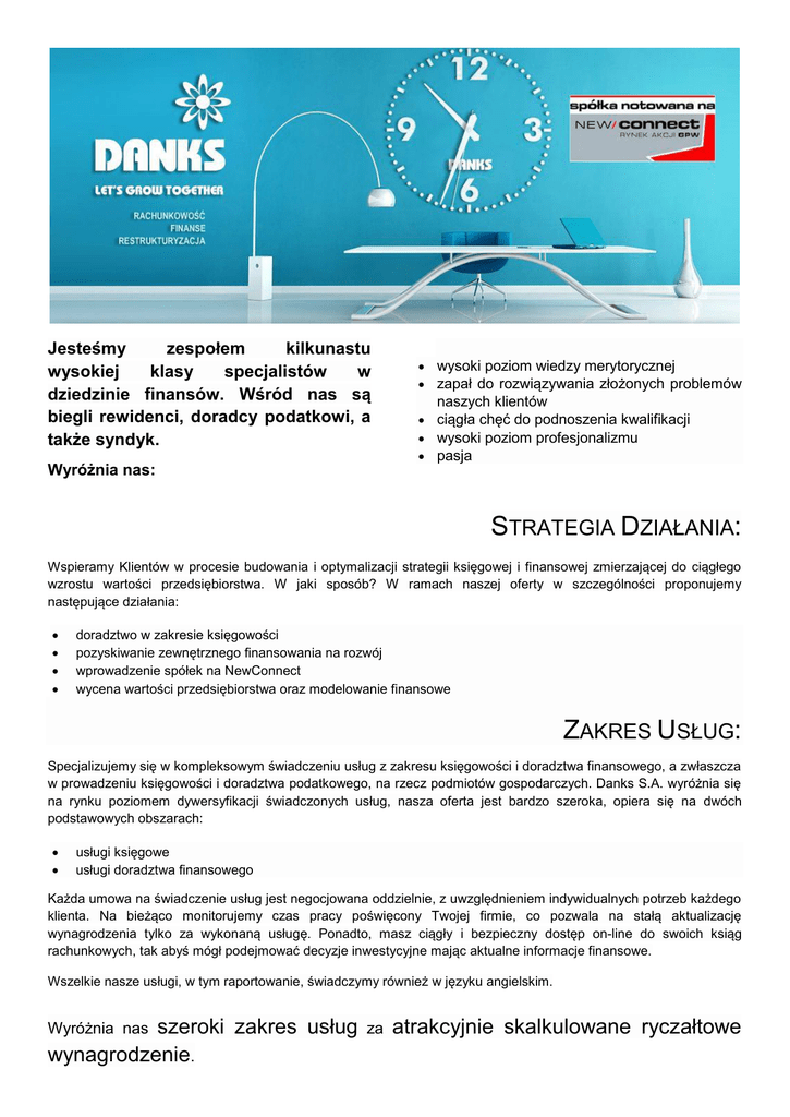 Jesteśmy zespołem kilkunastu wysokiej klasy specjalistów w dziedzinie finansów. Wśród nas są biegli rewidenci, doradcy podatkowi, a także syndyk. Wyróżnia nas:  wysoki poziom wiedzy merytorycznej  zapał do rozwiązywania złożonych problemów naszych klientów  ciągła chęć do podnoszenia kwalifikacji  wysoki poziom profesjonalizmu  pasja STRATEGIA DZIAŁANIA: Wspieramy Klientów w procesie budowania i optymalizacji strategii księgowej i finansowej zmierzającej do ciągłego wzrostu wartości przedsiębiorstwa. W jaki sposób? W ramach naszej oferty w szczególności proponujemy następujące działania:     doradztwo w zakresie księgowości pozyskiwanie zewnętrznego finansowania na rozwój wprowadzenie spółek na NewConnect wycena wartości przedsiębiorstwa oraz modelowanie finansowe ZAKRES USŁUG: Specjalizujemy się w kompleksowym świadczeniu usług z zakresu księgowości i doradztwa finansowego, a zwłaszcza w prowadzeniu księgowości i doradztwa podatkowego, na rzecz podmiotów gospodarczych. Danks S.A. wyróżnia się na rynku poziomem dywersyfikacji świadczonych usług, nasza oferta jest bardzo szeroka, opiera się na dwóch podstawowych obszarach:   usługi księgowe usługi doradztwa finansowego Każda umowa na świadczenie usług jest negocjowana oddzielnie, z uwzględnieniem indywidualnych potrzeb każdego klienta. Na bieżąco monitorujemy czas pracy poświęcony Twojej firmie, co pozwala na stałą aktualizację wynagrodzenia tylko za wykonaną usługę. Ponadto, masz ciągły i bezpieczny dostęp on-line do swoich ksiąg rachunkowych, tak abyś mógł podejmować decyzje inwestycyjne mając aktualne informacje finansowe. Wszelkie nasze usługi, w tym raportowanie, świadczymy również w języku angielskim. szeroki zakres usług wynagrodzenie. Wyróżnia nas za atrakcyjnie skalkulowane ryczałtowe HISTORIA: Spółka działa na rynku od 1993 roku, początkowo jako jednoosobowa działalność gospodarcza, obecnie – spółka akcyjna zatrudniająca niemal 20 os. Dynamiczny rozwój Danks S.A. jest wynikiem konsekwentnego poszerzania oferty i zakresu świadczonych usług. Nieodzownym priorytetem jest podnoszenie poziomu świadczonych usług, dokonuje się to przede wszystkim poprzez wypracowywanie odpowiednich standardów działania, zakup profesjonalnego oprogramowania komputerowego, rozbudowę zespołu specjalistów oraz zdobywanie i podnoszenie kwalifikacji zawodowych personelu. Systematyczne i zdecydowane realizowanie postawionych sobie celów pozwoliło na wprowadzenie Spółki na alternatywny rynek NewConnect. Debiut odbył się 17 maja 2011 roku. Kolejnym krokiem będzie zakwalifikowanie się do segmentu NewConnect Lead, który skupia największe i najbardziej płynne spółki, co planowane jest na 2014 rok. MISJA: Ciągły organiczny rozwój, dzięki któremu możliwy będzie wzrost wartości Danks S.A., a tym samym dostarczenie satysfakcjonujących stóp zwrotu akcjonariuszom. Realizacja misji oparta jest zarówno na zaangażowaniu finansowym Spółki, jak również na merytorycznym wsparciu jej klientów. Oba te czynniki stanowią asystę w osiąganiu celów biznesowych przez naszych klientów. WIZJA: Rozwijamy zakres usług księgowych poprzez pozyskiwanie nowych klientów, jak również dzięki przejmowaniu mniejszych biur rachunkowych wraz z ich klientami. Nasza oferta fuzji jest atrakcyjna dla właścicieli pod względem finansowym, a także ze względu na otwierające się możliwości oferowania wysokich standardów wypracowanych przez Danks S.A., jego know-how, wiedzy oraz specjalistycznych umiejętności jej kadry zarządzającej. Współpracujemy także z biurami pośrednictwa finansowego przy sporządzaniu profesjonalnych biznesplanów, jak również z kancelariami prawnymi przy sporządzaniu dokumentacji finansowej na potrzeby postępowań naprawczych i układowych oraz połączeń, podziałów i przekształceń spółek handlowych. Ponadto, specjalizujemy się w przeprowadzaniu audytu finansowego, którego zasadniczym celem jest sprawdzenie prawidłowości wywiązywania się podatników z ich obowiązków w zakresie rozliczeń podatkowych, a przede wszystkim wskazanie ewentualnych nieprawidłowości i zidentyfikowanie obszarów potencjalnego ryzyka podatkowego, a także przedstawienie sposobów skorygowania tych nieprawidłowości oraz wskazanie działań zmierzających do usunięcia bądź zmniejszenia zidentyfikowanego ryzyka. Przejmujemy biegłych rewidentów z innych firm audytorskich wraz z obsługiwanymi przez nich klientami. PLAN ROZWOJU: Stworzenie odpowiedniego zespołu specjalistów, zapewnienie im odpowiednich warunków pracy i pozyskanie klientów na nowy rodzaj usług. Rozszerzenie zakresu oferowanych usług o:    badanie rocznych sprawozdań finansowych podmiotów gospodarczych pozyskiwanie kapitału inwestycyjnego wprowadzanie spółek na rynek Newconnect Giełdy Papierów Wartościowych w Warszawie Na stworzenie koncepcji i rozpoczęcie świadczenia opisanych powyżej usług Emitent planuje przeznaczyć większość środków pozyskanych dzięki emisji Akcji Serii B. WYNIKI FINANSOWE: W 2010 r. Spółka osiągnęła przychód w wysokości 2.760 tys. zł generując zysk netto w kwocie 1.460 tys. zł, który prawie w całości został wypłacony akcjonariuszom. W 2011 roku planujemy osiągnąć zysk netto również w granicach 1.500 tys. zł i jak w roku ubiegłym w całości przeznaczyć go na dywidendę. Na jedną akcję przypadnie 0,32 zł zysku co dla akcjonariuszy, którzy obejmowali emisję akcji serii B po wartości rynkowej 3 zł, oznacza przeszło 10% zwrotu z kapitału w skali roku. Wszystko wskazuje na to, że przyjęte prognozy co do uzyskanych w 2011 r. przychodów i wypracowanego zysku netto prezentowane w dokumencie informacyjnym, zostaną spełnione. Obrót netto [w tys. zł] 4000 3500 3000 2500 2000 1500 1000 500 0 2007 2008 2009 2010 2011 Od daty debiutu regularnie pozyskujemy nowych klientów, co po