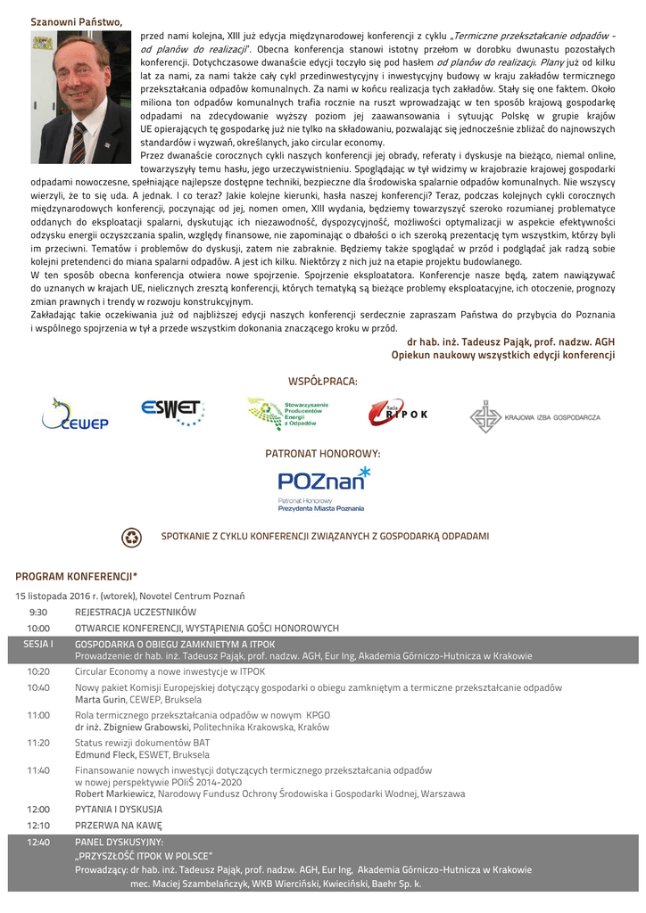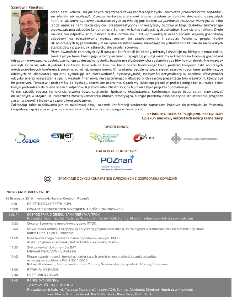 Szanowni Państwo, przed nami kolejna, XIII już edycja międzynarodowej konferencji z cyklu „Termiczne przekształcanie odpadów od planów do realizacji”. Obecna konferencja stanowi istotny przełom w dorobku dwunastu pozostałych konferencji. Dotychczasowe dwanaście edycji toczyło się pod hasłem od planów do realizacji. Plany już od kilku lat za nami, za nami także cały cykl przedinwestycyjny i inwestycyjny inwestycyjny budowy w kraju zakładów termicznego przekształcania odpadów komunalnych. Za nami w końcu realizacja tych zakładów. Stały się one faktem. Około miliona ton odpadów komunalnych trafia rocznie na ruszt wprowadzając w ten sposób krajową gospodarkę odpadami na a zdecydowanie wyższy poziom jej zaawansowania i sytuując Polskę w grupie krajów UE opierających tę gospodarkę już nie tylko na składowaniu, pozwalając się jednocześnie zbliżać do najnowszych standardów i wyzwań, określanych, jako circular economy. Przez dwanaście corocznych cykli naszych konferencji jej obrady, referaty i dyskusje na bieżąco, niemal online, towarzyszyły temu hasłu, jego urzeczywistnieniu. Spoglądając w tył widzimy w krajobrazie krajowej gospodarki odpadami nowoczesne, spełniające najlepsze e dostępne techniki, bezpieczne dla środowiska spalarnie odpadów komunalnych. Nie wszyscy wierzyli, że to się uda. A jednak. I co teraz? Jakie kolejne kierunki, hasła naszej konferencji? Teraz, podczas kolejnych cykli cyk corocznych międzynarodowych konferencji,i, poczynając od jej, nomen omen, XIII wydania, będziemy towarzyszyć szeroko rozumianej problematyce oddanych do eksploatacji spalarni, dyskutując ich niezawodność, dyspozycyjność, możliwości optymalizacji w aspekcie aspekc efektywności odzysku energii oczyszczania ia spalin, względy finansowe, nie zapominając o dbałości o ich szeroką prezentację tym wszystkim, którzy byli im przeciwni. Tematów i problemów do dyskusji, zatem nie zabraknie. Będziemy także spoglądać w przód i podglądać jak radzą sobie so kolejni pretendenci ci do miana spalarni odpadów. A jest ich kilku. Niektórzy z nich już na etapie projektu budowlanego. W ten sposób obecna konferencja otwiera nowe spojrzenie. Spojrzenie eksploatatora. Konferencje nasze będą, zatem nawiązywać do uznanych w krajach UE, nielicznych licznych zresztą konferencji, których tematyką są bieżące problemy eksploatacyjne, ich otoczenie, prognozy zmian prawnych i trendy w rozwoju konstrukcyjnym. Zakładając takie oczekiwania już od najbliższej edycji naszych konferencji serdecznie zapraszam Państwa Pań do przybycia do Poznania i wspólnego spojrzenia w tył a przede wszystkim dokonania znaczącego kroku w przód. drr hab. inż. Tadeusz Pająk, prof. nadzw. AGH Opiekun naukowy wszystkich edycji konferencji WSPÓŁPRACA: PATRONAT HONOROWY: SPOTKANIE Z CYKLU KONFERENCJI ZWIĄZANYCH Z GOSPODARKĄ ODPADAMI PROGRAM KONFERENCJI* 15 listopada 2016 r. (wtorek), Novotel Centrum Poznań 9:30 REJESTRACJA UCZESTNIKÓW 10:00 OTWARCIE KONFERENCJI, WYSTĄPIENIA GOŚCI HONOROWYCH SESJA I GOSPODARKA O OBIEGU ZAMKNIETYM A ITPOK Prowadzenie: dr hab. inż. Tadeusz Pająk, prof. nadzw. AGH, Eur Ing, Akademia Górniczo-Hutnicza Hutnicza w Krakowie 10:20 Circular Economy a nowe inwestycje w ITPOK 10:40 Nowy pakiet Komisji Europejskiej dotyczący gospodarki o obiegu zamkniętym a termiczne przekształcanie odpadów Marta Gurin, CEWEP, Bruksela 11:00 Rola termicznego przekształcania odpadów w nowym KPGO dr inż. Zbigniew Grabowski, Politechnika Krakowska, Kraków 11:20 Status rewizji dokumentów BAT Edmund Fleck, ESWET, Bruksela 11:40 Finansowanie nowych inwestycji dotyczących termicznego przekształcania odpadów w nowej perspektywie POIiŚ 2014-2020 2020 Robert Markiewicz,, Narodowy Fundusz Ochrony Środowiska i Gospodarki Wodnej, Warszawa 12:00 PYTANIA I DYSKUSJA 12:10 PRZERWA NA KAWĘ 12:40 PANEL DYSKUSYJNY: „PRZYSZŁOŚĆ ITPOK W POLSCE” Prowadzący: dr hab. inż. Tadeusz Pająk, prof. nadzw. AGH, Eur Ing, Akademia Górniczo-Hutnicza Hutnicza w Krakowie mec. Maciej Szambelańczyk, WKB Wierciński, Kwieciński, Baehr Sp. k. 13:30 Uczestnicy zaproszeni do panelu: - dr hab. inż. Tadeusz Pająk, prof. nadzw. AGH, Eur Ing, Akademia Górniczo-Hutnicza w Krakowie - Jean-Michel Kaleta, Sita Polska Sp. z o.o. - Maciej Szambelańczyk, WKB Wierciński, Kwieciński, Baehr Sp. k. - Robert Markiewicz, Narodowy Fundusz Ochrony Środowiska i Gospodarki Wodnej, Warszawa - dr inż. Kazimierz Borkowski, PlasticsEurope Polska PYTANIA I DYSKUSJA 13:40 LUNCH SESJA II 14:40 ROZWÓJ TECHNOLOGII WtE Wyspy poligeneracyjne szansą na powstanie instalacji wielopaliwowych w Polsce 15:00 Koszty operacyjne zakładu WtE - niedoceniany aspekt Artur Salamon, Hitachi Zosen INOVA, Zurych 15:10 Technologia wznoszenia bunkra w systemie deskowań ślizgowych podczas realizacji ITPOK w Poznaniu Krzysztof Miller, HOCHTIEF Polska Oddział w Poznaniu 15:20 Oczyszczanie spalin - doświadczenia własne RAFAKO S.A. 15:40 15:50 16:10 dr inż. Jerzy Mirosław, RAFAKO S.A. Doświadczenia w spalaniu RDF w elektrociepłowni w Szwecji przy zastosowaniu zaawansowanych rozwiązań firmy Valmet Roman Szerszeń, Valmet Technologies, Polska Ochrona powietrza w aspekcie spalania odpadów komunalnych – case study dr inż. Monika Wierzbińska, Akademia Techniczno-Humanistyczna w Bielsku-Białej ® SOLVAir - najbardziej wydajna, niezawodna i energetycznie efektywna metoda oczyszczania spalin Grzegorz Swieszek, Solvay Chemicals GmbH Rheinberg 16:25 PYTANIA I DYSKUSJA 16:30 17:00 PRZERWA NA KAWĘ Działania Stowarzyszenia na rzecz rozwoju produkcji energii cieplnej i elektrycznej z odpadów komunalnych Andrzej Drewniak, Stowarzyszenie Producentów Energii z Odpadów 17:20 Zrównoważona gospodarka odpadami: nie ma rozwiązania bez spalania odpadów (przykłady z Niemiec) Frank Paasche, EEW Energy From Waste Polska Konieczność zastosowania układów katalitycznych do obniżenia stęże
