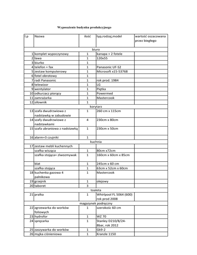 Wyposażenie budynku produkcyjnego l.p Nazwa 1 2 3 4 5 6 7 8 9 10 11 12 komplet wypoczynowy ława biurko telefon + fax zestaw komputerowy fotel obrotowy radi Panasonic telewizor wentylator odkurza z piorą y za rażarka siłow ik 13 szafa dwudrzwiowa z adstawką w za udowie 14 szafy dwudrzwiowe z nadstawkami 15 szafa u ra iowa z adstawką 16 alarm+3 czujniki ilość typ,rodzaj,model biuro 1 kanapa + 2 fotele 1 120x55 1 1 Panasonic UF-S2 1 Microsoft x15-53768 1 1 rok prod. 1984 1 LG 1 Piętka 1 Powermed 1 Mastercook 1 korytarz 1 260 cm x 115cm 4 230cm x 80cm 1 230cm x 50cm 1 kuchnia 17 zestaw mebli kuchennych szafka wiszą a szafka stoją a+ zlwoz ywak blat szafka stoją a 18 kuchenka gazowa 4 palnikowa 19 grzejnik 20 taboret 21 pralka 22 zgrzewarka do worków foliowych 23 hydrofor 24 spręzarka 25 zaszywarka do worków 26 yjka iś ie iowa 1 1 80cm x72cm 160cm x 60cm x 85cm 1 1 1 245cm x 60 cm 63cm x 52cm x 60cm Mastercook 1 3 olejowy toaleta 1 Whirlpool FL 5064 (600) rok prod 2008 agazy ek podrę z y 1 szerokoś 60 1 1 1 1 WZ 70 Stanley D210/8/248bar, rok 2012 Gk9-2 Kranzle 1150 wartość osza owa a przez iegłego 27 28 29 30 31 palnik gazowy wentylator powietrza odżelaza z wody drabina metalowa sprężarka 32 ed arka do zawiązywa ia palet+stojak 33 waga towarowa 34 linia produkcyjna do la szowa ia ryżu i fasoli blanszownik bembnowy za rażarka ę owa rejestrator wózki podnoszone 35 waga elektroniczna 36 wy iągarka 37 wózek paletowy 38 wytwornica pary 39 ko ora hłod i za 40 paleta euro 41 z ięk za z wody 42 pod oś ik 43 kontener samochodowy 44 wózek widłowy 45 46 47 48 wózek paletowy wózek towatowy skrzy iopalety a koła h zbiornik gazu 49 garaż lasza y 1 2 1 1 1 zdemontowany wys. 2 m dwustopniowa Specair, 8 bar, rok 2013 1 1 do 50 kg hala produkcyjna 1 Boema 1 1 1 2 1 1 1 1 1 39 1 do 150 kg 1200 kg Zakrem WW10- Opalenica do zszywarki worków teren posesji 2 12m x 2.5m 1 spalinowo gazowy Mitsubishi KFG 18udzwig 1750 kg 1 1 30 do moczenia fasoli 1 6.5 tys m³ Salinex dzierżawa 1 5m x 3 m