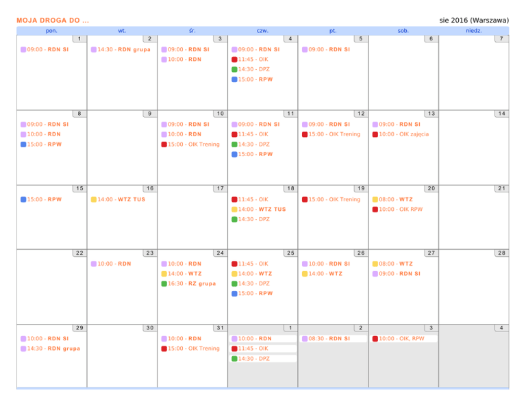 sie 2016 (Warszawa) MOJA DROGA DO ... pon. wt. 1 09:00 - RDN SI śr. 2 14:30 - R D N g r u p a wsparcia 8 09:00 - RDN SI 10 15:00 - R P W coaching @ Batorego, Tychy, Polska 16 23 14:30 - R D N g r u p a wsparcia 12 13 14 18 10:00 - R D N warsztaty r o z15:00 w o j u - OIK Trening asertywności osobistego nowa grupa @ Batorego, Tychy, Polska 15:00 - OIK Trening kreatywności @ Batorego 57, Tychy, Polska 10:00 - RDN SI domowej 21 27 28 3 4 08:00 - W T Z szkolenie z z a 09:00 k r e s u - RDN SI przygot. zawod. 14:00 - W T Z szkolenie z zakresu przygot. zawod. 2 08:30 - RDN SI 20 08:00 - W T Z szkolenie z z a 10:00 k r e s u - OIK RPW zajęcia przygot. sportowe zawod. 26 1 10:00 - R D N psychotera p i a11:45 i n d . - OIK Pradnictwo 14:30 - DPZ prawne dla Poradnictwo kobiet po prawne dla doświadczen Rodzin iach zastępczych przemocy 10:00 - OIK zajęcia sportowe 19 25 31 09:00 - RDN SI 15:00 - OIK Trening kreatywności @ Batorego 57, Tychy, Polska 11:45 - OIK Pradnictwo 14:00dla - WTZ prawne szkolenie kobiet po z zdoświadczen a 14:30 k r e s u - DPZ Poradnictwo p r z15:00 y g o t .- R P W iach prawne zprzemocy a w o d . dla@ coaching Rodzin B atorego, domowej zastępczych Tychy, Polska zawod. 10:00 - RDN SI 11:45 - OIK Pradnictwo 14:30dla - DPZ prawne Poradnictwo kobiet po- R P W 15:00 prawne dla doświadczen coaching @ Rodzin iach B atorego, zastępczych przemocy Tychy, domowej Polska 24 10:00 - R D N warsztaty r o z14:00 w o j u- W T Z szkolenie z osobistego z a 16:30 kresu- RZ grupa w s p a r c i a przygot. 30 7 09:00 - RDN SI 11:45 - OIK Pradnictwo 14:00dla - WTZ TUS prawne kobiet po 14:30 - DPZ doświadczen Poradnictwo iach prawne dla przemocy Rodzin domowej zastępczych 10:00 - R D N warsztaty rozwoju osobistego 29 11 17 14:00 - W T Z T U S 22 niedz. 6 09:00 - RDN SI 09:00 - RDN SI 10:00 - R D N warsztaty r o z15:00 w o j u - OIK Trening asertywności osobistego nowa grupa @ Batorego 57, Tychy, Polska 15 sob. 5 11:45 - OIK Pradnictwo 14:30dla - DPZ prawne Poradnictwo kobiet po- R P W 15:00 prawne dla doświadczen coaching @ Rodzin iach B a t o r e g o zastępczych przemocy 5 7, Tychy, domowej Polska 09:00 - RDN SI 10:00 - R D N psychotera p i a15:00 ind. - RPW coaching pt. 4 09:00 - RDN SI 10:00 - R D N warsztaty rozwoju osobistego 9 09:00 - RDN SI czw. 3 10:00 - OIK, RPW zajęcia sportowe wrz 2016 (Warszawa) MOJA DROGA DO ... pon. wt. 29 śr. 30 10:00 - RDN SI 14:30 - R D N g r u p a wsparcia 5 08:30 - RDN SI 6 14:30 - R D N g r u p a wsparcia 10:00 - R D N psychotera p i a15:00 ind. - RPW coaching @ Batorego, Tychy, Polska 12 14 20 21 27 domowej 08:00 - W T Z T U S 08:30 - RDN SI 11:45 - OIK Pradnictwo 14:30dla - DPZ prawne Poradnictwo kobiet po- R P W 15:00 prawne dla doświadczen COACHING Rodzin iach @ Batorego zastępczych przemocy 5 7, Tychy, domowej Polska 11:45 - OIK Pradnictwo 14:30dla - DPZ prawne Poradnictwo kobiet po- R P W 15:00 prawne dla doświadczen coaching Rodzin iach zastępczych przemocy domowej 9 14:00 - W T Z szkolenie z z a 15:00 k r e s u - OIK Trening kreatywności przygot. @ Batorego zaw od. 57, Tychy, Polska 10 11 08:00 - W T Z szkolenie z z a 10:00 k r e s u - RDN zajęcia rekreacyjnoprzygot. sportowe zawod. 16 15:00 - OIK Trening kreatywności @ Batorego 57, Tychy, Polska 22 4 10:00 - OIK, RPW zajęcia sportowe 8 15 niedz. 3 17 18 24 25 1 2 10:00 - OIK, RPW zajęcia sportowe 23 09:00 - W T Z T U S 10:00 - R D N psychotera p i a11:45 i n d . - OIK Pradnictwo 14:30dla - DPZ prawne Poradnictwo kobiet po 15:00dla - RPW prawne doświadczen coaching Rodzin iach zastępczych przemocy 28 10:00 - R D N warsztaty rozwoju osobistego sob. 2 08:30 - RDN SI 10:00 - R D N warsztaty r o z14:00 w o j u- W T Z szkolenie osobistegoz zakresu przygot. zawod. 26 10:00 - R D N psychotera p i a11:45 i n d . - OIK Pradnictwo 14:30 - DPZ prawne dla Poradnictwo kobiet po prawne dla doświadczen Rodzin iach zastępczych przemocy 08:30 - RDN SI 08:30 - RDN SI zawod. pt. 1 08:30 - RDN SI 10:00 - R D N warsztaty r o z14:00 w o j u- W T Z szkolenie osobistegoz zakresu przygot. zawod. 10:00 - R D N konsultacje 14:00 - W T Z neuropsych szkolenie z o l o16:30 ga zakresu- RZ grupa e pd r zuykgaocty. j n a 14:00 - W T Z szkolenie z z a 15:00 kresu- R P W coaching przygot. zawod. 10:00 - R D N warsztaty r o z14:00 w o j u- W T Z szkolenie osobistegoz zakresu przygot. zawod. 08:30 - RDN SI 10:00 - R D N konsultacje 15:00 - R P W neuropsych coaching o l o15:30 ga - RPW grupa edukacyjna @ Batorego, Tychy, 19 Polska 08:30 - RDN SI 08:30 - RDN SI 10:00 - R D N warsztaty r o z15:00 w o j u - OIK Trening asertywności osobistego nowa grupa @ Batorego, Tychy, Polska 7 13 08:30 - RDN SI czw. 31 domowej 29 11:45 - OIK Pradnictwo 14:30dla - DPZ prawne Poradnictwo kobiet po 14:30dla - RDN grupa prawne doświadczen w sparcia Rodzin 15:00 - R P W iach zastępczych coaching przemocy domowej 30 14:00 - WTZ usługi aktywnej 15:00 - na RDN integracji s potkanie rzecz irodziców ntegracy i jn e rodzin opiekunów