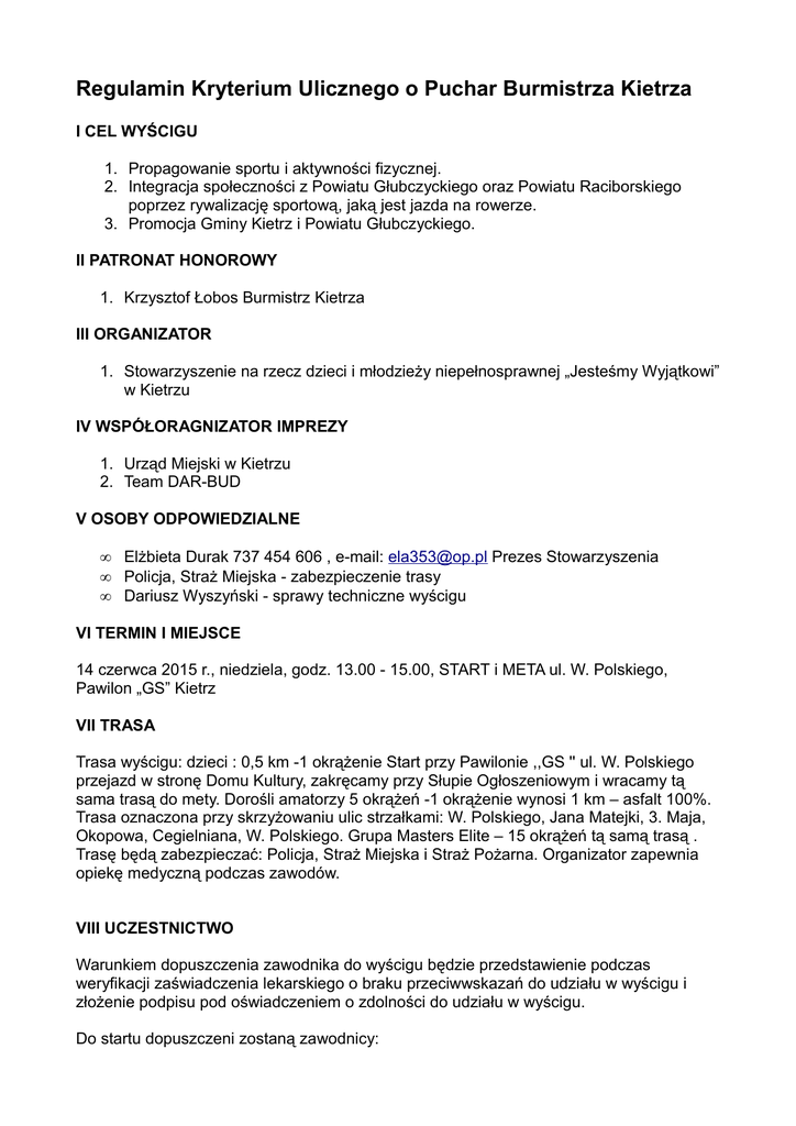 Regulamin Kryterium Ulicznego o Puchar Burmistrza Kietrza I CEL WYŚCIGU 1. Propagowanie sportu i aktywności fizycznej. 2. Integracja społeczności z Powiatu Głubczyckiego oraz Powiatu Raciborskiego poprzez rywalizację sportową, jaką jest jazda na rowerze. 3. Promocja Gminy Kietrz i Powiatu Głubczyckiego. II PATRONAT HONOROWY 1. Krzysztof Łobos Burmistrz Kietrza III ORGANIZATOR 1. Stowarzyszenie na rzecz dzieci i młodzieży niepełnosprawnej „Jesteśmy Wyjątkowi” w Kietrzu IV WSPÓŁORAGNIZATOR IMPREZY 1. Urząd Miejski w Kietrzu 2. Team DAR-BUD V OSOBY ODPOWIEDZIALNE • • • Elżbieta Durak 737 454 606 , e-mail: [email protected] Prezes Stowarzyszenia Policja, Straż Miejska - zabezpieczenie trasy Dariusz Wyszyński - sprawy techniczne wyścigu VI TERMIN I MIEJSCE 14 czerwca 2015 r., niedziela, godz. 13.00 - 15.00, START i META ul. W. Polskiego, Pawilon „GS” Kietrz VII TRASA Trasa wyścigu: dzieci : 0,5 km -1 okrążenie Start przy Pawilonie ,,GS '' ul. W. Polskiego przejazd w stronę Domu Kultury, zakręcamy przy Słupie Ogłoszeniowym i wracamy tą sama trasą do mety. Dorośli amatorzy 5 okrążeń -1 okrążenie wynosi 1 km – asfalt 100%. Trasa oznaczona przy skrzyżowaniu ulic strzałkami: W. Polskiego, Jana Matejki, 3. Maja, Okopowa, Cegielniana, W. Polskiego. Grupa Masters Elite – 15 okrążeń tą samą trasą . Trasę będą zabezpieczać: Policja, Straż Miejska i Straż Pożarna. Organizator zapewnia opiekę medyczną podczas zawodów. VIII UCZESTNICTWO Warunkiem dopuszczenia zawodnika do wyścigu będzie przedstawienie podczas weryfikacji zaświadczenia lekarskiego o braku przeciwwskazań do udziału w wyścigu i złożenie podpisu pod oświadczeniem o zdolności do udziału w wyścigu. Do startu dopuszczeni zostaną zawodnicy: • • • • dzieci w wieku szkolnym - klasy 1-3 za zgodą opiekuna dzieci w wieku szkolnym - klasy 4-6 za zgodą opiekuna młodzież gimnazjalna i liceum za zgodą opiekuna dorośli – osoby pełnoletnie VII ZGŁOSZENIA • • Zgłoszenia będą przyjmowane poprzez otwartą grupę Stowarzyszenia na Facebooku, którą można znaleźć pod nazwą Stowarzyszenie „Jesteśmy Wyjątkowi” W dniu zawodów 14.06.2015 r. od godz. 10.00 do 12.00 w biurze zawodów przy ul. W. Polskiego, przy Pawilonie „GS” VIII LIMIT ZAWODNIKÓW 1. Organizator wprowadza ograniczony limit rowerzystów. O udziale decyduje data zapisu. 2. Warunkiem znalezienia się na liście startowej jest wypełnienie i wysłanie formularza zgłoszeniowego IX KLASYFIKACJE I PRZEWIDZIANE NAGRODY • • dzieci – nagrody rzeczowe, dyplomy, puchary osoby dorosłe – amatorzy. dyplomy, puchary, nagrody pieniężne, rzeczowe X BIURO ZAWODÓW Biuro zawodów w namiocie przy ul. W. Polskiego będzie czynne od 10.00, tu nastąpi weryfikacja uczestników. Podczas weryfikacji zawodnicy muszą posiadać dokument tożsamości (dowód osobisty lub paszport, legitymacja szkolna). Podczas weryfikacji nastąpi wydawanie numerów startowych. Pobranie numeru startowego przez zawodnika jest równoznaczne z akceptacją regulaminu wyścigu. XII OPŁATA STARTOWA Brak opłaty startowej. XIII UWAGI ORGANIZATORÓW 1. Zastrzegamy sobie prawo zmian w regulaminie 2. Wyścig odbędzie się bez względu na pogodę, przy ograniczonym ruchu ulicznym – trasa zamknięta 3. Pobyt i przyjazd zawodników na koszt własny 4. Każdy zawodnik ma obowiązek zapoznać się z regulaminem wyścigu i jest zobowiązany do jego przestrzegania 5. Zdjęcia wykonywane podczas imprezy mogą być wykorzystane w materiałach reklamowych wyścigu (komunikat końcowy, plakat, informacje prasowe) 6. Ogłoszenie wyników i rozdanie nagród około godz. 15.00 7. Uczestnik startuje wyłącznie na własną odpowiedzialność i ponosi związane z tym ryzyko. Każdy uczestnik musi posiadać kask rowerowy 8. Wszyscy uczestnicy przyjmują do wiadomości, że udział w zawodach wiąże się z wysiłkiem fizycznym i pociąga za sobą naturalne ryzyko i zagrożenie wypadkami, możliwości odniesienia obrażeń ciała i urazów fizycznych (w tym śmierci), a także szkód i strat o charakterze majątkowym. 9. Trasa jest przystosowana do udziału osób niepełnosprawnych poruszających się na rowerkach trójkołowych. Wszelkich informacji udziela: Prezes Stowarzyszenia Elżbieta Durak, tel.: 737 454 606, e-mail: [email protected]