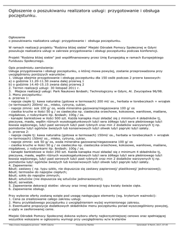 Ogłoszenie o poszukiwaniu realizatora usługi: przygotowanie i obsługa poczęstunku. Ogłoszenie o poszukiwaniu realizatora usługi: przygotowanie i obsługa poczęstunku. W ramach realizacji projektu "Rodzina bliżej siebie" Miejski Ośrodek Pomocy Społecznej w Gdyni poszukuje realizatora usługi w zakresie przygotowania i obsługi poczęstunku podczas konferencji. Projekt "Rodzina bliżej siebie" jest współfinansowany przez Unię Europejską w ramach Europejskiego Funduszu Społecznego. Opis przedmiotu zamówienia: Usługa przygotowania i obsługi poczęstunku, o której mowa powyżej, zostanie przeprowadzona przy uwzględnieniu poniższych warunków: 1. Usługa obejmie przygotowanie i obsługę poczęstunku dla 150 osób podczas 2 przerw kawowych: a) o godzinie 11.20-11.50 zwana dalej przerwą 1 b) o godzinie 14.40-15.15 zwana dalej przerwą 2 2. Termin realizacji usługi: 30 listopad 2011 r. 3. Miejsce realizacji usługi: Park Naukowo – Technologiczny w Gdyni, Al. Zwycięstwa 96/98. 3. Menu poczęstunku: a. przerwa 1: - napoje ciepłe tj: kawa naturalna (gotowa w termosach) 200 ml/ os., herbata w torebeczkach + wrzątek (w termosach) 200ml/ os., mleko, cytryna, cukier, - napoje zimne: sok 100 g/ os, woda mineralna gazowana/niegazowana 100 g/ os - ciastka kruche w ilości 50 g / os ciasteczka np. ciasteczka orzechowe, kokosowe, waniliowe, maślane, migdałowe, z rodzynkami itp. – 100g / os. - kanapki bankietowe w ilości 500 szt. Każda kanapka musi składać się z minimum 4 składników tj, pieczywa, masła, wędlin różnych wysokogatunkowych lub/i sera żółtego lub/i sera pleśniowego lub/i łososia wędzonego, lub/i past serowych lub/i past rybnych oraz min 2 dodatków warzywnych tj np. pomidorów lub/i ogórków świeżych lub konserwowych lub/i oliwek lub/i papryki lub/i sałaty. b. przerwa 2: - napoje ciepłe tj: kawa naturalna (gotowa w termosach) 150ml/ os., herbata w torebeczkach + wrzątek (w termosach) 150ml/ os., mleko, cytryna, cukier, - napoje zimne: sok 50 g/ os, woda mineralna gazowana/niegazowana 100 g/ os - ciastka kruche w ilości 50 g / os ciasteczka np. ciasteczka orzechowe, kokosowe, waniliowe, maślane, migdałowe, z rodzynkami itp. – 100g / os. - kanapki bankietowe w ilości 250 szt. Każda kanapka musi składać się z minimum 4 składników tj, pieczywa, masła, wędlin różnych wysokogatunkowych lub/i sera żółtego lub/i sera pleśniowego lub/i łososia wędzonego, lub/i past serowych lub/i past rybnych oraz min 2 dodatków warzywnych tj np. pomidorów lub/i ogórków świeżych lub konserwowych lub/i oliwek lub/i papryki lub/i sałaty. 4. Zapewnienie: • zastawy ( np. typu szkło, nie dopuszcza się zastawy papierowej/ plastikowej/ jednorazowej); • termosów do napojów ciepłych; • szkło do napojów zimnych; • sztućców (nie dopuszcza się sztućców jednorazowych); • serwetek. 5. Zapewnienie dekoracji stołów: obrusy oraz innej dekoracji typu kwiaty świeże cięte. 6. Zapewnienie obsługi. Przy wyborze oferty zostaną wzięte pod uwagę następujące elementy (wg. kryterium ważności): 1. Cena za zrealizowanie całego zakresu usługi. 2. Menu przykładowego poczęstunku z uwzględnieniem wyżej wymienionego zakresu. 3. Ewentualne propozycje dodatkowych składników menu poczęstunku ponad wyszczególniony powyżej, a ujęty w zaoferowanej cenie. Miejski Ośrodek Pomocy Społecznej dokona wyboru oferty najkorzystniejszej cenowo oraz spełniającej wszystkie wskazane w ogłoszeniu wymogi przy uwzględnieniu w/w kryteriów http://www.mopsgdynia.pl/www - MOPS Gdynia Powered by Mambo Generated: 8 March, 2017, 07:49 MOPS zastrzega sobie możliwość: a) negocjacji zaproponowanych przez wykonawców cen; b) unieważnienia niniejszego ogłoszenia, w szczególności gdy na realizację danej usługi nie pozyska środków finansowych. zamawiający Oferty zawierające cenę usługi można składać do dnia 16.11.2011 r. do godziny 12:00 drogą elektroniczną na adres: [email protected] lub osobiście w siedzibie MOPS w Gdyni, ul. Grabowo 2, pok.31. Osoba do kontaktu: Dorota Nawała tel. (0-58) 782 02 32. http://www.mopsgdynia.pl/www - MOPS Gdynia Powered by Mambo Generated: 8 March, 2017, 07:49