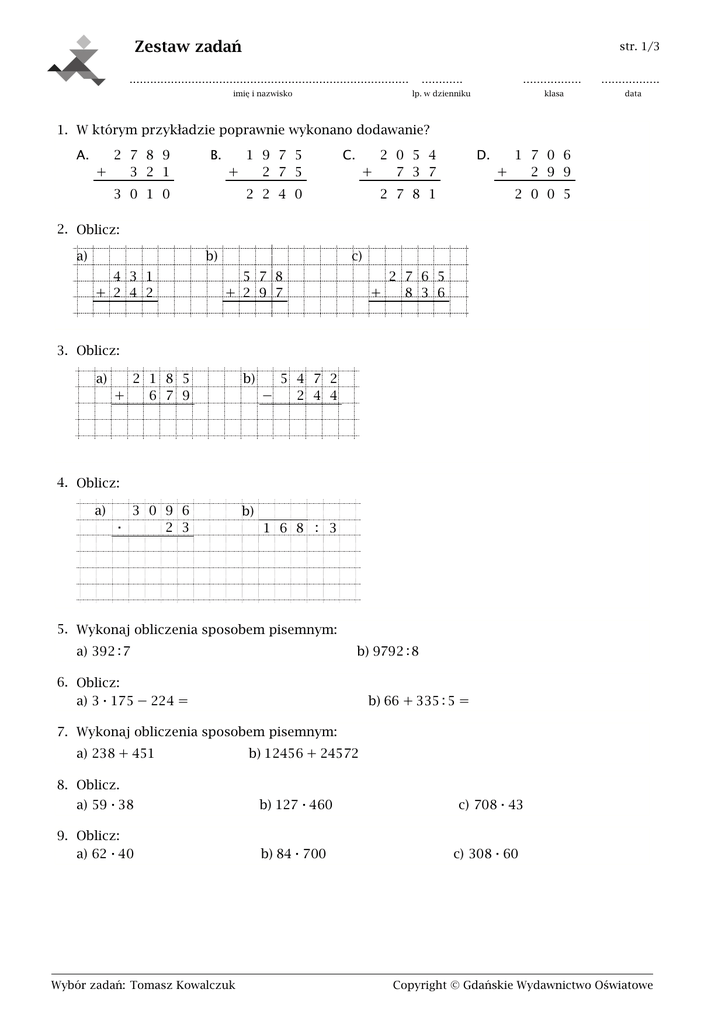 Zestaw zadań str. 1/3 ............ ................. lp. w dzienniku klasa ................................................................................. imię i nazwisko ................. data 1. W którym przykładzie poprawnie wykonano dodawanie? A. 2 7 8 9 + 3 2 1 B. 3 0 1 0 1 9 7 5 + 2 7 5 C. 2 0 5 4 + 7 3 7 2 2 4 0 D. 2 7 8 1 1 7 0 6 + 2 9 9 2 0 0 5 2. Oblicz: a) b) 4 3 1 + 2 4 2 c) 5 7 8 + 2 9 7 2 7 6 5 + 8 3 6 3. Oblicz: a) 2 1 8 5 + 6 7 9 b) 5 4 7 2 − 2 4 4 4. Oblicz: a) 3 0 9 6 ⋅ 2 3 b) 1 6 8 : 3 5. Wykonaj obliczenia sposobem pisemnym: a) 392 : 7 b) 9792 : 8 6. Oblicz: a) 3 ⋅ 175 − 224 = b) 66 + 335 : 5 = 7. Wykonaj obliczenia sposobem pisemnym: a) 238 + 451 b) 12456 + 24572 8. Oblicz. a) 59 ⋅ 38 9. Oblicz: a) 62 ⋅ 40 b) 127 ⋅ 460 b) 84 ⋅ 700 Wybór zadań: Tomasz Kowalczuk 107684 c) 708 ⋅ 43 c) 308 ⋅ 60 Copyright © Gdańskie Wydawnictwo Oświatowe Astr. 2/3 10. Oblicz: a) 615 ⋅ 80 b) 4600 ⋅ 90 11. Iloczyn liczb 50 i 6100 jest równy: A. 30 500 B. 3 050 000 C. 305 000 D. 3050 12. 18 godzin to: A. 180 minut B. 170 minut C. 1080 minut D. 680 minut 13. Oblicz sposobem pisemnym: 429 ⋅ 3. 14. Oblicz sposobem pisemnym: a) 5348 + 957 b) 2538 + 297 + 76 15. Liczbę 585 powiększ o 378. 16. Państwo Kowalscy kupili na raty pralkę za 1380 zł i lodówkę za 1410 zł. Łączną kwotę za te zakupy rozłożono im na 6 równych rat. Ile wynosiła jedna rata? 17. Czternaście ciężarówek przewoziło towar przez 6 dni w tygodniu. W ciągu jednego dnia każda ciężarówka przewoziła 29 ton towaru. Ile ton towaru przewiozły wszystkie ciężarówki w ciągu jednego tygodnia? 18. Hurtownia zamówiła 1546 kg warzyw, które dostarczono w ciągu 3 dni. Pierwszego dnia przywieziono 429 kg, drugiego – 726 kg. Ile kilogramów warzyw przywieziono trzeciego dnia? 19. Oblicz sposobem pisemnym: a) 7586 − 5354 b) 1075 − 767 c) 4004 − 115 20. Mama wypatrzyła dla swoich trojaczków kurtki po 136 zł. Zdecydowała, że kupi je trochę później. Gdy po dwóch tygodniach przyszła do sklepu, okazało się, że te kurtki są po 99 zł. Ile złotych zaoszczędziła mama, kupując kurtki po dwóch tygodniach? 21. Która różnica jest największa? A. 1723 − 489 B. 7721 − 6481 C. 1257 − 19 D. 1836 − 599 22. Pani Zofia kupiła książkę za 47 zł i pióro za 128 zł. Zapłaciła za zakupy banknotem o nominale 200 zł. Ile reszty powinna otrzymać? 23. Pan Kowalski zarabia miesięcznie 3472 zł. Ile pieniędzy zarobił przez pół roku? 24. Uczniowie wybrali się na wycieczkę, w której programie było zwiedzanie muzeum oraz przedstawienie w teatrze. Organizator wycieczki zebrał 2732 zł i zakupił bilety do muzeum i do teatru dla wszystkich uczestników. Pozostała kwota 1287 zł pokryła koszty wynajęcia autokaru. Bilety do muzeum kosztowały łącznie o 706 zł mniej niż wynosiła opłata za autokar. Ile kosztowały bilety do teatru, a ile – bilety do muzeum? Zapisz obliczenia. Wybór zadań: Tomasz Kowalczuk 107684 Copyright © Gdańskie Wydawnictwo Oświatowe Astr. 3/3 25. W kinie „Ballada” bilety normalne były w cenie 19 zł, a bilety ulgowe o 4 zł tańsze. W czwartek sprzedano 105 biletów normalnych i cztery razy tyle biletów ulgowych. Ile pieniędzy wpłynęło do kasy kina tego dnia? Wiedząc, że w kinie są 742 miejsca, oblicz, ile najwięcej pieniędzy mogłoby jeszcze zarobić kino, gdyby wszystkie miejsca były zajęte? 26. W sklepie Grafit jeden ołówek kosztuje 75 groszy, a zestaw składający się z pięciu takich ołówków — 4 zł. Pani Ala ma kupić 24 ołówki. Ile zapłaci, jeśli skorzysta z najtańszej opcji? O ile więcej kosztowałyby ołówki, gdyby kupiła je na sztuki? 27. Pani Zofia kupiła do swojego sklepiku 14 kubków i 6 półmisków. Za wszystko zapłaciła 300 zł. Gdyby kupiła tylko kubki, ale za tę samą kwotę, to wystarczyłoby jej pieniędzy aż na 25 kubków. Ile kosztował jeden kubek, a ile – półmisek? 28. Siedemnaście jednakowych skrzynek z wiśniami waży razem 306 kg. W każdej skrzynce jest 16 kg wiśni. Ile waży pusta skrzynka? 29. Rodzice Ani i Wojtka kupili namiot za 666 zł, dwa materace po 59 zł, jeden materac za 83 zł i cztery śpiwory po 39 zł. Ile zapłacili za te zakupy? Wybór zadań: Tomasz Kowalczuk 107684 Copyright © Gdańskie Wydawnictwo Oświatowe