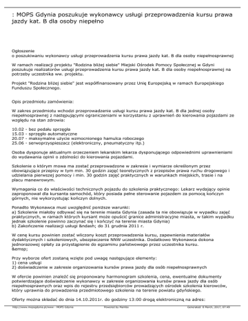 : MOPS Gdynia poszukuje wykonawcy usługi przeprowadzenia kursu prawa jazdy kat. B dla osoby niepełno Ogłoszenie o poszukiwaniu wykonawcy usługi przeprowadzenia kursu prawa jazdy kat. B dla osoby niepełnosprawnej W ramach realizacji projektu "Rodzina bliżej siebie" Miejski Ośrodek Pomocy Społecznej w Gdyni poszukuje realizatorów usługi przeprowadzenia kursu prawa jazdy kat. B dla osoby niepełnosprawnej na potrzeby uczestnika ww. projektu. Projekt "Rodzina bliżej siebie" jest współfinansowany przez Unię Europejską w ramach Europejskiego Funduszu Społecznego. Opis przedmiotu zamówienia: W zakres przedmiotu wchodzi przeprowadzenie usługi kursu prawa jazdy kat. B dla jednej osoby niepełnosprawnej z następującymi ograniczeniami w korzystaniu z uprawnień do kierowania pojazdami ze względu na stan zdrowia: 10.02 15.03 20.07 25.06 - bez pedału sprzęgła sprzęgło automatyczne maksymalne użycie wzmocnionego hamulca roboczego serwoprzyspieszacz (elektroniczny, pneumatyczny itp.) Osoba dysponuje aktualnym orzeczeniem lekarskim lekarza dysponującego odpowiednimi uprawnieniami do wydawania opinii o zdolności do kierowania pojazdami. Szkolenie o którym mowa ma zostać przeprowadzone w zakresie i wymiarze określonym przez obowiązujące przepisy w tym min. 30 godzin zajęć teoretycznych z przepisów prawa ruchu drogowego i udzielania pierwszej pomocy i min. 30 godzin zajęć praktycznych w warunkach miejskich, trasie i na placu manewrowym. Wymagania co do właściwości technicznych pojazdu do szkolenia praktycznego: Lekarz wydający opinie zaproponował dla kursanta samochód, który posiada pełne sterowanie pojazdem za pomocą kończyn górnych, nie wykorzystując kończyn dolnych. Ponadto Wykonawca musi uwzględnić poniższe warunki: a) Szkolenie miałoby odbywać się na terenie miasta Gdynia (zasada ta nie obowiązuje w wypadku zajęć praktycznych, w ramach których kursant może opuścić granice administracyjne miasta, w takim wypadku jednak szkolenie powinno zaczynać się i kończyć na terenie miasta Gdynia) b) Zakończenie realizacji usługi – do 31 grudnia 2011 r. W cenę kursu powinien zostać wliczony koszt przeprowadzenia kursu, zapewnienia materiałów dydaktycznych i szkoleniowych, ubezpieczenie NNW uczestnika. Dodatkowo Wykonawca dokona jednorazowej opłaty za przystąpienie do egzaminu państwowego przez uczestnika kursu.   Przy wyborze ofert zostaną wzięte pod uwagę następujące elementy: 1) cena usługi 2) doświadczenie w zakresie organizowania kursów prawa jazdy dla osób niepełnosprawnych W ofercie powinien znaleźć się proponowany harmonogram szkolenia, cena, ewentualne dokumenty potwierdzające doświadczenie wykonawcy w zakresie organizowania kursów prawa jazdy dla osób niepełnosprawnych oraz wpis do rejestru przedsiębiorców prowadzących ośrodek szkolenia kierowców, który uprawnia do prowadzenia przedmiotowego szkolenia na terenie powiatu gdyńskiego. Oferty można składać do dnia 14.10.2011r. do godziny 13:00 drogą elektroniczną na adres: http://www.mopsgdynia.pl/www - MOPS Gdynia Powered by Mambo Generated: 8 March, 2017, 07:49 [email protected] lub osobiście w Biurze projektu „Rodzina bliżej siebie” w Gdyni przy ul. Świętojańskiej 57/1 Osoba do kontaktu: Tomasz Łoś tel. (0-58) 627-85-05; +48-785-101-303 http://www.mopsgdynia.pl/www - MOPS Gdynia Powered by Mambo Generated: 8 March, 2017, 07:49