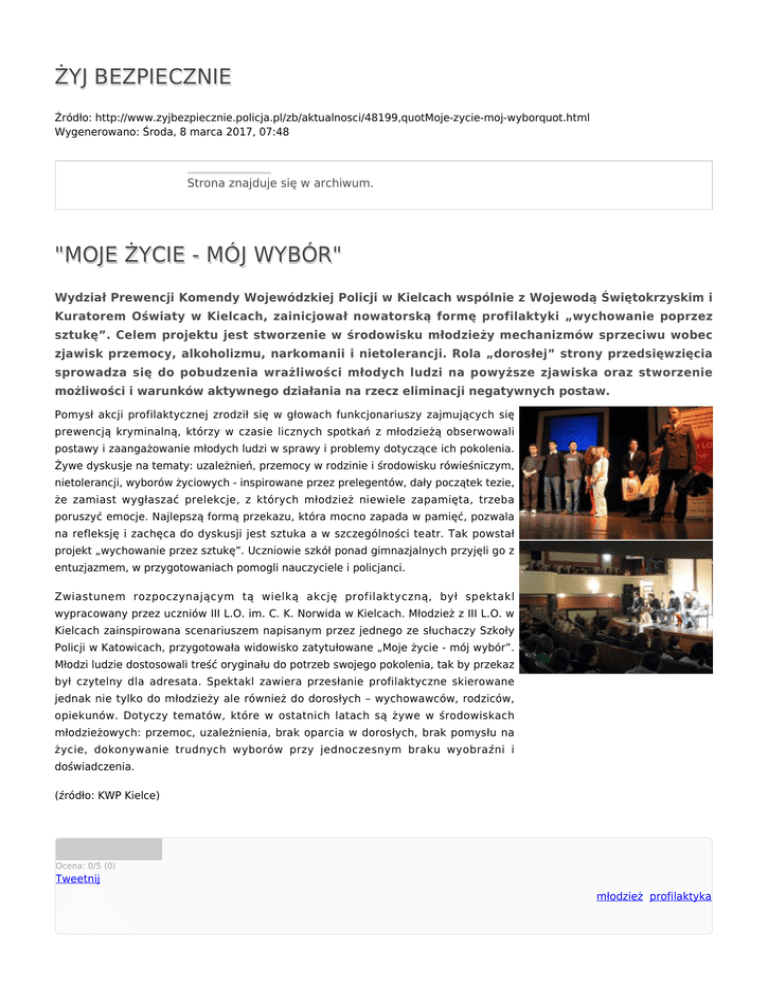 ŻYJ BEZPIECZNIE Źródło: http://www.zyjbezpiecznie.policja.pl/zb/aktualnosci/48199,quotMoje-zycie-moj-wyborquot.html Wygenerowano: Środa, 8 marca 2017, 07:48 Strona znajduje się w archiwum. "MOJE ŻYCIE - MÓJ WYBÓR" Wydział Prewencji Komendy Wojewódzkiej Policji w Kielcach wspólnie z Wojewodą Świętokrzyskim i Kuratorem Oświaty w Kielcach, zainicjował nowatorską formę profilaktyki „wychowanie poprzez sztukę”. Celem projektu jest stworzenie w środowisku młodzieży mechanizmów sprzeciwu wobec zjawisk przemocy, alkoholizmu, narkomanii i nietolerancji. Rola „dorosłej” strony przedsięwzięcia sprowadza się do pobudzenia wrażliwości młodych ludzi na powyższe zjawiska oraz stworzenie możliwości i warunków aktywnego działania na rzecz eliminacji negatywnych postaw. Pomysł akcji profilaktycznej zrodził się w głowach funkcjonariuszy zajmujących się prewencją kryminalną, którzy w czasie licznych spotkań z młodzieżą obserwowali postawy i zaangażowanie młodych ludzi w sprawy i problemy dotyczące ich pokolenia. Żywe dyskusje na tematy: uzależnień, przemocy w rodzinie i środowisku rówieśniczym, nietolerancji, wyborów życiowych - inspirowane przez prelegentów, dały początek tezie, że zamiast wygłaszać prelekcje, z których młodzież niewiele zapamięta, trzeba poruszyć emocje. Najlepszą formą przekazu, która mocno zapada w pamięć, pozwala na refleksję i zachęca do dyskusji jest sztuka a w szczególności teatr. Tak powstał projekt „wychowanie przez sztukę”. Uczniowie szkół ponad gimnazjalnych przyjęli go z entuzjazmem, w przygotowaniach pomogli nauczyciele i policjanci. Zwiastunem rozpoczynającym tą wielką akcję profilaktyczną, był spektakl wypracowany przez uczniów III L.O. im. C. K. Norwida w Kielcach. Młodzież z III L.O. w Kielcach zainspirowana scenariuszem napisanym przez jednego ze słuchaczy Szkoły Policji w Katowicach, przygotowała widowisko zatytułowane „Moje życie - mój wybór”. Młodzi ludzie dostosowali treść oryginału do potrzeb swojego pokolenia, tak by przekaz był czytelny dla adresata. Spektakl zawiera przesłanie profilaktyczne skierowane jednak nie tylko do młodzieży ale również do dorosłych – wychowawców, rodziców, opiekunów. Dotyczy tematów, które w ostatnich latach są żywe w środowiskach młodzieżowych: przemoc, uzależnienia, brak oparcia w dorosłych, brak pomysłu na życie, dokonywanie trudnych wyborów przy jednoczesnym braku wyobraźni i doświadczenia. (źródło: KWP Kielce) Ocena: 0/5 (0) Tweetnij młodzież, profilaktyka