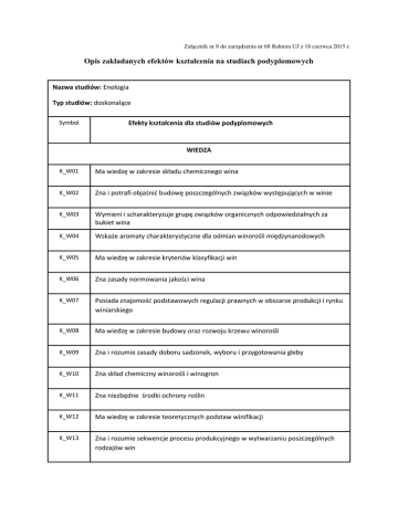 Załącznik nr 8 do zarządzenia nr 68 Rektora UJ z 18 czerwca 2015 r. Opis zakładanych efektów kształcenia na studiach podyplomowych Nazwa studiów: Enologia Typ studiów: doskonalące Symbol Efekty kształcenia dla studiów podyplomowych WIEDZA K_W01 Ma wiedzę w zakresie składu chemicznego wina K_W02 Zna i potrafi objaśnić budowę poszczególnych związków występujących w winie K_W03 Wymieni i scharakteryzuje grupę związków organicznych odpowiedzialnych za bukiet wina K_W04 Wskaże aromaty charakterystyczne dla odmian winorośli międzynarodowych K_W05 Ma wiedzę w zakresie kryteriów klasyfikacji win K_W06 Zna zasady normowania jakości wina K_W07 Posiada znajomość podstawowych regulacji prawnych w obszarze produkcji i rynku winiarskiego K_W08 Ma wiedzę w zakresie budowy oraz rozwoju krzewu winorośli K_W09 Zna i rozumie zasady doboru sadzonek, wyboru i przygotowania gleby K_W10 Zna skład chemiczny winorośli i winogron K_W11 Zna niezbędne środki ochrony roślin K_W12 Ma wiedzę w zakresie teoretycznych podstaw winifikacji K_W13 Zna i rozumie sekwencje procesu produkcyjnego w wytwarzaniu poszczególnych rodzajów win K_W14 Zna definicje i charakterystykę poszczególnych rodzajów fermentacji K_W15 Zna i rozumie znaczenie drożdży i czynników wpływających na jakość wina K_W16 Ma wiedzę w zakresie wpływu składników wina na zdrowie K_W17 Zna i rozumie zagrożenia związane z konsumpcją win K_W18 Zdefiniuje i objaśni zjawisko tzw. francuskiego paradoksu K_W19 Scharakteryzuje i wymieni związki z grupy polifenoli oraz ich działanie biologiczne K_W20 Ma wiedzę w zakresie oceny sensorycznej czyli analizy wzrokowej, węchowej i smakowej wina K_W21 Zna i rozumie zasady degustacji jako metody analizy sensorycznej K_W22 Objaśni znaczenie temperatury podawania wina K_W23 Ma wiedzę dotyczącą kieliszków, szkła gastronomicznego, korków i opakowań w winiarstwie K_W24 Ma wiedzę w zakresie historii europejskiej tradycji związanej z winem K_W25 Zna i rozumie rolę, jaką spełniało wino w kulturze K_W26 Zna bogatą mitologię, w której wino jest symbolem UMIEJĘTNOŚCI K_U01 Potrafi scharakteryzować poszczególne związki i ich znaczenie dla jakości wina K_U02 Ma umiejętność dokonania analizy chemicznej etanolu, cukru resztkowego i kwasowości wina K_U03 Potrafi zaplanować i zorganizować laboratorium podstawowej kontroli jakości wina K_U04 Oznaczenia wybranych składników wina znormalizowanymi metodami. K_U05 Potrafi zaprezentować przykłady normowania jakości wina w różnych regionach świata K_U06 Ma umiejętność klasyfikacji win K_U07 Posiada umiejętność rozpoznawania wg standardowych cech jakościowych rodzaju wina K_U08 Potrafi zastosować środki ochrony roślin K_U09 Potrafi tworzyć, zakładać i prowadzić plantacje winorośli K_U10 Potrafi prowadzić formowanie krzewów i ocenić wpływ cięcia na wzrost i płodność krzewów K_U11 Potrafi oznaczać dojrzałość gron K_U12 Potrafi przeprowadzić zbiór winogron K_U13 Potrafi zastosować nabyte teoretyczne wiadomości do procesu winifikacji K_U14 Ma umiejętność przygotowania owoców do przerobu K_U15 Potrafi przygotować moszcz, przeprowadzić siarkowanie K_U16 Potrafi przeprowadzić szaptalizacje, odkwaszanie K_U17 Potrafi nakreślić metody analizy potencjału antyoksydacyjnego K_U18 Ma umiejętność zinterpretowania obecności substancji dodatkowych w winie ze zdrowotnego punktu widzenia K_U19 Potrafi zaplanować degustację i zastosować właściwą technikę K_U20 Potrafi połączyć degustację z czynnikami jakości wina K_U21 Potrafi zaprezentować metody modyfikacji smaku wina K_U22 Potrafi scharakteryzować zwyczaje ucztowania i obyczajów w kulturze europejskiej K_U23 Ma umiejętność zaprezentowania zwyczajów i zasad regulujących dobór win i potraw KOMPETENCJE SPOŁECZNE K_K01 Ma świadomość ważności dobrej praktyki laboratoryjnej w procesie analizy chemicznej K_K02 Wykazuje gotowość i zorientowanie na doskonalenie zawodowych kwalifikacji K_K03 Ma świadomość ważności i znaczenia problematyki winiarskiej jako gałęzi gospodarki K_K04 Ma świadomość ważności proekologicznych działań w obszarze uprawy winorośli K_K05 Wykazuje gotowość postępowania zgodnie z zasadami etyki i wrażliwości społecznej K_K06 Potrafi współpracować z innymi K_K07 Jest kreatywny i otwarty na nowe idee K_K08 Jest świadomy relacji pomiędzy znajomością problematyki winiarskiej z poziomem edukacji kulturowej K_K09 Wykazuje otwartość na funkcjonowanie problematyki winiarskiej w przestrzeni społecznej K_K10 Ma świadomość roli i ważności, jaką odgrywa wino w życiu społecznym K_K11 Jest przygotowany do propagacji pozytywnych postaw w zakresie kontaktów ludzkich K_K12 Wykazuje otwartość i zrozumienie na funkcjonowanie problematyki winiarskiej w przestrzeni społecznej i jej wpływu na jakość życia społecznego