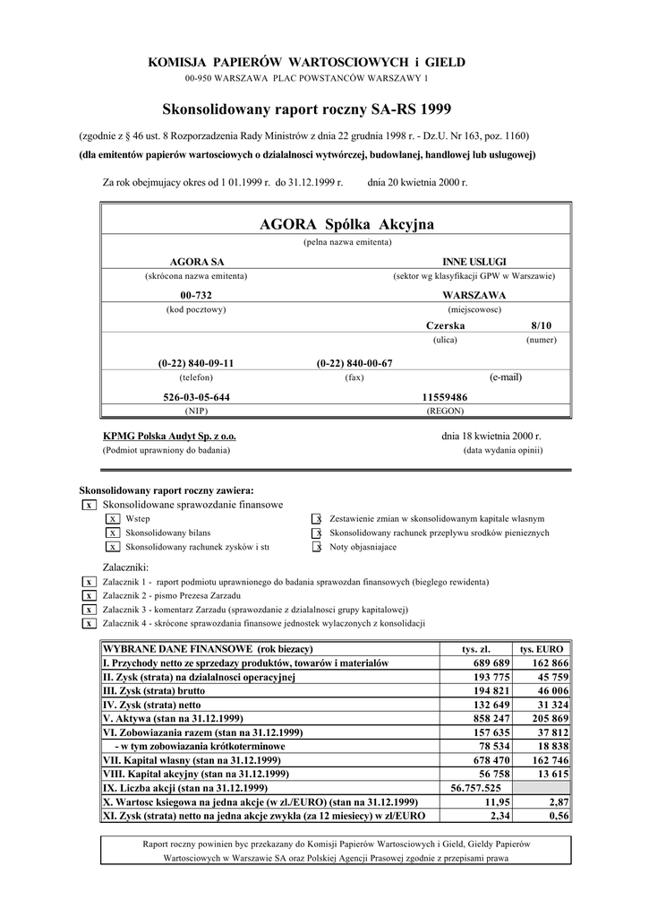 KOMISJA PAPIERÓW WARTOSCIOWYCH i GIELD 00-950 WARSZAWA PLAC POWSTANCÓW WARSZAWY 1 Skonsolidowany raport roczny SA-RS 1999 (zgodnie z § 46 ust. 8 Rozporzadzenia Rady Ministrów z dnia 22 grudnia 1998 r. - Dz.U. Nr 163, poz. 1160) (dla emitentów papierów wartosciowych o dzialalnosci wytwórczej, budowlanej, handlowej lub uslugowej) Za rok obejmujacy okres od 1 01.1999 r. do 31.12.1999 r. dnia 20 kwietnia 2000 r. AGORA Spólka Akcyjna (pelna nazwa emitenta) AGORA SA INNE USLUGI (skrócona nazwa emitenta) (sektor wg klasyfikacji GPW w Warszawie) 00-732 WARSZAWA (kod pocztowy) (miejscowosc) (0-22) 840-09-11 (0-22) 840-00-67 (telefon) (fax) Czerska 8/10 (ulica) (numer) (e-mail) 526-03-05-644 11559486 (NIP) (REGON) KPMG Polska Audyt Sp. z o.o. dnia 18 kwietnia 2000 r. (Podmiot uprawniony do badania) Skonsolidowany raport roczny zawiera: x Skonsolidowane sprawozdanie finansowe x Wstep x Skonsolidowany bilans x Skonsolidowany rachunek zysków i strat (data wydania opinii) x Zestawienie zmian w skonsolidowanym kapitale wlasnym x Skonsolidowany rachunek przeplywu srodków pienieznych x Noty objasniajace Zalaczniki: x x x x Zalacznik 1 - raport podmiotu uprawnionego do badania sprawozdan finansowych (bieglego rewidenta) Zalacznik 2 - pismo Prezesa Zarzadu Zalacznik 3 - komentarz Zarzadu (sprawozdanie z dzialalnosci grupy kapitalowej) Zalacznik 4 - skrócone sprawozdania finansowe jednostek wylaczonych z konsolidacji WYBRANE DANE FINANSOWE (rok biezacy) I. Przychody netto ze sprzedazy produktów, towarów i materialów II. Zysk (strata) na dzialalnosci operacyjnej III. Zysk (strata) brutto IV. Zysk (strata) netto V. Aktywa (stan na 31.12.1999) VI. Zobowiazania razem (stan na 31.12.1999) - w tym zobowiazania krótkoterminowe VII. Kapital wlasny (stan na 31.12.1999) VIII. Kapital akcyjny (stan na 31.12.1999) IX. Liczba akcji (stan na 31.12.1999) X. Wartosc ksiegowa na jedna akcje (w zl./EURO) (stan na 31.12.1999) XI. Zysk (strata) netto na jedna akcje zwykla (za 12 miesiecy) w zl/EURO tys. zl. tys. EURO 689 689 193 775 194 821 132 649 858 247 157 635 78 534 678 470 56 758 56.757.525 11,95 2,34 Raport roczny powinien byc przekazany do Komisji Papierów Wartosciowych i Gield, Gieldy Papierów Wartosciowych w Warszawie SA oraz Polskiej Agencji Prasowej zgodnie z przepisami prawa 162 866 45 759 46 006 31 324 205 869 37 812 18 838 162 746 13 615 2,87 0,56 WSTEP Podstawowym przedmiotem dzialalnosci Grupy Kapitalowej Agora SA (”Grupa”) jest wydawanie gazet, czasopism - EKD 2212 oraz uslugi reklamowe EKD 7440 (ogloszenia prasowe). Prezentowane sprawozdanie finansowe obejmuje dane za 12 miesiecy do 31 grudnia 1999 roku oraz porównywalne dane finansowe za 12 miesiecy do 31 grudnia 1998 roku. Nie bylo zastrzezen w opiniach podmiotów uprawnionych do badania sprawozdan finansowych Grupy za lata poprzedzajace rok konczacy sie 31 grudnia 1999 roku. ZASADY I METODY RACHUNKOWOSCI, METODY WYCENY AKTYWÓW I PASYWÓW ORAZ POMIARU WYNIKU FINANSOWEGO 1. Podstawa sporzadzenia skonsolidowanego sprawozdania finansowego Skonsolidowane sprawozdanie finansowe obejmuje Spólki zalezne Agore-Poligrafie Sp. z o. o. i Trans-Serwis SA. Konsolidacja nie objeto spólek zaleznych i stowarzyszonych wymienionych w dodatkowej nocie objasniajacej nr 17, które byly nie istotne zgodnie z ustawa o rachunkowosci oraz nie podlegaly konsolidacji zgodnie z Rozporzadzeniem Ministra Finansów z dnia 19 listopada 1999 roku w sprawie okreslenia ostrzejszych kryteriów od zawartych w przepisach ustawy o rachunkowosci w odniesieniu do jednostek bedacych emitentami papierów wartosciowych dopuszczonych do publicznego obrotu lub emitentami papierów wartosciowych ubiegajacymi sie o ich dopuszczenie do publicznego obrotu (D.U. nr 99.96.1126). Spólki zalezne sa konsolidowane zgodnie z zasadami konsolidacji pelnej. W sytuacji kiedy spólka zostala podporzadkowana w trakcie roku, w konsolidacji ujeto jedynie wynik finansowy od daty ustanowienia kontroli. Zaklada sie istnienie kontroli, gdy Spólka dominujaca posiada w spólce zaleznej wiecej niz polowe glosów, lub wywiera znaczny wplyw na te jednostke. Konsolidacja dokonana metoda pelna polega na zsumowaniu poszczególnych pozycji bilansu, rachunku zysków i strat oraz rachunku przeplywów finansowych jednostki dominujacej Agora SA i jednostek zaleznych oraz dokonaniu nastepujacych wylaczen: · wartosci nabycia udzialów posiadanych przez jednostke dominujaca w jednostce zaleznej i czesci aktywów netto jednostki zaleznej, wedlug ich wartosci ksiegowej na dzien nabycia, · wzajemnych naleznosci i zobowiazan, · przychodów i kosztów dotyczacych wzajemnie dokonanych operacji, · zysków i strat powstalych na wzajemnie dokonanych operacjach, zawartych w podlegajacych konsolidacji aktywach i pasywach, · dywidend wyplaconych przez jednostke zalezna jednostce dominujacej i otrzymanych przez nia. Konsolidacja jednostek stowarzyszonych dokonana metoda praw wlasnosci polega na zaktualizowaniu wartosci udzialów podmiotu dominujacego w podmiotach stowarzyszonych do wartosci odpowiadajacej tej czesci kapitalu wlasnego, jaki podmiot dominujacy posiada w kapitalach podmiotów stowarzyszonych na dzien dokonania konsolidacji. W jednostkach objetych konsolidacja, Agora-Poligrafia Sp. z o.o. oraz Trans-Serwis SA, wystepowala wartosc firmy z konsolidacji bedaca nadwyzka ceny nabycia udzialów nad wartoscia odpowiedniej czesci aktywów netto tych jednostek. Skonsolidowane sprawozdanie finansowe Grupy Kapitalowej Agora SA (“Grupa”) za okres od 1 stycznia do 31 grudnia 1999 roku obejmuje sprawozdania finansowe nastepujacych spólek zaleznych (w nawiasach data objecia kontroli): Agora-Poligrafia Sp. z o.o. (od 1 marca 1998 roku) Trans-Serwis SA (od 1 lipca 1998 roku) oraz podmiotu dominujacego Agora SA (”Agora SA”, ”podmiot dominujacy”) Dane porównywalne za okres od 1 stycznia do 31 grudnia 1998 roku obejmuja spólke stowarzyszona Grupa Kapitalowa Telewizyjna Korporacji Partycypacyjna SA (”TKP”), (