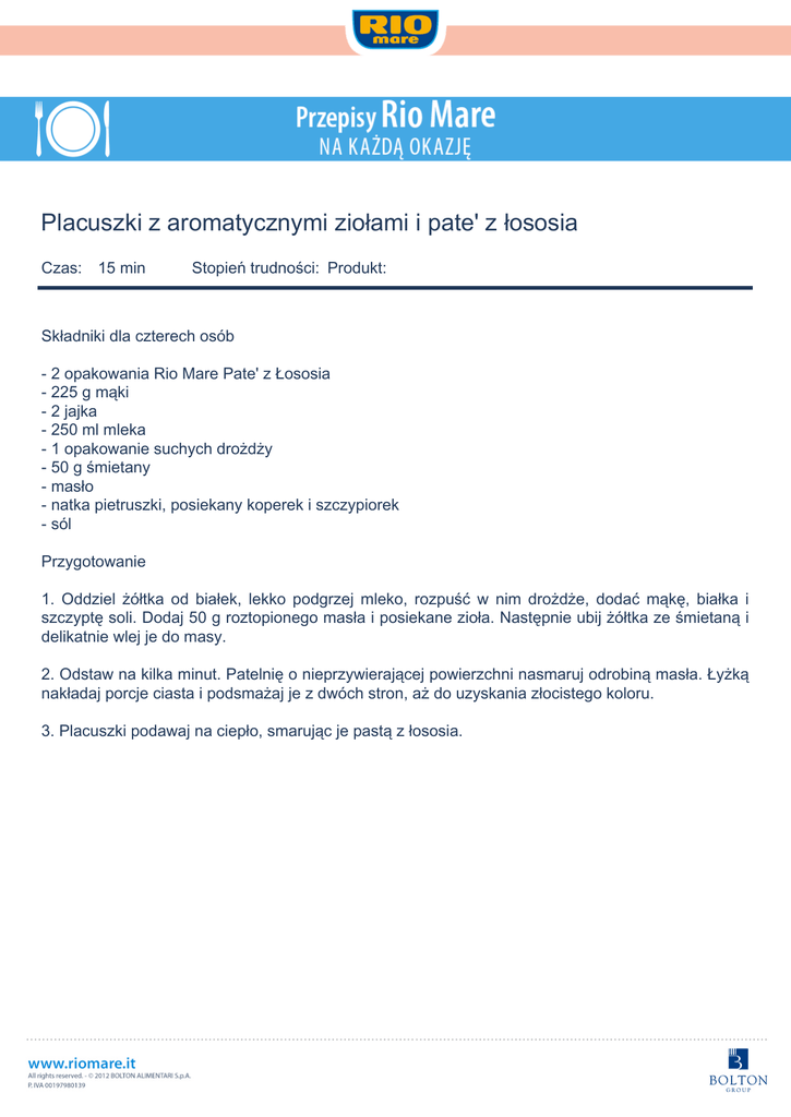 Placuszki z aromatycznymi ziołami i pate' z łososia Czas: 15 min Stopień trudności: Produkt: Składniki dla czterech osób - 2 opakowania Rio Mare Pate' z Łososia - 225 g mąki - 2 jajka - 250 ml mleka - 1 opakowanie suchych drożdży - 50 g śmietany - masło - natka pietruszki, posiekany koperek i szczypiorek - sól Przygotowanie 1. Oddziel żółtka od białek, lekko podgrzej mleko, rozpuść w nim drożdże, dodać mąkę, białka i szczyptę soli. Dodaj 50 g roztopionego masła i posiekane zioła. Następnie ubij żółtka ze śmietaną i delikatnie wlej je do masy. 2. Odstaw na kilka minut. Patelnię o nieprzywierającej powierzchni nasmaruj odrobiną masła. Łyżką nakładaj porcje ciasta i podsmażaj je z dwóch stron, aż do uzyskania złocistego koloru. 3. Placuszki podawaj na ciepło, smarując je pastą z łososia.