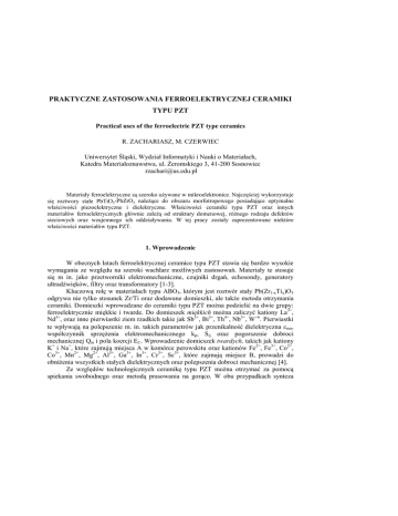 PRAKTYCZNE ZASTOSOWANIA FERROELEKTRYCZNEJ CERAMIKI TYPU PZT Practical uses of the ferroelectric PZT type ceramics R. ZACHARIASZ, M. CZERWIEC Uniwersytet Śląski, Wydział Informatyki i Nauki o Materiałach, Katedra Materiałoznawstwa, ul. Żeromskiego 3, 41-200 Sosnowiec [email protected] Materiały ferroelektryczne są szeroko używane w mikroelektronice. Najczęściej wykorzystuje się roztwory stałe PbTiO3-PbZrO3 należące do obszaru morfotropowego posiadające optymalne właściwości piezoelektryczne i dielektryczne. Właściwości ceramiki typu PZT oraz innych materiałów ferroelektrycznych głównie zależą od struktury domenowej, różnego rodzaju defektów sieciowych oraz wzajemnego ich oddziaływania. W tej pracy zostały zaprezentowane niektóre właściwości materiałów typu PZT. 1. Wprowadzenie W obecnych latach ferroelektrycznej ceramice typu PZT stawia się bardzo wysokie wymagania ze względu na szeroki wachlarz możliwych zastosowań. Materiały te stosuje się m in. jako przetworniki elektromechaniczne, czujniki drgań, echosondy, generatory ultradźwięków, filtry oraz transformatory [1-3]. Kluczową rolę w materiałach typu ABO3, którym jest roztwór stały Pb(Zr1-xTix)O3 odgrywa nie tylko stosunek Zr/Ti oraz dodawane domieszki, ale także metoda otrzymania ceramiki. Domieszki wprowadzane do ceramiki typu PZT można podzielić na dwie grupy: ferroelektrycznie miękkie i twarde. Do domieszek miękkich można zaliczyć kationy La3+, Nd3+, oraz inne pierwiastki ziem rzadkich takie jak Sb3+, Bi3+, Th4+, Nb5+, W+6. Pierwiastki te wpływają na polepszenie m. in. takich parametrów jak przenikalność dielektryczna εmn, współczynnik sprzężenia elektromechanicznego kp, Sij oraz pogorszenie dobroci mechanicznej Qm i pola koercji EC. Wprowadzenie domieszek twardych, takich jak kationy K+ i Na+, które zajmują miejsca A w komórce perowskitu oraz kationów Fe2+, Fe3+, Co2+, Co3+, Mn2+, Mg2+, Al3+, Ga3+, In3+, Cr3+, Sc3+, które zajmują miejsce B, prowadzi do obniżenia wszystkich stałych dielektrycznych oraz polepszenia dobroci mechanicznej [4]. Ze względów technologicznych ceramikę typu PZT można otrzymać za pomocą spiekania swobodnego oraz metodą prasowania na gorąco. W obu przypadkach synteza może zostać przeprowadzona na drodze reakcji tlenków w fazie stałej lub metodą zolowożelową. Na rysunku 1 przedstawiono zależności podstawowych parametrów piezoceramiki typu PZT od koncentracji PbTiO3 [5]. Na wykresie pokazanych jest siedem różnych obszarów: I – materiały używane do wysokoczęstotliwościowych przetworników z niską wartością przenikalności dielektrycznej ε i wysoką wartością sprzężenia elektromechanicznego kp; II – bardzo czułe przetworniki z wysoką wartością modułu gij używane w akceleratorach, defektoskopach, sprzęcie medycznym i pamięciach; III – niskoczęstotliwościowe przetworniki z wysoką wartością przenikalności dielektrycznej ε, sprzężenia elektromechanicznego kp oraz tangensa kąta strat tgδ; IV i V – materiały ferroelektrycznie twarde używane w elektroakustycznych przetwornikach, piezotransformatorach oraz piezosilnikach; VI – materiały z wysoką oraz stabilną wartością częstotliwości rezonansowej używane głównie na filtry; VII – wysokotemperaturowe przetworniki z temperaturą Curie powyżej 693 K; posiadają wysokie parametry piezoelektryczne niewiele zmieniające się w roboczym przedziale temperaturowym i stosunkowo niskie wartości przenikalności elektrycznej ε. MR Re ∆fr /f r T (Re+T) (213-358K) 2 σ k ij Qm σ Qm Qm γ gij kij dij σ /ε ε33 0 I PbTiO 3 III II IV V VI VII Rys. 1. Zależności podstawowych parametrów piezoceramiki typu PZT od zawartości PbTiO3 [5] 2. Materiał badań W pracy przedstawiono wyniki badań materiałów ceramicznych o ogólnym wzorze chemicznym: n (x) PbTiO3 – (1-x-y) PbZrO3 – (y) ∑ Pb (B’1-α B”α) O3. i =1 Materiał do badań stanowiły próbki, otrzymane przez autorów pracy w odpowiednio dobranym procesie technologicznym, zawierające zarówno twarde jak i miękkie domieszki: Pb0,94Sr0,06(Zr0,5Ti0,5)O3 + 0,25% wag. Cr2O3 (ceramika ferroelektrycznie twarda) I (Pb0.9Ba0.1)(Zr0.53Ti0.47)O3 + 2% mol. Nb2O5 (ceramika ferroelektrycznie miękka) II Domieszki do podstawowego składu chemicznego wprowadzono celem uzyskania próbek o różnych właściwościach mechanicznych i dielektrycznych. Pozwoliło to w dalszym eksperymencie wykazać pewne zależności zachodzące w tego typu związkach. Do twardego domieszkowania wykorzystano kationy Cr3+, podstawiane w pozycje B’’, natomiast do miękkiego domieszkowania kationy: Nb5+, podstawiane w pozycje B’. W celu otrzymania materiału ceramicznego I jak i II, sporządzano mieszaninę składającą się z syntezowanego ceramicznego proszku o danym składzie oraz 3 % roztworu alkoholu poliwinylowego, a następnie tak przygotowaną masę ceramiczną umieszczano w matrycach w kształcie prostopadłościanu i prasowano za pomocą pras hydraulicznych. Tak przygotowane wypraski poddawano suszeniu w atmosferze powietrza, a następnie umieszczano w ceramicznym tyglu w otoczeniu podsypki (mieszanina PbO i ZrO2) [6]. Wypraski spiekano w temperaturze 1525 K przez 2 h, po czym w wyniku obróbki mechanicznej, otrzymywano próbki w kształcie dysków o średnicy 10 mm i grubości 1 mm, które zostały wykorzystywane do badań właściwości dielektrycznych i piezoelektrycznych. 3. Wyniki badań W tabeli 1 przedstawiono podstawowe wartości parametrów ceramiki I oraz II uzyskane na podstawie przeprowadzonych badań. Jak widać obie uzyskane ceramiki posiadają wysoką gęstość, w granicach od 7.6 – 7.3 kg/m3. Ceramika o składzie I należy do materiałów o znacznym stopniu ferrotwardości (Ti/Zr = 0.5/0.5). Charakteryzuje się ona niską wartością tg kąta strat dielektrycznych poniżej 1.2 %, oraz wysoką wartością dobroci mechanicznej Qm = 560. Z tego względu znajduje ona zasto