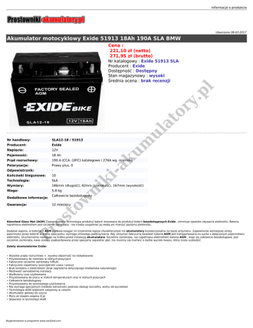 Informacje o produkcie Utworzono 08-03-2017 Akumulator motocyklowy Exide 51913 18Ah 190A SLA BMW Cena : 221,10 zł (netto) 271,95 zł (brutto) ul at or y. p l Nr katalogowy : Exide 51913 SLA Producent : Exide Dostępność : Dostępny Stan magazynowy : wysoki Średnia ocena : brak recenzji SLA12-18 / 51913 Producent: Exide Napięcie: 12V Pojemność: 18 Ah Prąd rozruchowy: 190 A (CCA -18ºC) katalogowo / 276A wg. miernika Polaryzacja: Prawy plus, 0 Odpowietrznik: - Końcówki biegunowe: 10 Technologia: SLA Wymiary: 186mm (długość), 82mm (szerokość), 167mm (wysokość) Waga: 5.8 kg -a k ki ni 12 miesięcy Pr os to Gwarancja: Całkowicie bezobsługowy w Dodatkowe informacje: um Nr handlowy: Absorbed Glass Mat (AGM) Zaawansowana technologia produkcji baterii stosowana do produkcji baterii bezobsługowych Exide , eliminuje zjawisko ubywania elektrolitu. Bateria napełniona elektrolitem jest szczelnie zamknięta - nie trzeba uzupełniać jej wodą ani mierzyć poziomu elektrolitu. Dodatek wapnia, w bateriach AGM pozwala osiągać im trzykrotnie lepsze charakterystyki niż akumulatory konwencjonalne na bazie antymonu. Zapewnienie wolniejszej utraty pojemności przez baterie w stanie spoczynku, wymaga zimowego podtrzymania. Aby utrzymać fabryczną świeżość bateria AGM jest transportowana na sucho z dołączonym pojemnikiem elektrolitu. Uruchomienie następuje na krótko przed instalacją akumulatora. Szczelnie zamknięta, raz napełniona elektrolitem bateria AGM , staje się całkowicie bezobsługowa. Jest szczelnie zamknięta, kwas zostaje zaabsorbowany przez specjalny separator płyt, nie musimy się martwić o żadne wycieki kwasu, który może uszkodzić. Zalety akumulatorów Exide: • Wysokie prądy rozruchowe + wysoka odporność na rozładowanie • Przystosowany do montażu w różnych pozycjach • Fabrycznie szczelnie zamknięty (VRLA) • Fabrycznie napełniony (oszczędność czasu i pracy) • Brak kontaktu z elektrolitem (brak zagrożenia dotyczącego środowiska naturalnego) • Możliwość samodzielnej instalacji • Wydłużony czas użytkowania • Przystosowany do pracy w niskich temperaturach oraz w różnych pozycjach • Całkowicie bezobsługowy • Przystosowany do sezonowego użytkowania • Nie wymaga specjalnych środków ostrożności podczas obsługi (szczelny, wolny od wycieków) • Technologia AGM (elektrolit uwięziony w celach) • Akumulator gotowy do użycia • Płyty ze stopem wapnia (Ca) • Separator w technologii AGM Wygenerowano w programie www.oscGold.com Pr os to w ni ki -a k um ul at or y. p l Przeciętny czas dostawy: 24 godziny