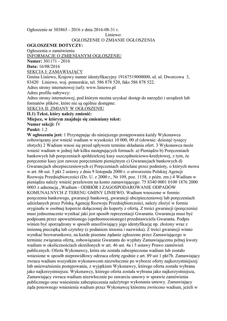 Ogłoszenie nr 303865 - 2016 z dnia 2016-08-31 r. Liniewo: OGŁOSZENIE O ZMIANIE OGŁOSZENIA OGŁOSZENIE DOTYCZY: Ogłoszenia o zamówieniu INFORMACJE O ZMIENIANYM OGŁOSZENIU Numer: 301171 - 2016 Data: 16/08/2016 SEKCJA I: ZAMAWIAJĄCY Gmina Liniewo, Krajowy numer identyfikacyjny 19167519000000, ul. ul. Dworcowa 3, 83420 Liniewo, woj. pomorskie, tel. 586 878 520, faks 586 878 522. Adres strony internetowej (url): www.liniewo.pl Adres profilu nabywcy: Adres strony internetowej, pod którym można uzyskać dostęp do narzędzi i urządzeń lub formatów plików, które nie są ogólnie dostępne: SEKCJA II: ZMIANY W OGŁOSZENIU II.1) Tekst, który należy zmienić: Miejsce, w którym znajduje się zmieniany tekst: Numer sekcji: IV Punkt: 1.2 W ogłoszeniu jest: 1 Przystępując do niniejszego postępowania każdy Wykonawca zobowiązany jest wnieść wadium w wysokości 10 000, 00 zł (słownie: dziesięć tysięcy złotych) 2 Wadium wnosi się przed upływem terminu składania ofert. 3 Wykonawca może wnieść wadium w jednej lub kilku następujących formach: a) Pieniądzu b) Poręczeniach bankowych lub poręczeniach spółdzielczej kasy oszczędnościowo-kredytowej, z tym, że poręczenie kasy jest zawsze poręczeniem pieniężnym c) Gwarancjach bankowych d) Gwarancjach ubezpieczeniowych e) Poręczeniach udzielane przez podmioty, o których mowa w art. 6b ust. 5 pkt 2 ustawy z dnia 9 listopada 2000 r. o utworzeniu Polskiej Agencji Rozwoju Przedsiębiorczości (Dz. U. z 2000 r., Nr 109, poz. 1158, z późn. zm.) 4 Wadium w pieniądzu należy wnieść przelewem na konto zamawiającego: 75 8340 0001 0100 1876 2000 0003 z adnotacją „Wadium - ODBIÓR I ZAGOSPODAROWANIE ODPADÓW KOMUNALNYCH Z TERENU GMINY LINIEWO. Wadium wnoszone w formie: poręczenia bankowego, gwarancji bankowej, gwarancji ubezpieczeniowej lub poręczeniach udzielanych przez Polską Agencję Rozwoju Przedsiębiorczości, należy złożyć w formie oryginału w osobnej kopercie dołączonej do koperty z ofertą. Z treści gwarancji (poręczenia) musi jednoznacznie wynikać jaki jest sposób reprezentacji Gwaranta. Gwarancja musi być podpisana przez upoważnionego (upełnomocnionego) przedstawiciela Gwaranta. Podpis winien być sporządzony w sposób umożliwiający jego identyfikację np. złożony wraz z imienną pieczątką lub czytelny (z podaniem imienia i nazwiska). Z treści gwarancji winno wynikać bezwarunkowe, na każde pisemne żądanie zgłoszone przez Zamawiającego w terminie związania ofertą, zobowiązanie Gwaranta do wypłaty Zamawiającemu pełnej kwoty wadium w okolicznościach określonych w art. 46 ust. 4a i 5 ustawy Prawo zamówień publicznych. Oferta Wykonawcy, która nie została zabezpieczona wadium lub zostało wniesione w sposób nieprawidłowy odrzuca ofertę zgodnie z art. 89 ust 1 pkt7b. Zamawiający zwraca wadium wszystkim wykonawcom niezwłocznie po wyborze oferty najkorzystniejszej lub unieważnieniu postępowania, z wyjątkiem Wykonawcy, którego oferta została wybrana jako najkorzystniejsza. Wykonawcy, którego oferta została wybrana jako najkorzystniejsza, Zamawiający zwraca wadium niezwłocznie po zawarciu umowy w sprawie zamówienia publicznego oraz wniesieniu zabezpieczenia należytego wykonania umowy. Zamawiający żąda ponownego wniesienia wadium przez Wykonawcę któremu zwrócono wadium, jeżeli w wyniku rozstrzygnięcia odwołania jego oferta została wybrana jako najkorzystniejsza. Jeżeli wadium wniesiono w pieniądzu, Zamawiający zwraca je wraz z odsetkami wynikającymi z umowy rachunku bankowego, na którym było ono przechowywane, pomniejszone o koszty prowadzenia rachunku bankowego oraz prowizji bankowej za przelew pieniędzy na rachunek bankowy wskazany przez Wykonawcę. W ogłoszeniu powinno być: 1 Przystępując do niniejszego postępowania każdy Wykonawca zobowiązany jest wnieść wadium w wysokości 10 000, 00 zł (słownie: dziesięć tysięcy złotych) 2 Wadium wnosi się przed upływem terminu składania ofert. 3 Wykonawca może wnieść wadium w jednej lub kilku następujących formach: a) Pieniądzu b) Poręczeniach bankowych lub poręczeniach spółdzielczej kasy oszczędnościowo-kredytowej, z tym, że poręczenie kasy jest zawsze poręczeniem pieniężnym c) Gwarancjach bankowych d) Gwarancjach ubezpieczeniowych e) Poręczeniach udzielane przez podmioty, o których mowa w art. 6b ust. 5 pkt 2 ustawy z dnia 9 listopada 2000 r. o utworzeniu Polskiej Agencji Rozwoju Przedsiębiorczości (Dz. U. z 2000 r., Nr 109, poz. 1158, z późn. zm.) 4 Wadium w pieniądzu należy wnieść przelewem na konto zamawiającego: 48 8340 0001 0100 1876 2000 0003 z adnotacją „Wadium - ODBIÓR I ZAGOSPODAROWANIE ODPADÓW KOMUNALNYCH Z TERENU GMINY LINIEWO. Wadium wnoszone w formie: poręczenia bankowego, gwarancji bankowej, gwarancji ubezpieczeniowej lub poręczeniach udzielanych przez Polską Agencję Rozwoju Przedsiębiorczości, należy złożyć w formie oryginału w osobnej kopercie dołączonej do koperty z ofertą. Z treści gwarancji (poręczenia) musi jednoznacznie wynikać jaki jest sposób reprezentacji Gwaranta. Gwarancja musi być podpisana przez upoważnionego (upełnomocnionego) przedstawiciela Gwaranta. Podpis winien być sporządzony w sposób umożliwiający jego identyfikację np. złożony wraz z imienną pieczątką lub czytelny (z podaniem imienia i nazwiska). Z treści gwarancji winno wynikać bezwarunkowe, na każde pisemne żądanie zgłoszone przez Zamawiającego w terminie związania ofertą, zobowiązanie Gwaranta do wypłaty Zamawiającemu pełnej kwoty wadium w okolicznościach określonych w art. 46 ust. 4a i 5 ustawy Prawo zamówień publicznych. Oferta Wykonawcy, która nie została zabezpieczona wadium lub zostało wniesione w sposób nieprawidłowy odrzuca ofertę zgodnie z art. 89 ust 1 pkt7b. Zamawiający zwraca wadium wszystkim wykonawcom niezwłocznie po wyborze oferty najkorzystniejszej lub unieważnieniu postępowania, z wyjątkie