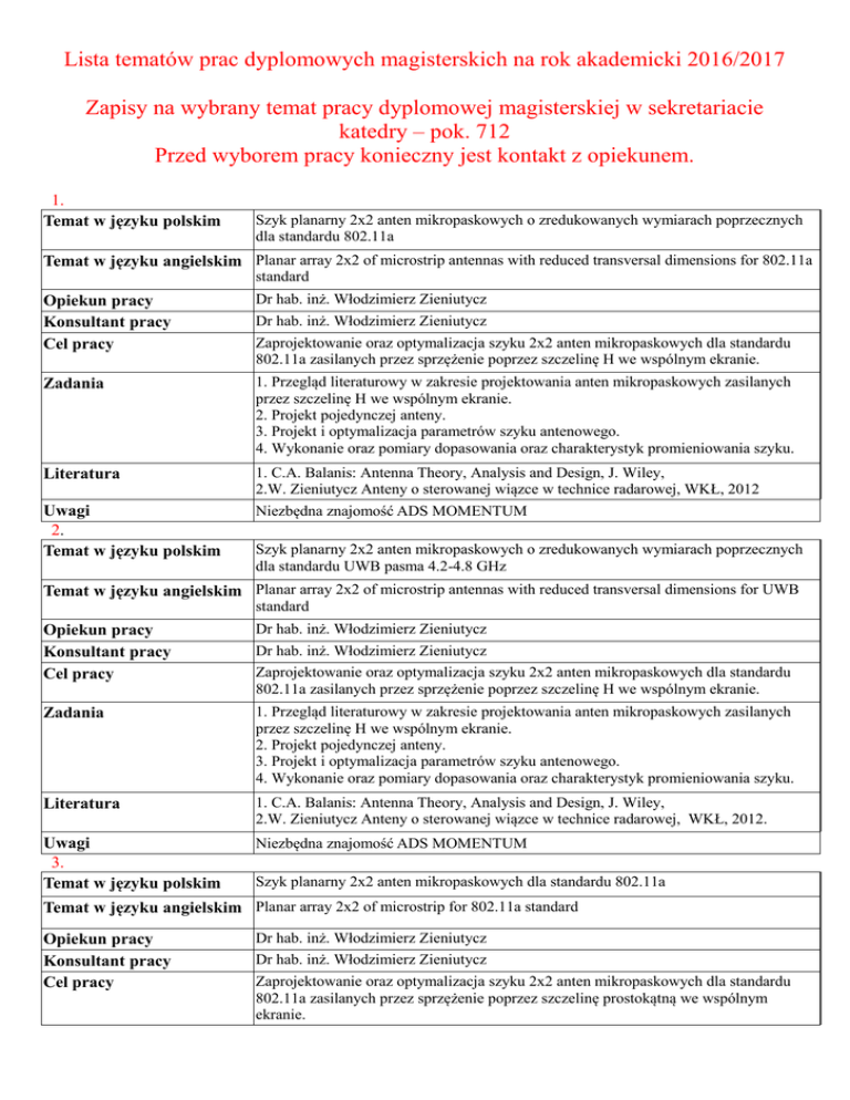 Lista tematów prac dyplomowych magisterskich na rok akademicki 2016/2017 Zapisy na wybrany temat pracy dyplomowej magisterskiej w sekretariacie katedry – pok. 712 Przed wyborem pracy konieczny jest kontakt z opiekunem. 1. Temat w języku polskim Szyk planarny 2x2 anten mikropaskowych o zredukowanych wymiarach poprzecznych dla standardu 802.11a Temat w języku angielskim Planar array 2x2 of microstrip antennas with reduced transversal dimensions for 802.11a standard Opiekun pracy Konsultant pracy Cel pracy Dr hab. inż. Włodzimierz Zieniutycz Zadania 1. Przegląd literaturowy w zakresie projektowania anten mikropaskowych zasilanych przez szczelinę H we wspólnym ekranie. 2. Projekt pojedynczej anteny. 3. Projekt i optymalizacja parametrów szyku antenowego. 4. Wykonanie oraz pomiary dopasowania oraz charakterystyk promieniowania szyku. Literatura 1. C.A. Balanis: Antenna Theory, Analysis and Design, J. Wiley, 2.W. Zieniutycz Anteny o sterowanej wiązce w technice radarowej, WKŁ, 2012 Niezbędna znajomość ADS MOMENTUM Uwagi 2. Temat w języku polskim Dr hab. inż. Włodzimierz Zieniutycz Zaprojektowanie oraz optymalizacja szyku 2x2 anten mikropaskowych dla standardu 802.11a zasilanych przez sprzężenie poprzez szczelinę H we wspólnym ekranie. Szyk planarny 2x2 anten mikropaskowych o zredukowanych wymiarach poprzecznych dla standardu UWB pasma 4.2-4.8 GHz Temat w języku angielskim Planar array 2x2 of microstrip antennas with reduced transversal dimensions for UWB standard Opiekun pracy Konsultant pracy Cel pracy Dr hab. inż. Włodzimierz Zieniutycz Zadania 1. Przegląd literaturowy w zakresie projektowania anten mikropaskowych zasilanych przez szczelinę H we wspólnym ekranie. 2. Projekt pojedynczej anteny. 3. Projekt i optymalizacja parametrów szyku antenowego. 4. Wykonanie oraz pomiary dopasowania oraz charakterystyk promieniowania szyku. Literatura 1. C.A. Balanis: Antenna Theory, Analysis and Design, J. Wiley, 2.W. Zieniutycz Anteny o sterowanej wiązce w technice radarowej, WKŁ, 2012. Uwagi 3. Temat w języku polskim Niezbędna znajomość ADS MOMENTUM Dr hab. inż. Włodzimierz Zieniutycz Zaprojektowanie oraz optymalizacja szyku 2x2 anten mikropaskowych dla standardu 802.11a zasilanych przez sprzężenie poprzez szczelinę H we wspólnym ekranie. Szyk planarny 2x2 anten mikropaskowych dla standardu 802.11a Temat w języku angielskim Planar array 2x2 of microstrip for 802.11a standard Opiekun pracy Konsultant pracy Cel pracy Dr hab. inż. Włodzimierz Zieniutycz Dr hab. inż. Włodzimierz Zieniutycz Zaprojektowanie oraz optymalizacja szyku 2x2 anten mikropaskowych dla standardu 802.11a zasilanych przez sprzężenie poprzez szczelinę prostokątną we wspólnym ekranie. Zadania 1. Przegląd literaturowy w zakresie projektowania anten mikropaskowych zasilanych przez szczelinę prostokątną we wspólnym ekranie. 2. Projekt pojedynczej anteny. 3. Projekt i optymalizacja parametrów szyku antenowego. 4. Wykonanie oraz pomiary dopasowania oraz charakterystyk promieniowania szyku. Literatura 1. C.A. Balanis: Antenna Theory, Analysis and Design, J. Wiley, 2.W. Zieniutycz Anteny o sterowanej wiązce w technice radarowej, WKŁ, 2012 Uwagi Praca przeznaczona dla studentów studiów niestacjonarnych w języku angielskim. Niezbędna znajomość ADS MOMENTUM 4. Temat w języku polskim Zastosowanie nowatorskich algorytmów poszukujących i śledzących miejsca zerowe na płaszczyźnie zespolonej do analizy prowadnic optycznych i mikrofalowych Temat w języku angielskim Application of novel algorithms for searching and tracking of roots in the complex plane for the analysis of optical and microwave waveguides Opiekun pracy Konsultant pracy Cel pracy Zadania Literatura Uwagi 5. Temat w języku polskim Piotr Kowalczyk Opracowanie oprogramowania służącego do analizy prowadnic optycznych i mikrofalowych. Program powinien umożliwiać badanie linii o dowolnych geometriach (wykreślanie rozkładów pól oraz wyznaczanie parametrów charakterystycznych prowadnicy). 1. Przegląd literatury przedmiotu. 2. Sformułowanie zagadnienia prowadzenia fal elektromagnetycznych we współrzędnych prostokątnych i cylindrycznych. 3. Implementacja algorytmów numerycznych poszukujących i śledzących miejsca zerowe na płaszczyźnie zespolonej. 4. Wyznaczenie rozkładów pól i parametrów charakterystycznych dla kilku wybranych prowadnic. 5. Weryfikacja otrzymanych rezultatów. [1] P. Kowalczyk. 2015. Complex Root Finding Algorithm Based on Delaunay Triangulation. ACM Trans. Math. Softw. 41, 3, Article 19 (June 2015) [2] J. J. Michalski, P. Kowalczyk, "Efficient and Systematic Solution of Real and Complex Eigenvalue Problems Employing Simplex Chain Vertices Searching Procedure," in IEEE Transactions on Microwave Theory and Techniques, vol. 59, no. 9, pp. 2197-2205, Sept. 2011 Praca wymaga dobrego przygotowania matematycznego i numerycznego Zastosowanie metody elementów skończonych do analizy prowadnic optycznych i mikrofalowych Temat w języku angielskim Application of finite element method in the analysis of optical and microwave waveguides Opiekun pracy Konsultant pracy Cel pracy Zadania Literatura Piotr Kowalczyk Grzegorz Fotyga Opracowanie oprogramowania służącego do analizy prowadnic optycznych i mikrofalowych. Program powinien umożliwiać badanie linii o dowolnych geometriach (wykreślanie rozkładów pól oraz wyznaczanie parametrów charakterystycznych prowadnicy). 1. Przegląd literatury przedmiotu. 2. Zapoznanie się z formalizmem algorytmu elementów skończonych. 3. Implementacja algorytmu w środowisku Matlab. 4. Wyznaczenie rozkładów pól i parametrów charakterystycznych dla kilku wybranych prowadnic. 5. Weryfikacja otrzymanych rezultatów. [1] Matthew N.O. Sadiku, Numerical Techniques in Electromagnetics, Second Edition, CRC Press 2000 [2] Reddy C. J., Deshpande Manohar D., Cockrell C. R., Beck Fred B., Finite Element Method for Eigenvalue Problems in Electromagnetics. Techni