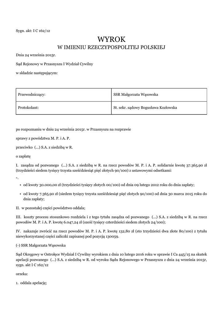 Sygn. akt: I C 162/12 WYROK W IMIENIU RZECZYPOSPOLITEJ POLSKIEJ Dnia 24 września 2015r. Sąd Rejonowy w Przasnyszu I Wydział Cywilny w składzie następującym: Przewodniczący: SSR Małgorzata Wąsowska Protokolant: St. sekr. sądowy Bogusława Kozłowska po rozpoznaniu w dniu 24 września 2015r. w Przasnyszu na rozprawie sprawy z powództwa M. P. i A. P. przeciwko (...) S.A. z siedzibą w R. o zapłatę I. zasądza od pozwanego (...) S.A. z siedzibą w R. na rzecz powodów M. P. i A. P. solidarnie kwotę 37.365,90 zł (trzydzieści siedem tysięcy trzysta sześćdziesiąt pięć złotych 90/100) z ustawowymi odsetkami: -. • od kwoty 30.000,00 zł (trzydzieści tysięcy złotych 00/100) od dnia 09 lutego 2012 roku do dnia zapłaty; • od kwoty 7.365,90 zł (siedem tysięcy trzysta sześćdziesiąt pięć złotych 90/100) od dnia 30 marca 2015 roku do dnia zapłaty; II. w pozostałej części powództwo oddala; III. koszty procesu stosunkowo rozdziela i z tego tytułu zasądza od pozwanego (...) S.A. z siedzibą w R. na rzecz powodów M. P. i A. P. kwotę 6.047,24 zł (sześć tysięcy czterdzieści siedem złotych 24/100); IV. nakazuje zwrócić na rzecz powodów M. P. i A. P. kwotę 132,80 zł (sto trzydzieści dwa złote 80/100) z tytułu niewykorzystanej części zaliczki zapisanej pod pozycją 130059. (-) SSR Małgorzata Wąsowska Sąd Okręgowy w Ostrołęce Wydział I Cywilny wyrokiem z dnia 10 lutego 2016 roku w sprawie I Ca 445/15 na skutek apelacji pozwanego (...) S.A. z siedzibą w R. od wyroku Sądu Rejonowego w Przasnyszu z dnia 24 września 2015r, sygn. akt I C 162/12 orzeka: 1. oddala apelację; 2. zasądza od pozwanego na rzecz powodów kwotę 1200 ( jeden tysiąc dwieście) złotych tytułem zwrotu kosztów zastępstwa prawnego w postępowaniu apelacyjnym. Sygn. akt IC 162/12 UZASADNIENIE W dniu 09 lutego 2012r. pełnomocnik powodów wniósł o zasądzenie od (...) S.A. oddział W. na rzecz A. i M. małżonków P. kwoty 30.000,00 złotych oraz kosztów postępowania, w tym kosztów zastępstwa prawnego. W uzasadnieniu pozwu pełnomocnik powodów wskazał, że powód zawarł z pozwanym umowę o dostarczanie energii do zabudowanej nieruchomości, położonej w S. 10. Pozwany dostarczał energię powodom do dnia 10 lutego 2011r., w którym doszło do bezprawnego odłączenia energii, co zostało stwierdzone przez Prezesa Urzędu Regulacji Energetyki. W wyniku odłączenia energii w nieruchomości powodów przestały działać urządzenia zasilane energią elektryczną, w tym piec centralnego ogrzewania. Brak ogrzewania nieruchomości oraz surowe mrozy doprowadziły do zamarznięcia wody w instalacjach i urządzeniach znajdujących się w domu powodów, co w konsekwencji spowodowało uszkodzenie pieca CO, grzejników, rurek doprowadzających wodę, zbiornika na wodę, pompy wody, muszli klozetowych, baterii, ogrzewania podłogowego, jak również zniszczenia posadzek i popękania ścian. Powód, jeszcze przed wszczęciem postępowania wzywał pozwanego dwukrotnie do uiszczenia kwoty 40.000,00 złotych, jednakże bezskutecznie. W odpowiedzi na pozew pozwany wniósł o odrzucenie pozwu, ewentualnie oddalenie powództwa. W uzasadnieniu wskazał, że wskazany w pozwie podmiot (...) S.A. Oddział w W.” nie ma zdolności sądowej. Podniósł ponadto, że poza powyższym powództwo nie zasługuje na uwzględnienie, albowiem wprawdzie mimo istnienia decyzji administracyjnej, odłączenie energii elektrycznej, zdaniem pozwanego, zostało przeprowadzone zgodnie z procedurą windykacyjną, z powodu nieuregulowania płatności przez powodów, po uprzednim zawiadomieniu o tym fakcie i wskazaniu konsekwencji nieopłacenia rachunków. Po ostatecznym sprecyzowaniu powództwa pełnomocnik powodów wniósł o zasądzenie od pozwanego (...) S.A. w R. kwoty 48.914,68 złotych z odsetkami ustawowymi od kwoty 30.000,00 złotych od dnia wniesienia pozwu do dnia zapłaty oraz od kwoty 18.914,68 złotych od dnia 30 marca 2015r. do dnia zapłaty wraz z kosztami postępowania. Pozwany w toku całego procesu konsekwentnie wnosił o oddalenie powództwa, wskazując również, że nie ma związku przyczynowego między odcięciem energii, a zamarznięciem wody w instalacjach i powstaniu uszkodzeń rzeczy znajdujących się na nieruchomości powodów. Wskazywał również, że żądania powodów są zawyżone, nieadekwatne do powstałej szkody, jak również, że ponoszą oni całkowitą odpowiedzialność za powstanie szkód, wobec niewypuszczenia wody z instalacji na okres zimowy. Sąd ustalił następujący stan faktyczny: Nieruchomość położona w miejscowości S. stanowi własność powodów. Nieruchomość otrzymali na podstawie umowy darowizny od matki powódki M. R.. Na nieruchomości znajduje się murowany, trzykondygnacyjny budynek mieszkalny o pow. użytkowej około 180m( 2), wybudowany w 1993 roku, w którym powodowie w latach 2009 i 2010 przeprowadzili generalny remont, używając rzeczy dobrej jakości, o wysokim standardzie. Powodowie korzystali z nieruchomości okresowo, jednakże przez cały rok, spędzając tam między innymi święta, ferie zimowe, czy wakacje. Od czerwca do października przebywali tam nieprzerwanie rodzice i dzieci powodów. Do nieruchomości dostarczana była energia elektryczna na podstawie umowy z dnia 12 lipca 2006r. zawartej przez (...) S.A. z siedzibą w R. Oddział w W. z poprzednią właścicielką nieruchomości M. R.. Powodowie, po przekazaniu im nieruchomości przez M. R., nie podpisali od razu umowy z pozwanym, jednakże dostawy energii elektrycznej były i są obecnie świadczone. To powodowie uiszczali również opłaty za dostarczoną energię elektryczną, na ich nazwisko i do nich wysyłane były faktury VAT. W późniejszym okresie, w 2010r. również powodowie podpisali umowę o dostawę energii elektrycznej z pozwanym. Powodowie nie uregulowali w terminie następujących rachunków za dostawę energii elektrycznej: (...) na kwotę 54,55 zł