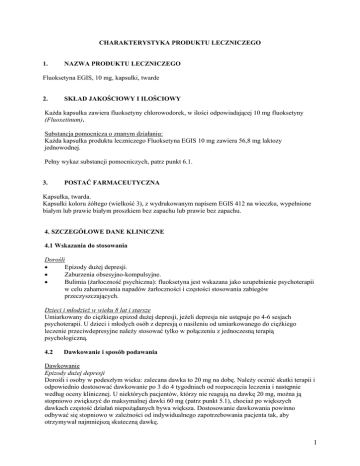 CHARAKTERYSTYKA PRODUKTU LECZNICZEGO 1. NAZWA PRODUKTU LECZNICZEGO Fluoksetyna EGIS, 10 mg, kapsułki, twarde 2. SKŁAD JAKOŚCIOWY I ILOŚCIOWY Każda kapsułka zawiera fluoksetyny chlorowodorek, w ilości odpowiadającej 10 mg fluoksetyny (Fluoxetinum). Substancja pomocnicza o znanym działaniu: Każda kapsułka produktu leczniczego Fluoksetyna EGIS 10 mg zawiera 56,8 mg laktozy jednowodnej. Pełny wykaz substancji pomocniczych, patrz punkt 6.1. 3. POSTAĆ FARMACEUTYCZNA Kapsułka, twarda. Kapsułki koloru żółtego (wielkość 3), z wydrukowanym napisem EGIS 412 na wieczku, wypełnione białym lub prawie białym proszkiem bez zapachu lub prawie bez zapachu. 4. SZCZEGÓŁOWE DANE KLINICZNE 4.1 Wskazania do stosowania Dorośli Epizody dużej depresji. Zaburzenia obsesyjno-kompulsyjne. Bulimia (żarłoczność psychiczna): fluoksetyna jest wskazana jako uzupełnienie psychoterapii w celu zahamowania napadów żarłoczności i częstości stosowania zabiegów przeczyszczających. Dzieci i młodzież w wieku 8 lat i starsze Umiarkowany do ciężkiego epizod dużej depresji, jeżeli depresja nie ustępuje po 4-6 sesjach psychoterapii. U dzieci i młodych osób z depresją o nasileniu od umiarkowanego do ciężkiego leczenie przeciwdepresyjne należy stosować tylko w połączeniu z jednoczesną terapią psychologiczną. 4.2 Dawkowanie i sposób podawania Dawkowanie Epizody dużej depresji Dorośli i osoby w podeszłym wieku: zalecana dawka to 20 mg na dobę. Należy ocenić skutki terapii i odpowiednio dostosować dawkowanie po 3 do 4 tygodniach od rozpoczęcia leczenia i następnie według oceny klinicznej. U niektórych pacjentów, którzy nie reagują na dawkę 20 mg, można ją stopniowo zwiększyć do maksymalnej dawki 60 mg (patrz punkt 5.1), chociaż po większych dawkach częstość działań niepożądanych bywa większa. Dostosowanie dawkowania powinno odbywać się stopniowo w zależności od indywidualnego zapotrzebowania pacjenta tak, aby otrzymywał najmniejszą skuteczną dawkę. 1 Pacjenci z depresją powinni być leczeni wystarczająco długo, przez co najmniej 6 miesięcy, aby upewnić się, że objawy ustąpiły. Zaburzenia obsesyjno-kompulsyjne (ang. OCD) Dorośli i osoby w podeszłym wieku: zalecaną dawką jest 20 mg na dobę. U niektórych pacjentów, jeżeli po dwóch tygodniach odpowiedź na 20 mg jest niewystarczająca, dawkę można zwiększyć stopniowo do dawki maksymalnej 60 mg, choć po większych dawkach może wystąpić zwiększona częstość działań niepożądanych. Jeżeli nie obserwuje się poprawy w ciągu 10 tygodni, należy ponownie rozważyć zasadność leczenia fluoksetyną. W wypadku korzystnej odpowiedzi terapeutycznej, leczenie można kontynuować w dawce dostosowanej do indywidualnych potrzeb pacjenta. Mimo braku systematycznych badań pozwalających odpowiedzieć na pytanie, jak długo należy stosować leczenie fluoksetyną, ze względu na przewlekły charakter zaburzeń obsesyjno-kompulsyjnych kontynuacja leczenia ponad 10 tygodni wydaje się uzasadniona. Dostosowanie dawki należy przeprowadzać ostrożnie, indywidualnie u każdego pacjenta, starając się utrzymać najmniejszą dawkę skuteczną. Należy okresowo oceniać konieczność dalszego leczenia. Niektórzy lekarze zalecają równoczesne stosowanie psychoterapii behawioralnej u pacjentów, którzy dobrze reagują na leczenie farmakologiczne. Długotrwała skuteczność (ponad 24 tygodnie) nie została udowodniona w przypadku OCD. Bulimia: dorośli i osoby w podeszłym wieku - zalecana dawka wynosi 60 mg/dobę. Nie wykazano długotrwałej skuteczności (powyżej 3 miesięcy) w leczeniu żarłoczności psychicznej. Dorośli - wszystkie wskazania Dorośli: zalecana dawka może być zwiększona lub zmniejszona. Dawki ponad 80 mg/dobę nie były systematycznie oceniane. Fluoksetyna EGIS może być podawana w dawce pojedynczej lub w dawkach podzielonych, podczas posiłku lub między posiłkami. Po zakończeniu leczenia, substancje czynne leku pozostają w organizmie przez wiele tygodni. Należy o tym pamiętać przy rozpoczynaniu lub kończeniu leczenia. Osoby w podeszłym wieku: przy zwiększaniu dawki zalecana jest ostrożność, a dawka dobowa nie powinna na ogół przekraczać 40 mg. Maksymalną zalecaną dawką jest 60 mg/dobę. U pacjentów z zaburzeniami czynności wątroby (patrz punkt 5.2) lub u pacjentów przyjmujących jednocześnie leki, które mogą wykazywać interakcje z fluoksetyną (patrz punkt 4.5), należy rozważyć zmniejszenie dawki lub częstości podawania produktu (np. 20 mg co drugi dzień). Dzieci i młodzież Dzieci i młodzież w wieku 8 lat i powyżej (umiarkowany do ciężkiego epizod depresji) Leczenie należy rozpoczynać pod nadzorem specjalisty, on też powinien je monitorować. Dawka początkowa wynosi 10 mg. Dawkę należy dostosowywać ostrożnie, indywidualnie u każdego pacjenta, starając się utrzymać najmniejszą dawkę skuteczną. Po jednym do dwóch tygodni dawkę można zwiększyć do 20 mg/dobę. Doświadczenie z badań klinicznych dotyczące dawek większych niż 20 mg jest minimalne. Niewiele jest też danych na temat leczenia dłuższego niż 9 tygodni. Dzieci o małej masie ciała: z powodu większego stężenia w osoczu u dzieci o małej masie ciała efekt terapeutyczny można uzyskać stosując mniejsze dawki (patrz punkt 5.2). 2 U pacjentów pediatrycznych, którzy odpowiadają na leczenie, po 6 miesiącach należy ponownie rozważyć konieczność jego kontynuowania. Jeżeli po 9 tygodniach nie występuje efekt kliniczny, konieczność leczenia powinna być ponownie rozważona. Objawy odstawienia obserwowane po przerwaniu stosowania flukoksetyny: należy unikać nagłego odstawienia. Przy odstawianiu fluoksetyny należy stopniowo zmniejszać dawkę przez okres co najmniej jednego do dwóch tygodni, aby ograniczyć ryzyko reakcji odstawienia (patrz punkty 4.4 i 4.8). Jeżeli pojawią się niemożliwe do tolerowania objawy po zmnie