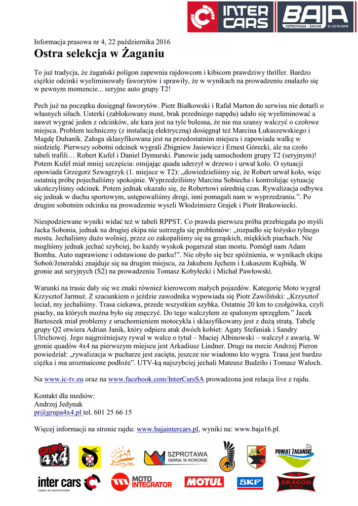 Informacja prasowa nr 4, 22 października 2016 Ostra selekcja w Żaganiu To już tradycja, że żagański poligon zapewnia rajdowcom i kibicom prawdziwy thriller. Bardzo ciężkie odcinki wyeliminowały faworytów i sprawiły, że w wynikach na prowadzeniu znalazło się w pewnym momencie... seryjne auto grupy T2! Pech już na początku dosięgnął faworytów. Piotr Białkowski i Rafał Marton do serwisu nie dotarli o własnych siłach. Usterki (zablokowany most, brak przedniego napędu) udało się wyeliminować a nawet wygrać jeden z odcinków, ale kara jest na tyle bolesna, że nie ma szansy walczyć o czołowe miejsca. Problem techniczny (z instalacją elektryczną) dosięgnął też Marcina Łukaszewskiego i Magdę Duhanik. Załoga sklasyfikowana jest na przedostatnim miejscu i zapowiada walkę w niedzielę. Pierwszy sobotni odcinek wygrali Zbigniew Jasiewicz i Ernest Górecki, ale na czoło tabeli trafili… Robert Kufel i Daniel Dymurski. Panowie jadą samochodem grupy T2 (seryjnym)! Potem Kufel miał mniej szczęścia: omijając quada uderzył w drzewo i urwał koło. O sytuacji opowiada Grzegorz Szwagrzyk (1. miejsce w T2): „dowiedzieliśmy się, że Robert urwał koło, więc ostatnią próbę pojechaliśmy spokojnie. Wyprzedziliśmy Marcina Sobiecha i kontrolując sytuację ukończyliśmy odcinek. Potem jednak okazało się, że Robertowi uśrednią czas. Rywalizacja odbywa się jednak w duchu sportowym, ustępowaliśmy drogi, inni pomagali nam w wyprzedzaniu.”. Po drugim sobotnim odcinku na prowadzenie wyszli Włodzimierz Grajek i Piotr Brakowiecki. Niespodziewane wyniki widać też w tabeli RPPST. Co prawda pierwsza próba przebiegała po myśli Jacka Sobonia, jednak na drugiej ekipa nie ustrzegła się problemów: „rozpadło się łożysko tylnego mostu. Jechaliśmy dużo wolniej, przez co zakopaliśmy się na grząskich, miękkich piachach. Nie mogliśmy jednak jechać szybciej, bo każdy wyskok pogarszał stan mostu. Pomógł nam Adam Bomba. Auto naprawione i odstawione do parku!”. Nie obyło się bez spóźnienia, w wynikach ekipa Soboń/Jeneralski znajduje się na drugim miejscu, za Jakubem Jęchem i Łukaszem Kujbidą. W gronie aut seryjnych (S2) na prowadzeniu Tomasz Kobyłecki i Michał Pawłowski. Warunki na trasie dały się we znaki również kierowcom małych pojazdów. Kategorię Moto wygrał Krzysztof Jarmuż. Z szacunkiem o jeździe zawodnika wypowiada się Piotr Zawiliński: „Krzysztof leciał, my jechaliśmy. Trasa ciekawa, przede wszystkim szybka. Ostatnie 20 km to czołgówka, czyli piachy, na których można było się zmęczyć. Do tego walczyłem ze spalonym sprzęgłem.” Jacek Bartoszek miał problemy z uruchomieniem motocykla i sklasyfikowany jest z dużą stratą. Tabelę grupy Q2 otwiera Adrian Janik, który odpiera atak dwóch kobiet: Agaty Stefaniak i Sandry Ulrichowej. Jego najgroźniejszy rywal w walce o tytuł – Maciej Albinowski – walczył z awarią. W gronie quadów 4x4 na pierwszym miejscu jest Arkadiusz Lindner. Drugi na mecie Andrzej Pieron powiedział: „rywalizacja w pucharze jest zacięta, jeszcze nie wiadomo kto wygra. Trasa jest bardzo ciężka i ma urozmaicone podłoże”. UTV-ką najszybciej jechali Mateusz Budziło i Tomasz Waloch. Na www.ic-tv.eu oraz na www.facebook.com/InterCarsSA prowadzona jest relacja live z rajdu. Kontakt dla mediów: Andrzej Jedynak [email protected] tel. 601 25 66 15 Więcej informacji na stronie rajdu: www.bajaintercars.pl, wyniki na: www.baja16.pl.