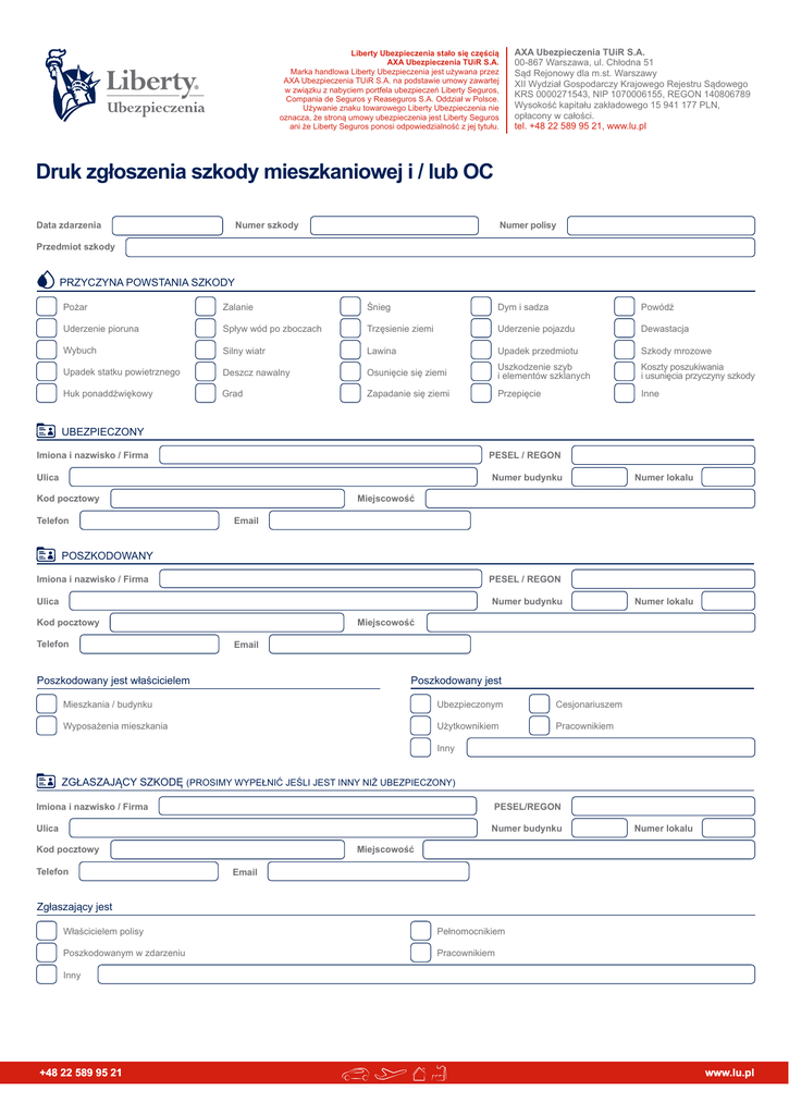 AXA Ubezpieczenia TUiR S.A. 00-867 Warszawa, ul. Chłodna 51 Sąd Rejonowy dla m.st. Warszawy XII Wydział Gospodarczy Krajowego Rejestru Sądowego KRS 0000271543, NIP 1070006155, REGON 140806789 Wysokość kapitału zakładowego 15 941 177 PLN, opłacony w całości. tel. +48 22 589 95 21, www.lu.pl Liberty Ubezpieczenia stało się częścią AXA Ubezpieczenia TUiR S.A. Marka handlowa Liberty Ubezpieczenia jest używana przez AXA Ubezpieczenia TUiR S.A. na podstawie umowy zawartej w związku z nabyciem portfela ubezpieczeń Liberty Seguros, Compania de Seguros y Reaseguros S.A. Oddział w Polsce. Używanie znaku towarowego Liberty Ubezpieczenia nie oznacza, że stroną umowy ubezpieczenia jest Liberty Seguros ani że Liberty Seguros ponosi odpowiedzialność z jej tytułu. Druk zgłoszenia szkody mieszkaniowej i / lub OC Numer szkody Data zdarzenia Numer polisy Przedmiot szkody PRZYCZYNA POWSTANIA SZKODY Pożar Zalanie Śnieg Dym i sadza Powódź Uderzenie pioruna Spływ wód po zboczach Trzęsienie ziemi Uderzenie pojazdu Dewastacja Wybuch Silny wiatr Lawina Upadek przedmiotu Szkody mrozowe Koszty poszukiwania i usunięcia przyczyny szkody Inne Upadek statku powietrznego Deszcz nawalny Osunięcie się ziemi Uszkodzenie szyb i elementów szklanych Huk ponaddźwiękowy Grad Zapadanie się ziemi Przepięcie UBEZPIECZONY Imiona i nazwisko / Firma PESEL / REGON Ulica Numer budynku Kod pocztowy Telefon Numer lokalu Miejscowość Email POSZKODOWANY Imiona i nazwisko / Firma PESEL / REGON Ulica Numer budynku Kod pocztowy Telefon Numer lokalu Miejscowość Email Poszkodowany jest Poszkodowany jest właścicielem Mieszkania / budynku Ubezpieczonym Cesjonariuszem Wyposażenia mieszkania Użytkownikiem Pracownikiem Inny ZGŁASZAJĄCY SZKODĘ (PROSIMY WYPEŁNIĆ JEŚLI JEST INNY NIŻ UBEZPIECZONY) Imiona i nazwisko / Firma PESEL/REGON Ulica Numer budynku Kod pocztowy Telefon Numer lokalu Miejscowość Email Zgłaszający jest Właścicielem polisy Pełnomocnikiem Poszkodowanym w zdarzeniu Pracownikiem Inny +48 22 589 95 21 www.lu.pl ŚWIADEK ZDARZENIA (PROSIMY O PODANIE DANYCH OSOBOWYCH, ADRESOWYCH ORAZ NUMERÓW KONTAKTOWYCH SWIADKÓW) OPIS ZDARZENIA OPIS AKCJI RATOWNICZEJ SŁUŻBY I INSTYTUCJE POINFORMOWANE O ZDARZENIU Policja Data poinformowania Adres Pogotowie Data poinformowania Adres Straż pożarna Data poinformowania Adres Zarządca Data poinformowania Adres Inne Data poinformowania Adres DODATKOWE INFORMACJE Czy uszkodzone mienie jest objęte innym ubezpieczeniem? tak nie Czy z tytułu tej szkody otrzymano odszkodowanie? tak nie Czy zgłoszono tę szkodę? tak nie Czy Poszkodowany jest płatnikiem VAT? tak nie WYKAZ ROSZCZENIA (M. IN. UTRACONEGO MIENIA) OŚWIADCZENIE O SPOSOBIE ODBIORU ODSZKODOWANIA Przelew bankowy na rachunek Czytelny podpis Przekaz pocztowy Wyrażam zgodę na przetwarzanie moich danych osobowych przez AXA Ubezpieczenia TUiR S.A. w celu wywiązania się z zwartej umowy ubezpieczenia zgodnie z ustawą z dnia 29 sierpnia 1997 roku o ochronie danych osobowych (Dz.U. z 2002 r., nr 101, poz. 926 z późn. zm.) Administratorem danych osobowych jest AXA Ubezpieczenia Towarzystwo Ubezpieczeń i Reasekuracji S.A., ul. Chłodna 51, 00-867 Warszawa. Posiada Pan/Pani prawo dostępu do treści danych oraz ich poprawiania. Podanie przez Pana/Panią danych osobowych jest dobrowolne. +48 22 589 95 21 Czytelny podpis www.lu.pl
