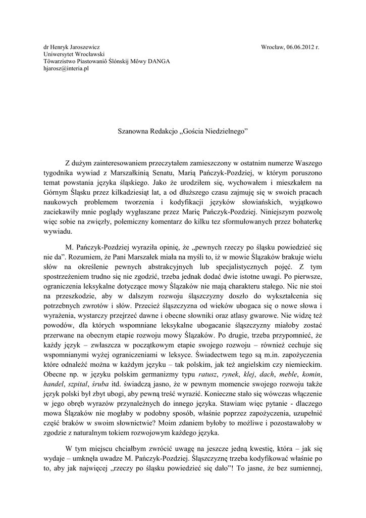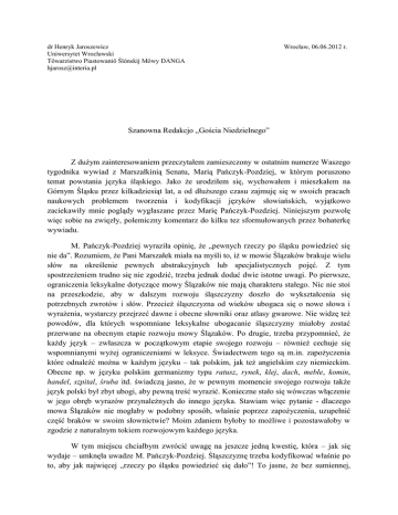 dr Henryk Jaroszewicz Uniwersytet Wrocławski Tôwarzistwo Piastowaniô Ślónskij Môwy DANGA [email protected] Wrocław, 06.06.2012 r. Szanowna Redakcjo „Gościa Niedzielnego” Z dużym zainteresowaniem przeczytałem zamieszczony w ostatnim numerze Waszego tygodnika wywiad z Marszałkinią Senatu, Marią Pańczyk-Pozdziej, w którym poruszono temat powstania języka śląskiego. Jako że urodziłem się, wychowałem i mieszkałem na Górnym Śląsku przez kilkadziesiąt lat, a od dłuższego czasu zajmuję się w swoich pracach naukowych problemem tworzenia i kodyfikacji języków słowiańskich, wyjątkowo zaciekawiły mnie poglądy wygłaszane przez Marię Pańczyk-Pozdziej. Niniejszym pozwolę więc sobie na zwięzły, polemiczny komentarz do kilku tez sformułowanych przez bohaterkę wywiadu. M. Pańczyk-Pozdziej wyraziła opinię, że „pewnych rzeczy po śląsku powiedzieć się nie da”. Rozumiem, że Pani Marszałek miała na myśli to, iż w mowie Ślązaków brakuje wielu słów na określenie pewnych abstrakcyjnych lub specjalistycznych pojęć. Z tym spostrzeżeniem trudno się nie zgodzić, trzeba jednak dodać dwie istotne uwagi. Po pierwsze, ograniczenia leksykalne dotyczące mowy Ślązaków nie mają charakteru stałego. Nic nie stoi na przeszkodzie, aby w dalszym rozwoju śląszczyzny doszło do wykształcenia się potrzebnych zwrotów i słów. Przecież śląszczyzna od wieków ubogaca się o nowe słowa i wyrażenia, wystarczy przejrzeć dawne i obecne słowniki oraz atlasy gwarowe. Nie widzę też powodów, dla których wspomniane leksykalne ubogacanie śląszczyzny miałoby zostać przerwane na obecnym etapie rozwoju mowy Ślązaków. Po drugie, trzeba przypomnieć, że każdy język – zwłaszcza w początkowym etapie swojego rozwoju – również cechuje się wspomnianymi wyżej ograniczeniami w leksyce. Świadectwem tego są m.in. zapożyczenia które odnaleźć można w każdym języku – tak polskim, jak też angielskim czy niemieckim. Obecne np. w języku polskim germanizmy typu ratusz, rynek, klej, dach, meble, komin, handel, szpital, śruba itd. świadczą jasno, że w pewnym momencie swojego rozwoju także język polski był zbyt ubogi, aby pewną treść wyrazić. Konieczne stało się wówczas włączenie w jego obręb wyrazów przynależnych do innego języka. Stawiam więc pytanie - dlaczego mowa Ślązaków nie mogłaby w podobny sposób, właśnie poprzez zapożyczenia, uzupełnić część braków w swoim słownictwie? Moim zdaniem byłoby to możliwe i pozostawałoby w zgodzie z naturalnym tokiem rozwojowym każdego języka. W tym miejscu chciałbym zwrócić uwagę na jeszcze jedną kwestię, która – jak się wydaje – umknęła uwadze M. Pańczyk-Pozdziej. Śląszczyznę trzeba kodyfikować właśnie po to, aby jak najwięcej „rzeczy po śląsku powiedzieć się dało”! To jasne, że bez sumiennej, przemyślanej i planowej pracy kodyfikatorów, bez wydawania słowników oraz gramatyk możliwości wyrażania istniejące w języku śląskim będą niezadowalające. Można przy tym zauważyć, że konieczność prowadzenia tychże działań dotyczy nie tylko powstającego języka śląskiego, ale też innych już skodyfikowanych języków, w tym polskiego. O ileż uboższa byłaby polszczyzna, gdyby nie trud całych zastępów badaczy i leksykografów, którzy przez dziesiątki lat wydawali – i wciąż wydają – słowniki, poradniki językowe, gramatyki języka polskiego itd. M. Pańczyk-Pozdziej udzielając wywiadu podkreśliła, że obszar Śląska cechuje spora językowa różnorodność, czasem tak duża, że osoby mówiące poszczególnymi śląskimi gwarami, mogą mieć problemy ze wzajemnym porozumieniem. Tym samym, powołanie do życia jednego ogólnośląskiego, standardowego języka – jej zdaniem – skończyć się musi stworzeniem jakiegoś sztucznego tworu, swoistego rodzaju „śląskiego esperanto”, będącego w rzeczywistości mieszaniną śląskich gwar. Uwadze M. Pańczyk-Pozdziej umyka jednak jeden dość prozaiczny fakt. Różnice istniejące pomiędzy poszczególnymi polskimi gwarami oraz dialektami są jeszcze większe, a mimo to ogólnopolski język standardowy udało się powołać do życia! Co ważne, jest to język akceptowany przez swoich użytkowników, świetnie się rozwijający, którego sensu istnienia nikt dzisiaj nie kwestionuje. Nikt też nie nazywa polszczyzny „polskim esperanto”. Skoro pomimo tej gwarowo-dialektalnej różnorodności udało się stworzyć standardową formę języka polskiego, dlaczego miałoby się to nie udać na – o wiele mniejszym od Polski – obszarze Śląska? Jestem przekonany, że jeśli my, Ślązacy, wykażemy się cierpliwością i rozwagą, otwartością na głos lokalnej wspólnoty jak i argumenty naukowców, to standard języka śląskiego może powstać stosunkowo szybko i zostać zaakceptowany przez szerokie masy Ślązaków. Uważam, że pomocne w tych działaniach mogą być doświadczenia Kaszubów, czy też nieco odleglejszych nam geograficznie Macedończyków i Chorwatów, którzy pomimo istnienia zróżnicowanego gwarowo i dialektalnie podłoża zdołali – i to całkiem niedawno – z powodzeniem ukształtować standardową formę swojego języka. Jasne jest, że norma języka śląskiego zapisana i skodyfikowany w słownikach będzie się różniła od języka używanego w śląskim domu, czy na śląskiej ulicy. Ale nie należy się obawiać rozdźwięku pomiędzy wzorcową formą języka zapisaną w gramatykach, a formą języka, która będzie występowała w potocznej, codziennej komunikacji. Te różnice są czymś naturalnym i dotyczą każdego języka – w tym polskiego. Przecież jasne jest, że przeciętny mieszkaniec Podlasia, Kujaw, Podhala czy Wielkopolski w codziennym życiu nie posługuje się wiernie tą odmianą polszczyzny, która rozbrzmiewa z odbiorników radiowych, której znajomość wymagana jest w urzędach, która 