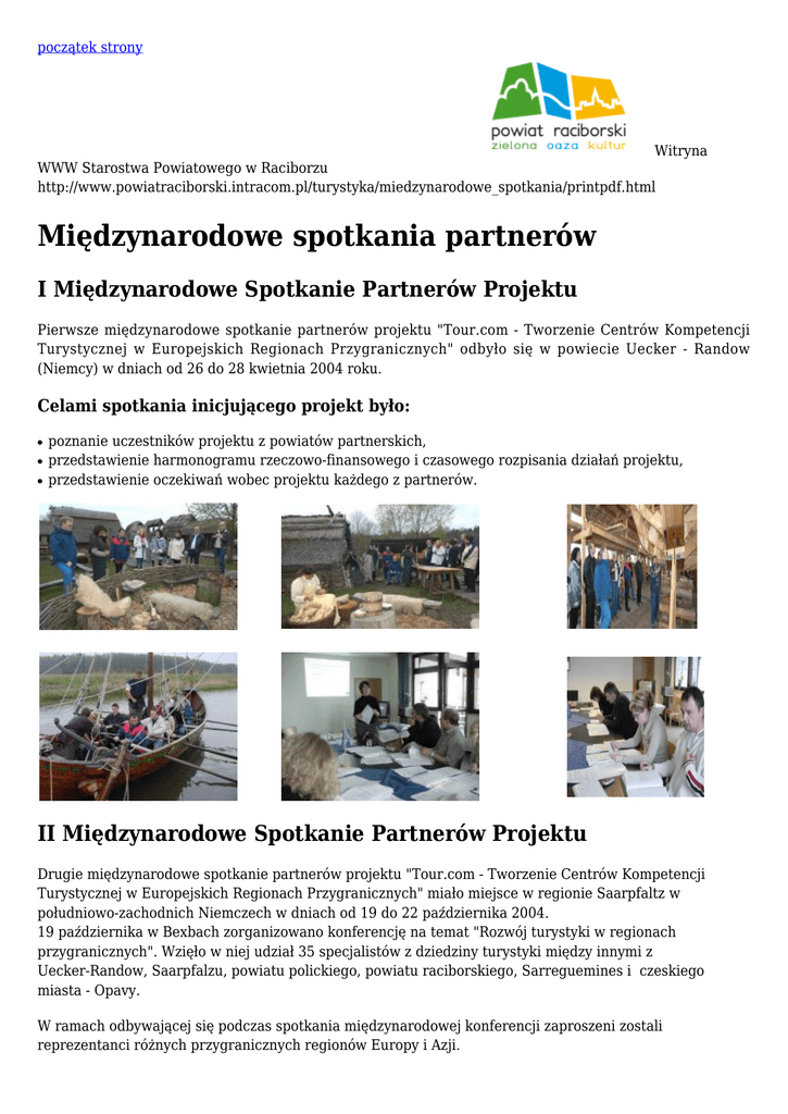 początek strony Witryna WWW Starostwa Powiatowego w Raciborzu http://www.powiatraciborski.intracom.pl/turystyka/miedzynarodowe_spotkania/printpdf.html Międzynarodowe spotkania partnerów I Międzynarodowe Spotkanie Partnerów Projektu Pierwsze międzynarodowe spotkanie partnerów projektu "Tour.com - Tworzenie Centrów Kompetencji Turystycznej w Europejskich Regionach Przygranicznych" odbyło się w powiecie Uecker - Randow (Niemcy) w dniach od 26 do 28 kwietnia 2004 roku. Celami spotkania inicjującego projekt było: ● ● ● poznanie uczestników projektu z powiatów partnerskich, przedstawienie harmonogramu rzeczowo-finansowego i czasowego rozpisania działań projektu, przedstawienie oczekiwań wobec projektu każdego z partnerów. II Międzynarodowe Spotkanie Partnerów Projektu Drugie międzynarodowe spotkanie partnerów projektu "Tour.com - Tworzenie Centrów Kompetencji Turystycznej w Europejskich Regionach Przygranicznych" miało miejsce w regionie Saarpfaltz w południowo-zachodnich Niemczech w dniach od 19 do 22 października 2004. 19 października w Bexbach zorganizowano konferencję na temat "Rozwój turystyki w regionach przygranicznych". Wzięło w niej udział 35 specjalistów z dziedziny turystyki między innymi z Uecker-Randow, Saarpfalzu, powiatu polickiego, powiatu raciborskiego, Sarreguemines i czeskiego miasta - Opavy. W ramach odbywającej się podczas spotkania międzynarodowej konferencji zaproszeni zostali reprezentanci różnych przygranicznych regionów Europy i Azji. Zaprezentowali oni swoje projekty w aspekcie "dobrych praktyk" dla rozwoju turystyki w regionach przygranicznych i wymiany doświadczeń pomiędzy lokalnymi aktorami. I tak: ● ● ● ● Pan Weindl " Transgraniczne turystyczne trasy tematyczne - "Weinstraße" Dolnej Austrii, Południowej Morawii i Zachodniej Słowacji Pani Baumgärtner "Rozwój oferty turystycznej 2-Land. Rozwój, marketing i sprzedaż transgranicznych produktów turystycznych" Niemcy, Holandia Pan Mambetaliev "Rozwój turystyki transgranicznej w West-Tien-Shan" Kirgizja, Kazachstan, Uzbekistan Pan Gromov "Rozwój centrów informacji turystycznej w regionie Karelii" Oprócz prezentacji i dyskusji na temat nowych strategii rozwoju turystyki transgranicznej podczas spotkania zorganizowana został wycieczka prezentująca atrakcje turystyczne przygranicznego regionu Saarpfalz. III Międzynarodowe Spotkanie Partnerów Projektu Trzecie międzynarodowe spotkanie partnerów projektu "Tour.com - Tworzenie Centrów Kompetencji Turystycznej w Europejskich Regionach Przygranicznych" odbyło się w Sarreguemines we Francji w dniach od 27 do 30 Kwietnia 2005 roku.