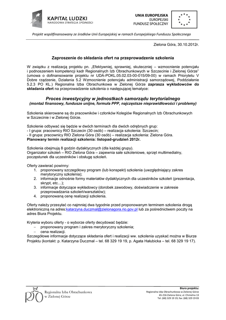 Projekt współfinansowany ze środków Unii Europejskiej w ramach Europejskiego Funduszu Społecznego Zielona Góra, 30.10.2012r. Zaproszenie do składania ofert na przeprowadzenie szkolenia W związku z realizacją projektu pn. „Efektywniej, sprawniej, skuteczniej – wzmocnienie potencjału i podnoszeniem kompetencji kadr Regionalnych Izb Obrachunkowych w Szczecinie i Zielonej Górze” (umowa o dofinansowanie projektu nr UDA-POKL.05.02.03-00-015/09-00) w ramach Priorytetu V Dobre rządzenie, Działania 5.2 Wzmocnienie potencjału administracji samorządowej, Poddziałanie 5.2.3 PO KL.) Regionalna Izba Obrachunkowa w Zielonej Górze zaprasza wykładowców do składania ofert na przeprowadzenie szkolenia o następującej tematyce: Proces inwestycyjny w jednostkach samorządu terytorialnego (montaż finansowy, fundusze unijne, formuła PPP, najczęstsze nieprawidłowości i problemy) Szkolenia skierowane są do pracowników i członków Kolegiów Regionalnych Izb Obrachunkowych w Szczecinie i w Zielonej Górze. Szkolenie odbywać się będzie w dwóch terminach dla dwóch odrębnych grup: - I grupa: pracownicy RIO Szczecin (30 osób) – realizacja szkolenia: Szczecin; - II grupa: pracownicy RIO Zielona Góra (30 osób) – realizacja szkolenia: Zielona Góra. Planowany termin realizacji szkolenia: listopad-grudzień 2012r. Szkolenia obejmują 8 godzin dydaktycznych (dla każdej grupy). Organizator szkoleń – RIO Zielona Góra – zapewnia sale szkoleniowe, sprzęt multimedialny, poczęstunek dla uczestników i obsługę szkoleń. Oferty zawierać powinny: 1. proponowany szczegółowy program (lub konspekt) szkolenia (uwzględniający zakres merytoryczny szkolenia); 2. informacje odnośnie formy materiałów dydaktycznych dla uczestników szkoleń (prezentacja, skrypt, etc…); 3. informacje dotyczące wykładowcy (dorobek zawodowy, doświadczenie w zakresie przeprowadzania szkoleń/warsztatów); 4. proponowaną cenę realizacji szkolenia. Oferty należy przesyłać co najmniej dwa tygodnie przed proponowanym terminem szkolenia drogą elektroniczną na adres:[email protected] lub za pośrednictwem poczty na adres Biura Projektu. Kryteria wyboru oferty - o wyborze oferty decydować będzie: proponowany program i zakres merytoryczny szkolenia; cena realizacji. Szczegółowe informacje dotyczące składania ofert i realizacji ww. szkolenia uzyskać można w Biurze Projektu (kontakt: p. Katarzyna Duczmal – tel. 68 329 19 19, p. Agata Hałubicka – tel. 68 329 19 17). Regionalna Izba Obrachunkowa w Zielonej Górze Biuro projektu: Regionalna Izba Obrachunkowa w Zielonej Górze 65-216 Zielona Góra; ul. Chmielna 13 Tel. (68) 329 19 19; fax: (68) 329 19 03