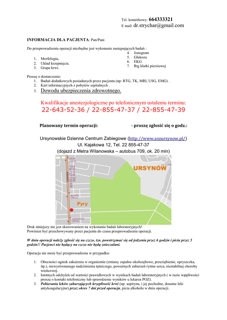 Tel. komórkowy: 664333321 E mail: [email protected] INFORMACJA DLA PACJENTA: Pan/Pani Do przeprowadzenia operacji niezbędne jest wykonanie następujących badań : 4. Jonogram 5. Glukoza 1. Morfologia. 6. EKG 2. Układ krzepnięcia. 7. Rtg klatki piersiowej 3. Grupa krwi. Proszę o dostarczenie: 1. Badań dodatkowych posiadanych przez pacjenta (np: RTG, TK, MRI, USG, EMG) . 2. Kart informacyjnych z pobytów szpitalnych . 3. Dowodu ubezpieczenia zdrowotnego. Kwalifikacje anestezjologiczne po telefonicznym ustaleniu terminu: 22-643-52-36 / 22-855-47-37 / 22-855-47-39 Planowany termin operacji: - proszę zgłosić się o godz.: Ursynowskie Dzienne Centrum Zabiegowe (http://www.zozursynow.pl/) Ul. Kajakowa 12, Tel. 22 855-47-37 (dojazd z Metra Wilanowska – autobus 709, ok. 20 min) Druk niniejszy nie jest skierowaniem na wykonanie badań laboratoryjnych! Powinien być przechowywany przez pacjenta do czasu przeprowadzenia operacji. W dniu operacji należy zgłosić się na czczo, tzn. powstrzymać się od jedzenia przez 6 godzin i picia przez 5 godzin!! Pacjenci nie będący na czczo nie będą znieczulani. Operacja nie może być przeprowadzona w przypadku: 1. 2. 3. Obecności ognisk zakażenia w organizmie (zmiany zapalne okołozębowe, przeziębienie, opryszczka, itp.), niewyrównanego nadciśnienia tętniczego, poważnych zaburzeń rytmu serca, niestabilnej choroby wieńcowej. Istotnych odchyleń od wartości prawidłowych w wynikach badań laboratoryjnych ( w razie wątpliwości proszę o kontakt telefoniczny lub sprawdzenie wyników u lekarza POZ). Pobierania leków zaburzających krzepliwość krwi (np. aspiryna, i jej pochodne, doustne leki antykoagulacyjne) przez okres 7 dni przed operacja, picia alkoholu w dniu operacji.