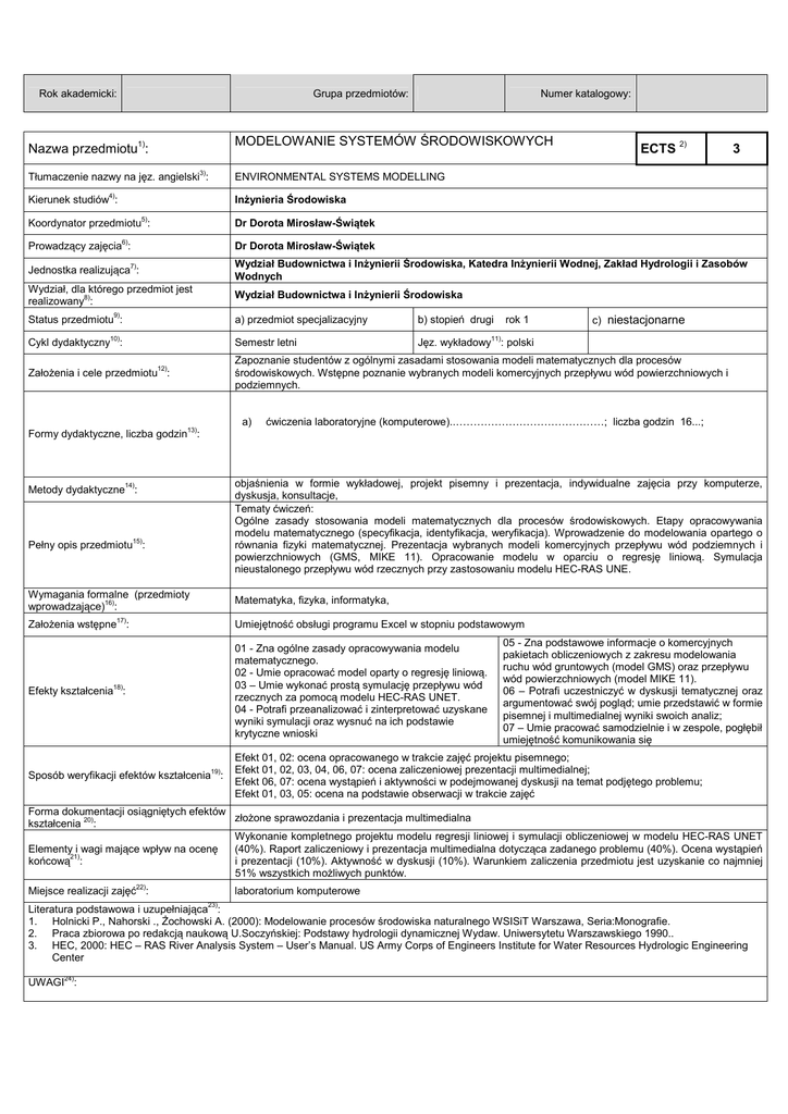 Rok akademicki: Grupa przedmiotów: Numer katalogowy: MODELOWANIE SYSTEMÓW ŚRODOWISKOWYCH Nazwa przedmiotu1): Tłumaczenie nazwy na jęz. angielski3): ECTS 2) 3 ENVIRONMENTAL SYSTEMS MODELLING 4) Inżynieria Środowiska Kierunek studiów : 5) Dr Dorota Mirosław-Świątek Koordynator przedmiotu : Prowadzący zajęcia6): Dr Dorota Mirosław-Świątek Jednostka realizująca : Wydział Budownictwa i Inżynierii Środowiska, Katedra Inżynierii Wodnej, Zakład Hydrologii i Zasobów Wodnych Wydział, dla którego przedmiot jest realizowany8): Wydział Budownictwa i Inżynierii Środowiska Status przedmiotu9): a) przedmiot specjalizacyjny 7) 10) b) stopień drugi rok 1 c) niestacjonarne 11) Cykl dydaktyczny : Semestr letni Założenia i cele przedmiotu12): Zapoznanie studentów z ogólnymi zasadami stosowania modeli matematycznych dla procesów środowiskowych. Wstępne poznanie wybranych modeli komercyjnych przepływu wód powierzchniowych i podziemnych. a) Formy dydaktyczne, liczba godzin13): Jęz. wykładowy : polski ćwiczenia laboratoryjne (komputerowe)..……………………………………; liczba godzin 16...; objaśnienia w formie wykładowej, projekt pisemny i prezentacja, indywidualne zajęcia przy komputerze, dyskusja, konsultacje, Tematy ćwiczeń: Ogólne zasady stosowania modeli matematycznych dla procesów środowiskowych. Etapy opracowywania modelu matematycznego (specyfikacja, identyfikacja, weryfikacja). Wprowadzenie do modelowania opartego o równania fizyki matematycznej. Prezentacja wybranych modeli komercyjnych przepływu wód podziemnych i powierzchniowych (GMS, MIKE 11). Opracowanie modelu w oparciu o regresję liniową. Symulacja nieustalonego przepływu wód rzecznych przy zastosowaniu modelu HEC-RAS UNE. Metody dydaktyczne14): Pełny opis przedmiotu15): Wymagania formalne (przedmioty wprowadzające)16): Matematyka, fizyka, informatyka, 17) Założenia wstępne : Umiejętność obsługi programu Excel w stopniu podstawowym Efekty kształcenia18): 01 - Zna ogólne zasady opracowywania modelu matematycznego. 02 - Umie opracować model oparty o regresję liniową. 03 – Umie wykonać prostą symulację przepływu wód rzecznych za pomocą modelu HEC-RAS UNET. 04 - Potrafi przeanalizować i zinterpretować uzyskane wyniki symulacji oraz wysnuć na ich podstawie krytyczne wnioski 19) Sposób weryfikacji efektów kształcenia : 05 - Zna podstawowe informacje o komercyjnych pakietach obliczeniowych z zakresu modelowania ruchu wód gruntowych (model GMS) oraz przepływu wód powierzchniowych (model MIKE 11). 06 – Potrafi uczestniczyć w dyskusji tematycznej oraz argumentować swój pogląd; umie przedstawić w formie pisemnej i multimedialnej wyniki swoich analiz; 07 – Umie pracować samodzielnie i w zespole, pogłębił umiejętność komunikowania się Efekt 01, 02: ocena opracowanego w trakcie zajęć projektu pisemnego; Efekt 01, 02, 03, 04, 06, 07: ocena zaliczeniowej prezentacji multimedialnej; Efekt 06, 07: ocena wystąpień i aktywności w podejmowanej dyskusji na temat podjętego problemu; Efekt 01, 03, 05: ocena na podstawie obserwacji w trakcie zajęć Forma dokumentacji osiągniętych efektów złożone sprawozdania i prezentacja multimedialna kształcenia 20): Wykonanie kompletnego projektu modelu regresji liniowej i symulacji obliczeniowej w modelu HEC-RAS UNET Elementy i wagi mające wpływ na ocenę (40%). Raport zaliczeniowy i prezentacja multimedialna dotycząca zadanego problemu (40%). Ocena wystąpień końcową21): i prezentacji (10%). Aktywność w dyskusji (10%). Warunkiem zaliczenia przedmiotu jest uzyskanie co najmniej 51% wszystkich możliwych punktów. Miejsce realizacji zajęć22): laboratorium komputerowe Literatura podstawowa i uzupełniająca23): 1. Holnicki P., Nahorski ., Żochowski A. (2000): Modelowanie procesów środowiska naturalnego WSISiT Warszawa, Seria:Monografie. 2. Praca zbiorowa po redakcją naukową U.Soczyńskiej: Podstawy hydrologii dynamicznej Wydaw. Uniwersytetu Warszawskiego 1990.. 3. HEC, 2000: HEC – RAS River Analysis System – User’s Manual. US Army Corps of Engineers Institute for Water Resources Hydrologic Engineering Center UWAGI24): Wskaźniki ilościowe charakteryzujące moduł/przedmiot25) : Szacunkowa sumaryczna liczba godzin pracy studenta (kontaktowych i pracy własnej) niezbędna dla osiągnięcia zakładanych efektów kształcenia18) - na tej podstawie należy wypełnić pole ECTS2: 60 h Łączna liczba punktów ECTS, którą student uzyskuje na zajęciach wymagających bezpośredniego udziału nauczycieli akademickich: 1,5 ECTS Łączna liczba punktów ECTS, którą student uzyskuje w ramach zajęć o charakterze praktycznym, takich jak zajęcia laboratoryjne, projektowe, itp.: 1,5 ECTS Tabela zgodności kierunkowych efektów kształcenia efektami przedmiotu 26) Nr /symbol efektu 01 Wymienione w wierszu efekty kształcenia: Zna ogólne zasady i etapy opracowywania modelu matematycznego Odniesienie do efektów dla programu kształcenia na kierunku K_W12 02 Umie opracować model oparty o regresję liniową K_U05 03 Umie wykonać prostą symulację przepływu wód rzecznych za pomocą modelu HEC-RAS K_W01, K_U05 UNET. 04 Potrafi przeanalizować i zinterpretować uzyskane wyniki symulacji oraz wysnuć na ich 05 Zna podstawowe informacje o komercyjnych pakietach obliczeniowych z zakresu 06 Potrafi uczestniczyć w dyskusji tematycznej oraz argumentować swój pogląd; umie 07 Umie pracować samodzielnie i w zespole, pogłębił umiejętność komunikowania się K_U01, K_U05, K_K03 podstawie krytyczne wnioski K_W12, modelowania ruchu wód gruntowych oraz przepływu wód powierzchniowych. K_K03; K_K07 przedstawić w formie pisemnej i multimedialnej wyniki swoich analiz; K_K02; K_K06; K_K07;