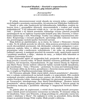 Krzysztof Masłoń – Powieść o wspominaniu młodości, gdy miasto płonie „Rzeczpospolita” nr z 26 września 2008 r. W pełnej, nieocenzurowanej wersji ukazała się wreszcie jedna z najpiękniejszych książek o powstaniu warszawskim. Jej autorem jest Władysław Zambrzycki. Zmarły w 1962 roku Zambrzycki był dziennikarzem, bibliofilem, erudytą ciekawym życia i „przypadków dziwnych, niezrozumiałych, z trudem pod zmysły podpadających”. Z tej ciekawości wzięła się ta – po raz pierwszy wydana w 1959 roku – powieść o 63 dniach powstania widzianego oczyma czterech przyjaciół spotykających się na zapleczu wypożyczalni książek przy ulicy Żurawiej, w mieszkaniu najstarszego z nich, Wincentego. Trudny czas zabijają wspominaniem młodości. Rozprawiają o rzeczach pogodnych, opowiadają sobie cudaczne wydarzenia, przestrzegając czystości języka i harmonii narracji. Mają dobrze po pięćdziesiątce, są za starzy, by walczyć z Niemcami z bronią w ręku. Na ile jednak pozwala im zdrowie, służą pomocą powstańcom świadomi swych obywatelskich powinności. Jak Afrykander, ochotniczy pielęgniarz w powstańczym szpitalu, który w obliczu zagrożenia życia ciężko rannego żołnierza przypomina sobie o medycznym wykształceniu i nie waha się przeprowadzić (udanej!) operacji. A następnie powrócić do noszenia wody, opatrywania rannych i grzebania umarłych, a także... służenia do mszy, „w białym kitlu lekarskim ze znakiem Czerwonego Krzyża”. Gdy Afrykander zginie od snajperskiej kuli, przyjaciele na jego biodrach odkryją powróz z surowej wełny. W latach młodości wytrawny podróżnik i człowiek światowy, był tercjarzem, franciszkaninem. Po jego śmierci litanię do Najświętszej Marii Panny równie żarliwie odmawiać będzie rzymski katolik Qauadratus, jak muzułmanin – Tatar, i Wincenty – protestant. Ta scena jest kulminacją książki. Powstanie zbliża się do końca, gawędziarze z Żurawiej muszą opuścić Warszawę, w mogile na Wspólnej pozostawiając Afrykandera. Ich Warszawa spłonęła. Miała więcej takich „bożych pomyleńców”, ekscentryków w rodzaju wymienionych na kartach książki, a w poprzednich, PRL-owskich wydaniach powieści wykreślanych przez cenzora, jak choćby dziennikarza Aleksandra Powojczyka (właśc. Antoniego Goldringa) czy pierwszego prezesa Polskiego Towarzystwa Astrologicznego Jana Starży-Dzierżbickiego. „Kwatera bożych pomyleńców” uderza elegancją jakże kontrastującą z tłem, w którym gotuje się powstańczą kaszę-pluj z jęczmienia odkrytego w magazynach browaru Haberbuscha. Za golenie płaci się papierosami, a wśród drzew fruwają kanarki powypuszczane z klatek przed wyruszeniem warszawian na tułaczkę. W nieznane udają się też Quadratus, Tatar i pan Wincenty, a drogę przebiega im „szkaradny czarny kot, mokry i ubabrany w błocie”. Nie najlepiej to wróży na przyszłość, którą określą stojące na praskim brzegu Wisły wojska. Miały przyjść z odsieczą...