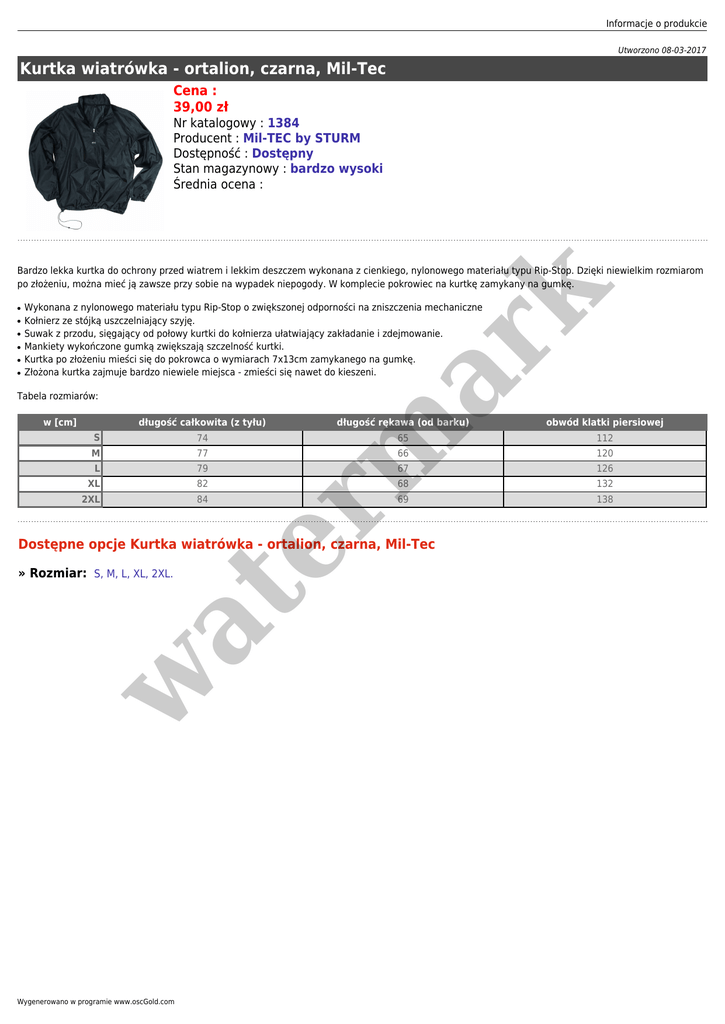 Informacje o produkcie Utworzono 08-03-2017 Kurtka wiatrówka - ortalion, czarna, Mil-Tec Cena : 39,00 zł Nr katalogowy : 1384 Producent : Mil-TEC by STURM Dostępność : Dostępny Stan magazynowy : bardzo wysoki Średnia ocena : ● ● ● ● ● ● er m ar k Bardzo lekka kurtka do ochrony przed wiatrem i lekkim deszczem wykonana z cienkiego, nylonowego materiału typu Rip-Stop. Dzięki niewielkim rozmiarom po złożeniu, można mieć ją zawsze przy sobie na wypadek niepogody. W komplecie pokrowiec na kurtkę zamykany na gumkę. Wykonana z nylonowego materiału typu Rip-Stop o zwiększonej odporności na zniszczenia mechaniczne Kołnierz ze stójką uszczelniający szyję. Suwak z przodu, sięgający od połowy kurtki do kołnierza ułatwiający zakładanie i zdejmowanie. Mankiety wykończone gumką zwiększają szczelność kurtki. Kurtka po złożeniu mieści się do pokrowca o wymiarach 7x13cm zamykanego na gumkę. Złożona kurtka zajmuje bardzo niewiele miejsca - zmieści się nawet do kieszeni. Tabela rozmiarów: w [cm] długość całkowita (z tyłu) długość rękawa (od barku) obwód klatki piersiowej S 74 65 112 M 77 66 120 L 79 67 126 XL 82 68 132 2XL 84 69 138 Dostępne opcje Kurtka wiatrówka - ortalion, czarna, Mil-Tec w at » Rozmiar: S, M, L, XL, 2XL. Wygenerowano w programie www.oscGold.com