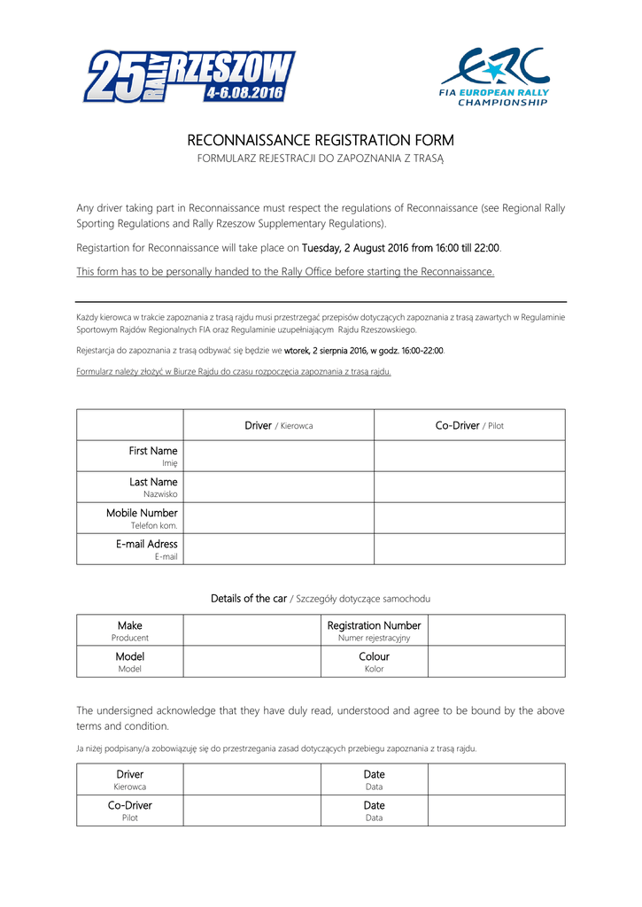 RECONNAISSANCE REGISTRATION FORM FORMULARZ REJESTRACJI DO ZAPOZNANIA Z TRASĄ Any driver taking part in Reconnaissance must respect the regulations of Reconnaissance (see Regional Rally Sporting Regulations and Rally Rzeszow Supplementary Regulations). Registartion for Reconnaissance will take place on Tuesday, 2 August 2016 from 16:00 till 22:00. This form has to be personally handed to the Rally Office before starting the Reconnaissance. Każdy kierowca w trakcie zapoznania z trasą rajdu musi przestrzegać przepisów dotyczących zapoznania z trasą zawartych w Regulaminie Sportowym Rajdów Regionalnych FIA oraz Regulaminie uzupełniającym Rajdu Rzeszowskiego. Rejestarcja do zapoznania z trasą odbywać się będzie we wtorek, 2 sierpnia 2016, w godz. 16:00-22:00. Formularz należy złożyć w Biurze Rajdu do czasu rozpoczęcia zapoznania z trasą rajdu. Driver / Kierowca Co-Driver / Pilot First Name Imię Last Name Nazwisko Mobile Number Telefon kom. E-mail Adress E-mail Details of the car / Szczegóły dotyczące samochodu Make Registration Number Producent Numer rejestracyjny Model Colour Model Kolor The undersigned acknowledge that they have duly read, understood and agree to be bound by the above terms and condition. Ja niżej podpisany/a zobowiązuję się do przestrzegania zasad dotyczących przebiegu zapoznania z trasą rajdu. Driver Date Kierowca Data Co-Driver Date Pilot Data