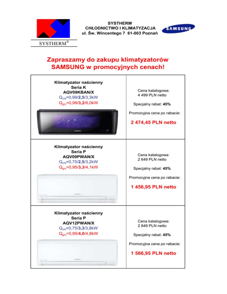 SYSTHERM CHŁODNICTWO I KLIMATYZACJA ul. Św. Wincentego 7 61-003 Poznań SYSTHERM Zapraszamy do zakupu klimatyzatorów SAMSUNG w promocyjnych cenach! Klimatyzator naścienny Seria K AQV09KBAN/X Qchł=0,99/2,5/3,3kW Qgrz=0,99/3,2/6,0kW Cena katalogowa: 4 499 PLN netto Specjalny rabat: 45% Promocyjna cena po rabacie: 2 474,45 PLN netto Klimatyzator naścienny Seria P AQV09PWAN/X Qchł=0,75/2,5/3,2kW Qgrz=0,95/3,3/4,1kW Cena katalogowa: 2 649 PLN netto Specjalny rabat: 45% Promocyjna cena po rabacie: 1 456,95 PLN netto Klimatyzator naścienny Seria P AQV12PWAN/X Qchł=0,75/3,3/3,8kW Qgrz=0,95/4,0/4,8kW Cena katalogowa: 2 849 PLN netto Specjalny rabat: 45% Promocyjna cena po rabacie: 1 566,95 PLN netto Klimatyzator naścienny Seria T AQ12TSBN/X Qchł=3,5kW Qgrz=3,8kW Cena katalogowa: 2 099 PLN netto Specjalny rabat: 45% Promocyjna cena po rabacie: 1 154,45 PLN netto Klimatyzator naścienny Seria T AQ18TSBN/X Qchł=5,2kW Qgrz=5,8kW Cena katalogowa: 3 099 PLN netto Specjalny rabat: 45% Promocyjna cena po rabacie: 1 704,45 PLN netto Klimatyzator naścienny Seria T AQ24TSBN/X Qchł=6,8kW Qgrz=7,0kW Cena katalogowa: 3 729 PLN netto Specjalny rabat: 45% Promocyjna cena po rabacie: 2 050,95 PLN netto Oferta ważna do wyczerpania zapasów magazynowych. Ceny nie zawierają podatku VAT (23%). W przypadku zamówienia prosimy o kontakt mailowy lub telefoniczny. Podczas zamówienia prosimy powołać się na powyższą promocję. Więcej informacji możecie Państwo uzyskać w Pracowni Klimatyzacji Systherm ChiK Sp. z o.o.: tel. 61 / 850 75 30; e-mail: [email protected]
