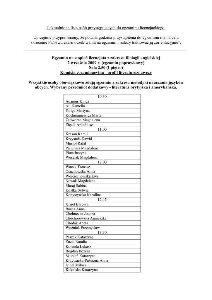 Uaktualniona lista osób przystępujących do egzaminu licencjackiego. Uprzejmie przypominamy, Ŝe podana godzina przystąpienia do egzaminu ma na celu skrócenie Państwu czasu oczekiwania na egzamin i naleŜy traktować ją „orientacyjnie”. Egzamin na stopień licencjata z zakresu filologii angielskiej 2 września 2009 r. (egzamin poprawkowy) Sala 2.50 (I piętro) Komisja egzaminacyjna - profil literaturoznawczy Wszystkie osoby obowiązkowo zdają egzamin z zakresu metodyki nauczania języków obcych. Wybrany przedmiot dodatkowy - literatura brytyjska i amerykańska. 10:30 Adamus Kinga Ali Kamelia Paliga Martyna Kochmaniewicz Marta Zadworna Magdalena Zięcik Arkadiusz 11:00 Krasoń Kamil Krzystała Dawid Musioł Rafał Pierchała Magdalena Pluta Justyna Weselak Magdalena 12:00 Wacek Tomasz Osuchowska Anna Wojciechowska Ewa Nowak Magdalena Maraj Sabina Kostka Sylwia Kopystyńska Karolina 12:45 Kisiel Barbara Burda Anna Chełmecka Joanna Chochorowska Agnieszka Chodak Aneta Woźniak Przemysław 13:30 Paszek Katarzyna Zuzia Natalia Kolenda Łukasz Bogdan BoŜena Skupień Katarzyna Krzywacka-Puścizna Anna Kinel Miłosz Kukulska Katarzyna Egzamin na stopień licencjata z zakresu filologii angielskiej 2 września 2009 r. (egzamin poprawkowy) Sale 2.51 + 2.55 (I piętro) Komisje egzaminacyjne - profil językoznawczy Wszystkie osoby obowiązkowo zdają egzamin z zakresu metodyki nauczania języków obcych. Wybrany przedmiot dodatkowy – językoznawstwo. 10:00 Grzesica ElŜbieta Durlak Joanna Bąk Marta Rachwał Iwona Wiśniewski Krzysztof Sikora Agnieszka Otrębska Malwina Popczyk Agnieszka Baryłka Magdalena Woźniak Aleksandra Dyrda Paweł Goniszewska Dorota Kupczyńska Małgorzata Bereza Diana Geisler Małgorzata Gozdek Monika Sojka Daria Hercuń Małgorzata Jokel Honorata Sosna Ewa Rygielska Dominika Lędźwa Katarzyna Matysik Konrad Mścichecka Ewelina Niemyrycz Dagmara Nowicka Aneta Augustyn Angelika Buchcik Marta 11:15 Gąsior Malwina Mazur Joanna Pikulińska Katarzyna Kaczanowski Łukasz Uchacz Ewa Weissmann Robert Wojciechowska Anna Worek Agnieszka Aftanas Paulina Wójcik-Adnan Ewelina Przerwa 12:30-14:00 14:00 Kusak Regina Pawłowska Monika Baziak Aleksandra Binik Wioletta Boczuła Danuta Bogdał Agnieszka Bonarska Katarzyna BoŜek Anna Broszko Sabina Chudzik Iwona Cichoń Magdalena Ćwiek-Franczak Agnieszka Derewienko BoŜena Dembiczek-Banaś Magdalena Drabin Patrycja Fernandes Renata Filipiak Jolanta Florczak Marta Furmaniak Katarzyna Górka Urszula Grochmal Małgorzata Grochmal-Ras Alicja Łukaszczyk Wioletta Maciąg Małgorzata 15:00 Gul Agnieszka Hacuś Rafał Hebel Marta Herold Renata Hywel Małgorzata Jakubiszyn Joanna Jamrozik Jolanta Jedynak Małgorzata Jędrzejek Joanna Kiersztyn Monika Kmiecik Marta Kisz Wioletta Kotyła Joanna Król Krystyna Kruczek Mariola Krzywda Ewelina Abramczyk Marcin Leśniak Joanna Łuczka Joanna Grybel Ewelina Grybel Wioletta Malinowska-Mościszko Edyta Maniak Katarzyna Maślejak Mateusz Mastaj Katarzyna 16:00 Mazurek BoŜena Mazurkiewicz Justyna Morawska Aneta Naróg Agata Obrzut ElŜbieta Okoń Anna Orzech Aleksandra Pałka Magdalena Podlasek Dorota Pawlos Anna Pawlus-Zabiegała Małgorzata Baranowska Anita Pawłowski Jarosław Pelczar Jakub Penar Agnieszka Połomska Karolina Potrawska Katarzyna Prajzner Piotr Radnik Przemysław Rettinger Zuzanna Rycyk ElŜbieta Sekuła Daniel Serocka Dorota Serwińska Marzena Siwiec Agata 17:00 Skotnicka Lidia Skwarczyńska Monika Sorbat Aneta Spólnik Ewelina Stecura Justyna Surowiec Agata Szamraj Mariusz Szczerba Gabriela Szopa Agnieszka Szymkaruk Monika Świerczek Aleksandra Tokarczyk BoŜena Węglarz Joanna Węgrzyn Natalia Wojdyło Marta Wojnarowski Mateusz Wojtoń Monika Zielińska-Kudła Jolanta śyguła Magdalena Lenartowicz-Cieślik Aldona Słomczyński Dariusz Buczek Gabriela Maciaś Grzegorz Wojtasik Ewa Krupska Magdalena