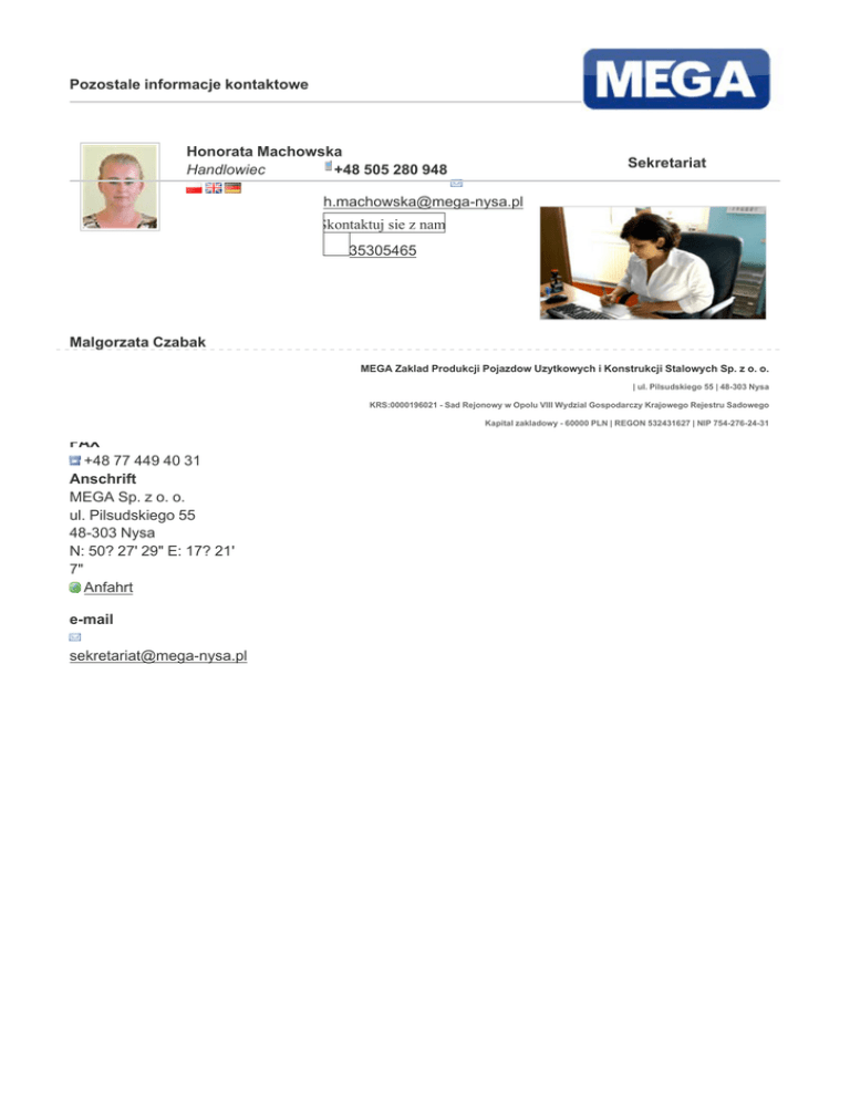 Pozostale informacje kontaktowe Honorata Machowska Handlowiec +48 505 280 948 Sekretariat [email protected] Skontaktuj sie z nami 35305465 Malgorzata Czabak Telefon +48 77 449 40 30 +48 77 449 42 65 MEGA Zaklad Produkcji Pojazdow Uzytkowych i Konstrukcji Stalowych Sp. z o. o. | ul. Pilsudskiego 55 | 48-303 Nysa KRS:0000196021 - Sad Rejonowy w Opolu VIII Wydzial Gospodarczy Krajowego Rejestru Sadowego Kapital zakladowy - 60000 PLN | REGON 532431627 | NIP 754-276-24-31 FAX +48 77 449 40 31 Anschrift MEGA Sp. z o. o. ul. Pilsudskiego 55 48-303 Nysa N: 50? 27' 29" E: 17? 21' 7" Anfahrt e-mail [email protected]