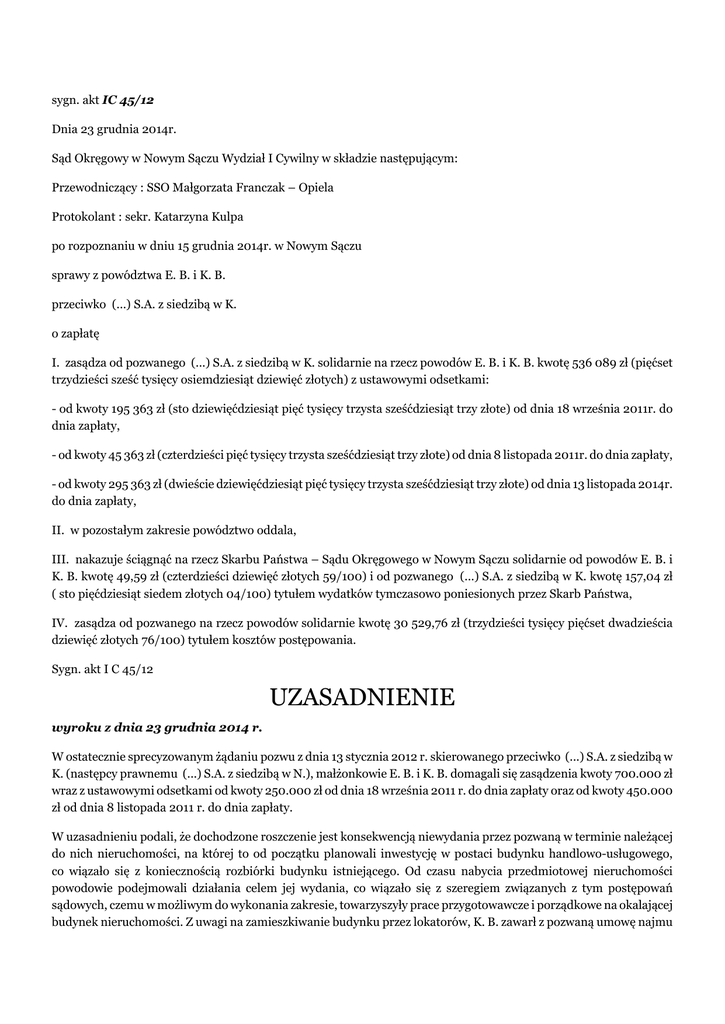 sygn. akt IC 45/12 Dnia 23 grudnia 2014r. Sąd Okręgowy w Nowym Sączu Wydział I Cywilny w składzie następującym: Przewodniczący : SSO Małgorzata Franczak – Opiela Protokolant : sekr. Katarzyna Kulpa po rozpoznaniu w dniu 15 grudnia 2014r. w Nowym Sączu sprawy z powództwa E. B. i K. B. przeciwko (...) S.A. z siedzibą w K. o zapłatę I. zasądza od pozwanego (...) S.A. z siedzibą w K. solidarnie na rzecz powodów E. B. i K. B. kwotę 536 089 zł (pięćset trzydzieści sześć tysięcy osiemdziesiąt dziewięć złotych) z ustawowymi odsetkami: - od kwoty 195 363 zł (sto dziewięćdziesiąt pięć tysięcy trzysta sześćdziesiąt trzy złote) od dnia 18 września 2011r. do dnia zapłaty, - od kwoty 45 363 zł (czterdzieści pięć tysięcy trzysta sześćdziesiąt trzy złote) od dnia 8 listopada 2011r. do dnia zapłaty, - od kwoty 295 363 zł (dwieście dziewięćdziesiąt pięć tysięcy trzysta sześćdziesiąt trzy złote) od dnia 13 listopada 2014r. do dnia zapłaty, II. w pozostałym zakresie powództwo oddala, III. nakazuje ściągnąć na rzecz Skarbu Państwa – Sądu Okręgowego w Nowym Sączu solidarnie od powodów E. B. i K. B. kwotę 49,59 zł (czterdzieści dziewięć złotych 59/100) i od pozwanego (...) S.A. z siedzibą w K. kwotę 157,04 zł ( sto pięćdziesiąt siedem złotych 04/100) tytułem wydatków tymczasowo poniesionych przez Skarb Państwa, IV. zasądza od pozwanego na rzecz powodów solidarnie kwotę 30 529,76 zł (trzydzieści tysięcy pięćset dwadzieścia dziewięć złotych 76/100) tytułem kosztów postępowania. Sygn. akt I C 45/12 UZASADNIENIE wyroku z dnia 23 grudnia 2014 r. W ostatecznie sprecyzowanym żądaniu pozwu z dnia 13 stycznia 2012 r. skierowanego przeciwko (...) S.A. z siedzibą w K. (następcy prawnemu (...) S.A. z siedzibą w N.), małżonkowie E. B. i K. B. domagali się zasądzenia kwoty 700.000 zł wraz z ustawowymi odsetkami od kwoty 250.000 zł od dnia 18 września 2011 r. do dnia zapłaty oraz od kwoty 450.000 zł od dnia 8 listopada 2011 r. do dnia zapłaty. W uzasadnieniu podali, że dochodzone roszczenie jest konsekwencją niewydania przez pozwaną w terminie należącej do nich nieruchomości, na której to od początku planowali inwestycję w postaci budynku handlowo-usługowego, co wiązało się z koniecznością rozbiórki budynku istniejącego. Od czasu nabycia przedmiotowej nieruchomości powodowie podejmowali działania celem jej wydania, co wiązało się z szeregiem związanych z tym postępowań sądowych, czemu w możliwym do wykonania zakresie, towarzyszyły prace przygotowawcze i porządkowe na okalającej budynek nieruchomości. Z uwagi na zamieszkiwanie budynku przez lokatorów, K. B. zawarł z pozwaną umowę najmu do czasu jego zwolnienia, nie później jednak niż do 31 grudnia 2001 r., pomimo jednak upływu terminu, spółka (...) nie wydała nieruchomości, która była nadal zajmowana przez lokatorów. Długoletnia zwłoka pozwanej doprowadziła ostatecznie do powstania z ich strony opóźnienia w wydaniu placu budowy, co z kolei skutkowało koniecznością zapłaty wykonawcy prac budowlanych kar umownych. W wyniku zawartej ugody, ostatecznie powodowie zobowiązali się wypłacić z tego tytułu kwotę 850.000 zł, z czego 150.000 zł zasądzona została prawomocnym wyrokiem Sądu Okręgowego w Nowym Sączu w sprawie o sygn. I C 370/10 (k. 1-9, k. 154-159, k. 481-483, k. 530-534). Strona pozwana (...) S.A. z siedzibą w K. wniosła o oddalenie powództwa i zasądzenie solidarnie od powodów kosztów postępowania. Kwestionując legitymację czynną K. B. wskazała, iż powodowie przez okres ponad siedmiu lat akceptowali fakt zajmowania przez nią przedmiotowego budynku, w tym zaś czasie nie kierowali żądnych żądań, tym samym umowa najmu z 2000 r. uległa przedłużeniu na zasadzie art. 674 k.c. Tym niemniej, w międzyczasie prowadziła konsekwentne działania ukierunkowane na jak najszybsze zwolnienie nieruchomości, w związku z czym nie można przypisać jej zawinienia. Niezależnie od tego, wskazała na przyczynienie się powodów do powstania szkody, a to z uwagi na sposób w jaki przyjęli na siebie odpowiedzialność z tytułu kar umownych wskazując, że nie podjęli oni jakiejkolwiek próby kwestionowania roszczeń w drodze procesu, poprzestając na ugodzie z wykonawcą, niezwłocznie po otrzymaniu zawezwania do takiej próby. Sama przyjęta przez strony wysokość kar umownych była zresztą wygórowana, skoro umowa o roboty budowlane miała zostać pierwotnie wykonana do dnia 15 sierpnia 2009 r., a przesunięcie nastąpiło jedynie o miesiąc, do dnia 17 września 2009 r. Przejawem przyczynienia się powodów do powstania szkody było także zobowiązanie do wydania terenu budowy w terminie nieco ponad miesiąca, licząc od dnia wezwania pozwanej do wydania terenu, obwarowane drakońską karą umowną w wysokości 10.746 zł za każdy dzień opóźnienia. Z ostrożności procesowej pozwana zakwestionowała wysokość roszczenia podnosząc, iż kara umowna do której zapłaty zobowiązali się powodowie w ugodzie z dnia 15 października 2009 r. naliczona została za okres od dnia 1 października 2008 r. do dnia 16 marca 2009 r., najwcześniejszym zaś terminem kiedy mogli rozpocząć prace budowlane był dzień 8 stycznia 2009 r., co wynika z faktu, że w związku ze zmianą przepisów, niezbędna była decyzja o rozbiórce budynku, a także zmieniająca pozwolenie na budowę, które wymagały uprawomocnienia. Niezależnie od powyższego podniosła zarzut przedawnienia, powstanie szkody wiążąc z dniem 1 października 2008 r. jako początkową datą naliczania kary umownej, przy zastosowaniu trzyletniego terminu przedawnienia związanego z prowadzeniem działalności gospodarczej (k. 60-73, k. 171-175, k. 414-418, k. 595-611). Sąd ustalił następujący stan faktyczny: K. i E. B. pozostają w związku małżeńskim od 1984 r., w ustroju wspólności majątkowej, przy czym od