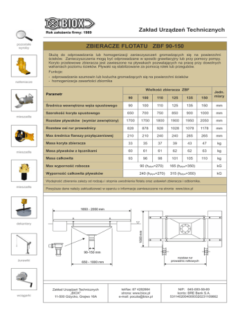 Zakład Urządzeń Technicznych Rok założenia firmy: 1989 pozostałe wyroby ZBIERACZE FLOTATU ZBF 90-150 natleniacze Służą do odprowadzania lub homogenizacji zanieczyszczeń gromadzących się na powierzchni ścieków. Zanieczyszczenia mogą być odprowadzane w sposób grawitacyjny lub przy pomocy pompy. Koryto przelewowe zbieracza jest zawieszone na pływakach pozwalających na pracę przy dowolnych wahaniach poziomu ścieków. Pływaki są stabilizowane za pomocą rolek lub przegubów. Funkcje: - odprowadzanie szumowin lub kożucha gromadzących się na powierzchni ścieków - homogenizacja zawartości zbiornika Wielkość zbieracza ZBF Parametr mieszadła mieszadła Jedn. miary 90 100 110 125 135 150 Średnica wewnętrzna węża spustowego 90 100 110 125 135 150 mm Szerokość koryta spustowego 650 700 750 850 900 1000 mm Rozstaw pływaków (wymiar zewnętrzny) 1700 1750 1800 1900 1950 2050 mm Rozstaw osi rur prowadnicy 828 878 928 1028 1078 1178 mm Max średnica flanszy przyłączeniowej 210 210 240 240 265 265 mm Masa koryta zbieracza 33 35 37 39 43 47 kg Masa pływaków z łącznikami 60 61 61 62 62 63 kg Masa całkowita 93 96 98 101 105 110 kg Max wyporność robocza 90 (hpływ=270) 165 (hpływ=350) kG Wyporność całkowita pływaków 240 (hpływ=270) 315 (hpływ=350) kG Wydajność zbierania zależy od rodzaju i stopnia uwodnienia flotatu oraz ustawień zbieracza i odbiornika. mieszadła Powyższe dane należy zaktualizować w oparciu o informacje zamieszczone na stronie www.biox.pl 1850 -167 2050 mm 1000 mm dekantery 90-150 mm żurawiki wciągarki rozstaw rur prowadnic90 rolkowych 650 - 1000 mm Zakład Urządzeń Technicznych „BIOX" 11-500 Giżycko, Grajwo 16A tel/fax: 87 4282664 strona: www.biox.pl e-mail: [email protected] NIP: 845-000-58-69 konto: BRE Bank S.A. 53114020040000320231109862