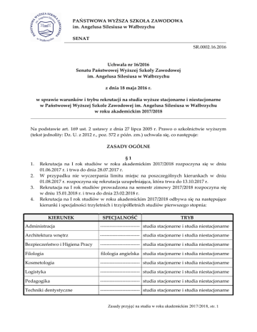 [Wpisz cytat z PAŃSTWOWA WYŻSZA SZKOŁA ZAWODOWA im. Angelusa Silesiusa w Wałbrzychu SENAT SR.0002.16.2016 Uchwała nr 16/2016 Senatu Państwowej Wyższej Szkoły Zawodowej im. Angelusa Silesiusa w Wałbrzychu z dnia 18 maja 2016 r. w sprawie warunków i trybu rekrutacji na studia wyższe stacjonarne i niestacjonarne w Państwowej Wyższej Szkole Zawodowej im. Angelusa Silesiusa w Wałbrzychu w roku akademickim 2017/2018 Na podstawie art. 169 ust. 2 ustawy z dnia 27 lipca 2005 r. Prawo o szkolnictwie wyższym (tekst jednolity: Dz. U. z 2012 r., poz. 572 z późn. zm.) uchwala się, co następuje: ZASADY OGÓLNE 1. 2. 3. 4. §1 Rekrutacja na I rok studiów w roku akademickim 2017/2018 rozpoczyna się w dniu 01.06.2017 r. i trwa do dnia 28.07.2017 r. W przypadku nie wyczerpania limitu miejsc na poszczególnych kierunkach w dniu 01.08.2017 r. rozpoczyna się rekrutacja uzupełniająca, która trwa do 13.10.2017 r. Rekrutacja na I rok studiów prowadzona na semestr zimowy 2017/2018 rozpoczyna się w dniu 15.01.2018 r. i trwa do dnia 23.02.2018 r. Rekrutacja na I rok studiów w roku akademickim 2017/2018 odbywa się na następujące kierunki i specjalności trzyletnich i trzyipółletnich studiów pierwszego stopnia: KIERUNEK Administracja SPECJALNOŚĆ TRYB ------------------------- studia stacjonarne i studia niestacjonarne Architektura wnętrz ------------------------- studia stacjonarne i studia niestacjonarne Filologia filologia angielska studia stacjonarne i studia niestacjonarne Bezpieczeństwo i Higiena Pracy ------------------------- studia stacjonarne i studia niestacjonarne Kosmetologia ------------------------- studia stacjonarne i studia niestacjonarne Pedagogika ------------------------- studia stacjonarne i studia niestacjonarne Logistyka Techniki dentystyczne ------------------------- studia stacjonarne i studia niestacjonarne ------------------------- studia stacjonarne i studia niestacjonarne Zasady przyjęć na studia w roku akademickim 2017/2018, str. 1 Pielęgniarstwo* Zrównoważone zarządzanie zasobami środowiska ------------------------- studia stacjonarne ------------------------- studia stacjonarne i studia niestacjonarne *Rekrutacja będzie prowadzona po uzyskaniu zgody MNiSW 5. W przypadku nieuruchomienia kierunku studiów lub specjalności i trybu, o których mowa w ust. 1 w roku poprzedzającym, zastrzega się możliwość nieogłoszenia naboru na dany kierunek lub specjalność i tryb. §2 Rekrutacja na I rok studiów w roku akademickim 2017/2018 odbywa się na następujące kierunki studiów drugiego stopnia: KIERUNEK Administracja Logistyka SPECJALNOŚĆ TRYB studia stacjonarne i studia ---------------------------------------niestacjonarne studia stacjonarne i studia ---------------------------------------niestacjonarne §3 1. Postępowanie kwalifikacyjne przeprowadza powołana przez rektora Międzyinstytutowa Komisja Rekrutacyjna oraz Uczelniana Komisja Rekrutacyjna. 2. Od decyzji Międzyinstytutowej Komisji Rekrutacyjnej przysługuje odwołanie do Uczelnianej Komisji Rekrutacyjnej, w terminie 14 dni od daty doręczenia decyzji. Podstawą odwołania może być jedynie wskazanie naruszenia warunków i trybu rekrutacji na studia, określonych w niniejszej uchwale. Decyzję podejmuje rektor po rozpatrzeniu wniosku Uczelnianej Komisji Rekrutacyjnej. Decyzja rektora jest ostateczna. §4 1. Szczegółowe terminy rekrutacji zostaną podane w późniejszym czasie. 2. Kandydaci powiadamiani są o terminach w gablotach ogłoszeń oraz na stronie internetowej Uczelni. §5 W przypadku niezgłoszenia się odpowiedniej liczby kandydatów (minimum 60 osób) na dany kierunek lub kierunek i specjalność, nie zostaną one uruchomione. Senat w przypadku mniejszej liczby kandydatów pozostawia do dyspozycji rektora prawo decyzji o uruchomieniu studiów. REKRUTACJA NA STUDIA PIERWSZEGO STOPNIA §6 1) Ustala się następujące warunki, tryb rekrutacji oraz zasady przeprowadzania postępowania kwalifikacyjnego i egzaminów wstępnych na I rok trzyletnich i trzyipółletnich studiów pierwszego stopnia. 1. Postępowanie rekrutacyjne ma charakter konkursowy. Zasady przyjęć na studia w roku akademickim 2017/2018, str. 2 2. 3. Podstawą przyjęcia na studia są punkty rekrutacyjne przyznawane kandydatowi zgodnie z ust. 4 lub 5 za przedmioty określone w ust. 3, z których zdawał egzamin maturalny, egzamin dojrzałości lub egzamin przeprowadzony w ramach programu Matury Międzynarodowej. W postępowaniu rekrutacyjnym kandydat otrzymuje punkty za przedmioty, z których zdawał egzamin maturalny, egzamin dojrzałości lub egzamin przeprowadzony w ramach programu Matury Międzynarodowej, zgodnie z poniższą tabelą: Kierunek Administracja Architektura wnętrz Bezpieczeństwo i higiena pracy Filologia - filologia angielska Przedmioty 1. język obcy 2. przedmiot z którego kandydat otrzymał najkorzystniejszy wynik 1. język obcy 2. przedmiot z którego kandydat otrzymał najkorzystniejszy wynik Warunkiem przystąpienia do rekrutacji jest złożenie CV (w formie wydruku na formacie A4), które powinno zawierać: - prezentację kandydata, - uzasadnienie wyboru kierunku studiów. Ocena predyspozycji zawodowych odbędzie się w formie 1,5 godzinnych warsztatów sprawdzających kreatywność i predyspozycje zawodowe 1. język obcy 2. przedmiot z którego kandydat otrzymał najkorzystniejszy wynik język angielski 1. język obcy Kosmetologia 2. przedmiot z którego najkorzystniejszy wynik 1. język obcy Logistyka 2. przedmiot z którego najkorzystniejszy wynik 1. język obcy Pedagogika 2. przedmiot z którego najkorzystniejszy wynik 1. język obcy Techniki dentystyczne 2. przedmiot z którego najkorzystniejszy wynik 1. język obcy Pielęgniarstwo* 2. biologia lub chemia 1. język obcy Zrównoważone zarządzanie 2. przedmiot z którego zasobami środowiska najkorzystniejszy wynik *Rekrutacja będzie prowadzona po uzyskaniu zgody MNiSW kandydat otrzymał kandydat otrzymał kandydat otrz