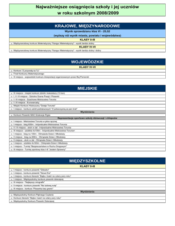 Najważniejsze osiągnięcia szkoły i jej uczniów w roku szkolnym 2008/2009 KRAJOWE, MIĘDZYNARODOWE Wynik sprawdzianu klas VI - 25,52 (wyższy niż wynik miasta, powiatu i województwa) KLASY 0-III • Międzynarodowy konkurs Matematyczny "Kangur Matematyczny" - wynik bardzo dobry KLASY IV-VI • Międzynarodowy konkurs Matematyczny "Kangur Matematyczny" - wynik bardzo dobry i dobry WOJEWÓDZKIE KLASY IV-VI • Konkurs "Z przyrodą na Ty" • Finał Konkursu Matematycznego • III miejsce - wojewódzki konkurs interpretacji organizowanym przez Baj Pomorski MIEJSKIE • • • • • • III miejsce - miejski konkurs zbiórki makulatury (13 ton) I, II i III miejsce - Szkolna Scena Poezji i Piosenki I i III miejsce - Szachowe Mistrzostwa Torunia I i III miejsce - Eurowarcaby Miejski Konkurs Historyczny "Dzieje Torunia" I miejsce - konkurs szkół podstawowych "Z polszczyzną za pan brat" Wyróżnienia • Konkurs Piosenki MAC Edukacja Pigża Reprezentacje sportowe szkoły dziewcząt i chłopców • • • • • • • • • • I miejsce - Mistrzostwa Torunia w piłce ręcznej I miejsce - bieg 600m - Indywidualne Mistrzostwa Torunia II i III miejsce - skok w dal - Indywidualne Mistrzostwa Torunia III miejsce - sztafeta 4x100m - Indywidualne Mistrzostwa Torunia< I miejsce - bieg na 100m - Olimpiada Dzieci i Młodzieży II miejsce - bieg na 600m - Olimpiada Dzieci i Młodzieży II miejsce - skok w dal - Olimpiada Dzieci i Młodzieży I miejsce - sztafeta 4x100m - Olimpiada Dzieci i Młodzieży I miejsce - Turniej "Bezpieczeństwo w Ruchu Drogowym" III miejsce - Turniej sportowy klas I-III "Jestem Sprawny" MIĘDZYSZKOLNE KLASY 0-III • • • • • • • I miejsce - konkurs piosenki "Didasko" I miejsce - konkurs piosenki "Nowa Era" I miejsce - konkurs literacki "Bajka i baśń na cztery pory roku" I miejsce - Międzyszkolny konkurs piosenki dziecięcej III miejsce - "Najlepszy ortografik" II miejsce - konkurs piosenki "Na ludową nutę" III miejsce - konkurs "Piosenka bez granic" Wyróżnienia • Międzyszkolny Konkurs Pięknego Czytania • Konkurs literacki "Bajka i baśń na cztery pory roku" • Międzyszkolny Konkurs Piosenki Dziecięcej Najważniejsze osiągnięcia szkoły i jej uczniów w roku szkolnym 2008/2009 MIĘDZYSZKOLNE KLASY IV-VI • • • • • • • • • • • I miejsce - Konkurs wiedzy o krajach anglojęzycznych I miejsce - Międzyszkolny Konkurs Piosenki Dziecięcej II miejsce - konkurs plastyczny "Wielkanoc malowana na płótnie" II miejsce - konkurs PCK "Żyj zdrowo" II miejsce - konkurs plastyczny "Moje miasto" II miejsce - przegląd teatralny "Krok do świata fikcji" Nagroda dla najlepszego aktora w przeglądzie teatralnym "Krok do świata fikcji" II miejsce - konkurs informatyczny "Edytor tekstu Word" II miejsce - "Czerniewickie spotkania z piosenką" III miejsce - konkurs języka angielskiego II miejsce - przegląd chórów szkolnych w ramach programu "Śpiewająca Polska" Wyróżnienia • Konkurs interpretacji utworów A.Mickiewicza • Konkurs plastyczny w ramach kampanii "Październik miesiąc wolny od uzależnień" • Konkurs PCK "Żyj zdrowo" Reprezentacje sportowe szkoły dziewcząt i chłopców • • • • • I miejsce - halowy turniej piłki nożnej o "Puchar Dyrektora SP 32" I miejsce - reprezentacja oddz. 0 - "Żyjemy zdrowo, czyli sportowo" II miejsce - bieg przez płotki - zawody lekkoatletyczne - halowe II miejsce - rzut piłką lekarską - zawody lekkoatletyczne - halowe III miejsce - klasyfikacja ogólna - zawody lekkoatletyczne - halowe
