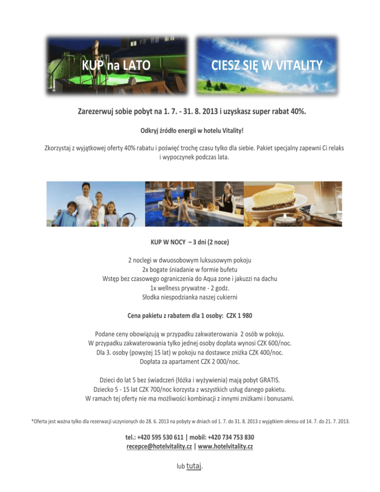 KUP na LATO CIESZ SIĘ W VITALITY Zarezerwuj sobie pobyt na 1. 7. - 31. 8. 2013 i uzyskasz super rabat 40%. Odkryj źródło energii w hotelu Vitality! Zkorzystaj z wyjątkowej oferty 40% rabatu i poświęć trochę czasu tylko dla siebie. Pakiet specjalny zapewni Ci relaks i wypoczynek podczas lata. KUP W NOCY – 3 dni (2 noce) 2 noclegi w dwuosobowym luksusowym pokoju 2x bogate śniadanie w formie bufetu Wstęp bez czasowego ograniczenia do Aqua zone i jakuzzi na dachu 1x wellness prywatne - 2 godz. Słodka niespodzianka naszej cukierni Cena pakietu z rabatem dla 1 osoby: CZK 1 980 Podane ceny obowiązują w przypadku zakwaterowania 2 osób w pokoju. W przypadku zakwaterowania tylko jednej osoby dopłata wynosi CZK 600/noc. Dla 3. osoby (powyżej 15 lat) w pokoju na dostawce zniżka CZK 400/noc. Dopłata za apartament CZK 2 000/noc. Dzieci do lat 5 bez świadczeń (łóżka i wyżywienia) mają pobyt GRATIS. Dziecko 5 - 15 lat CZK 700/noc korzysta z wszystkich usług danego pakietu. W ramach tej oferty nie ma możliwości kombinacji z innymi zniżkami i bonusami. *Oferta jest ważna tylko dla rezerwacji uczynionych do 28. 6. 2013 na pobyty w dniach od 1. 7. do 31. 8. 2013 z wyjątkiem okresu od 14. 7. do 21. 7. 2013. tel.: +420 595 530 611 | mobil: +420 734 753 830 [email protected] | www.hotelvitality.cz lub tutaj.