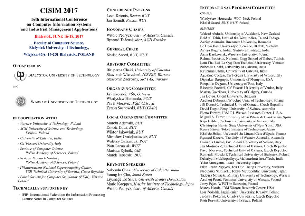 CISIM 2017 16th International Conference on Computer Information Systems and Industrial Management Applications Bialystok, JUNE 16-18, 2017 Faculty of Computer Science, Bialystok University of Technology, Wiejska 45A, 15-251 Bialystok, POLAND ORGANIZED BY BIALYSTOK UNIVERSITY OF T ECHNOLOGY and CONFERENCE PATRONS Lech Dzienis, Rector, BUT Jan Szmidt, Rector, WUT HONORARY CHAIRS Witold Pedrycz, Univ. of Alberta, Canada Ryszard Tadeusiewicz, AGH Kraków GENERAL CHAIR Khalid Saeed, BUT, WUT ADVISORY COMMITTEE Rituparna Chaki, University of Calcutta Sławomir Wierzchoń, ICS PAS, Warsaw Sławomir Zadrożny, SRI PAS, Warsaw ORGANIZING COMMITTEE WARSAW UNIVERSITY OF T ECHNOLOGY IN COOPERATION WITH : - Warsaw University of Technology, Poland - AGH University of Science and Technology Krakow, Poland - University of Calcutta, India - Ca' Foscari University, Italy - Institute of Computer Science, Polish Academy of Sciences, Poland - Systems Research Institute, Polish Academy of Sciences, Poland - IT4Innovations National Supercomputing Center, VŠB-Technical University of Ostrava, Czech Republic - Polish Society for Computer Simulation (PTSK), Warsaw, Poland TECHNICALLY SUPPORTED BY - IFIP- International Federation for Information Processing - Lecture Notes in Computer Science Jiří Dvorský, VŠB, Ostrava Władysław Homenda, WUT Pavel Moravec, VŠB, Ostrava Zenon Sosnowski, BUT (Chair) LOCAL ORGANIZING COMMITTEE Marcin Adamski, BUT Dorota Duda, BUT Wiktor Jakowluk, BUT Mirosław Omieljanowicz, BUT Walenty Oniszczuk, BUT Piotr Panasiuk, WUT Mariusz Rybnik, UiB Marek Tabędzki, BUT KEYNOTE SPEAKERS Nabendu Chaki, University of Calcutta, India Young Im Cho, South Korea Liyanage De Silva, Universiti Brunei Darussalam Mario Koeppen, Kyushu Institute of Technology, Japan Witold Pedrycz, Univ. of Alberta, Canada INTERNATIONAL PROGRAM COMMITTEE CHAIRS: Władysław Homenda, WUT, UoB, Poland Khalid Saeed, BUT, WUT, Poland MEMBERS Waleed Abdulla, University of Auckland, New Zealand Raid Al-Tahir, Univ of the West Indies, Tr. and Tobago Adrian Atanasiu, Bucharest University, Romania Le Hoai Bac, University of Science, HCMC, Vietnam Aditya Bagchi, Indian Statistical Institute, India Anna Bartkowiak, Wrocław University, Poland Rahma Boucetta, National Engg School of Gabes, Tunisia Lam Thu Bui, Le Quy Don Technical University, Vietnam Nabendu Chaki, University of Calcutta, India Rituparna Chaki, University of Calcutta, India Agostino Cortesi, Ca' Foscari University of Venice, Italy Dipankar Dasgupta, University of Memphis, USA Pierpaolo Degano, University of Pisa, Italy Riccardo Focardi, Ca' Foscari University of Venice, Italy Marina Gavrilova, University of Calgary, Canada Jan Devos, Ghent University, Belgium Andrzej Dobrucki, Wrocław Univ. of Technology, Poland Jiří Dvorský, Technical Univ of Ostrava, Czech Republic David Dagan Feng, University of Sydney, Australia Pietro Ferrara, IBM T.J. Watson Research Center, U.S.A. Miguel A. Ferrer, University of Las Palmas de Gran Canaria, Spain Raju Halder, Ca' Foscari University of Venice, Italy Christopher Harris, State University of New York, USA Kauru Hirota, Tokyo Institute of Technology, Japan Khalide Jbilou, Université du Littoral Côte d'Opale, France Ryszard Kozera, The Univ of Western Australia, Australia Flaminia Luccio, Ca' Foscari University of Venice, Italy Jan Martinovič, Technical Univ of Ostrava, Czech Republic Pavel Moravec, Technical Univ of Ostrava, Czech Republic Romuald Mosdorf, Technical University of Białystok, Poland Debajyoti Mukhopadhyay, Maharashtra Inst.f Tech, India Yuko Murayama, Iwate University, Japan Hien Thanh Nguyen, Ton Duc Thang University, Vietnam Nobuyuki Nishiuchi, Tokyo Metropolitan University, Japan Tadeusz Nowicki, Military University of Technology, Warsaw Andrzej Pacut, Technical University of Warsaw, Poland Jerzy Pejaś, WPUT in Szczecin, Poland Marco Pistoia, IBM Watson Research Center, USA Igor Podolak, Jagiellonian University, Kraków, Poland Jaroslav Pokorný, Charles University, Czech Republic Piotr Porwik, University of Silesia, Poland Jan Preis-Heje, Ghent University, Denmark Tho Thanh Quan, Ho Chi Minh Univ of Technology, Vietnam Isabel Ramos, University of Minho, Portugal Anirban Sarkar, NIT, Durgapore Ewa Skubalska-Rafajłowicz, Wrocław Univ of Tech, Poland Kateřina Slaninova, Tec. Univ of Ostrava, Czech Republic Krzysztof Ślot, Lodz University of Technology, Poland Vaclav Snaśel, Technical Univ of Ostrava, Czech Republic Zenon Sosnowski, Bialystok Univ of Tech, Poland Jaroslaw Stepaniuk, Bialystok Univ of Tech, Poland Marcin Szpyrka, AGH Univ. of Sc and Tech, Kraków, Poland Jacek Tabor, Jagiellonian University, Kraków, Poland Andrea Torsello, Ca' Foscari University of Venice, Italy Dao Trong Tran, Ton Duc Thang University, Vietnam Nitin Upadhyay, BITS Pilani, India Bay Dinh Vo, Ton Duc Thang University, Vietnam Qiang Wei, Tsinghua University, Beijing, China Sławomir Wierzchoń, Polish Academy of Sc, Warsaw, Poland Michał Woźniak, Wroclaw University of Technology, Poland Sławomir Zadrożny, Polish Academy of Sciences, Poland Ivan Zelinka, Technical Univ of Ostrava, Czech Republic PURPOSE OF CONFERENCE This conference aims to bring many important research streams together. Computer Information Systems and their applications in Image Analysis and Processing, Biometrics in both behavioral and physiological categories comprise researches in Information Processing Systems and Human Identification and Recognition Techniques. Therefore, researchers are encouraged to submit their contributions in both theoretical and practical aspects of the following Topics. TOPICS The topics of the conference include the following scientific research areas of Computer Science. - Computer Information Systems Signal & Image Analysis and Processing, Computer Graphics and Vision, Object Classification and Recognition, Artificial Intelligence, Ambient Intelligence, Ubiquitous Systems, Mobile and Pervasive Computing, Securi
