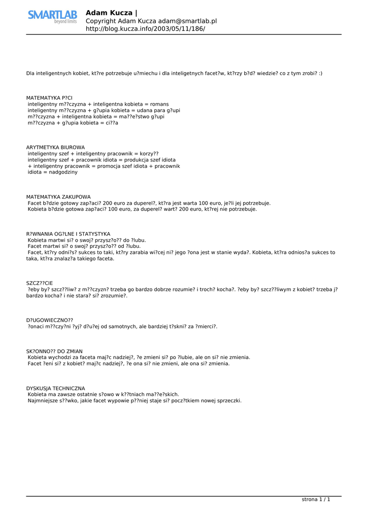 Adam Kucza | Copyright Adam Kucza [email protected] http://blog.kucza.info/2003/05/11/186/ Dla inteligentnych kobiet, kt?re potrzebuje u?miechu i dla inteligetnych facet?w, kt?rzy b?d? wiedzie? co z tym zrobi? :) MATEMATYKA P?CI inteligentny m??czyzna + inteligentna kobieta = romans inteligentny m??czyzna + g?upia kobieta = udana para g?upi m??czyzna + inteligentna kobieta = ma??e?stwo g?upi m??czyzna + g?upia kobieta = ci??a ARYTMETYKA BIUROWA inteligentny szef + inteligentny pracownik = korzy?? inteligentny szef + pracownik idiota = produkcja szef idiota + inteligentny pracownik = promocja szef idiota + pracownik idiota = nadgodziny MATEMATYKA ZAKUPOWA Facet b?dzie gotowy zap?aci? 200 euro za duperel?, kt?ra jest warta 100 euro, je?li jej potrzebuje. Kobieta b?dzie gotowa zap?aci? 100 euro, za duperel? wart? 200 euro, kt?rej nie potrzebuje. R?WNANIA OG?LNE I STATYSTYKA Kobieta martwi si? o swoj? przysz?o?? do ?lubu. Facet martwi si? o swoj? przysz?o?? od ?lubu. Facet, kt?ry odni?s? sukces to taki, kt?ry zarabia wi?cej ni? jego ?ona jest w stanie wyda?. Kobieta, kt?ra odnios?a sukces to taka, kt?ra znalaz?a takiego faceta. SZCZ??CIE ?eby by? szcz??liw? z m??czyzn? trzeba go bardzo dobrze rozumie? i troch? kocha?. ?eby by? szcz??liwym z kobiet? trzeba j? bardzo kocha? i nie stara? si? zrozumie?. D?UGOWIECZNO?? ?onaci m??czy?ni ?yj? d?u?ej od samotnych, ale bardziej t?skni? za ?mierci?. SK?ONNO?? DO ZMIAN Kobieta wychodzi za faceta maj?c nadziej?, ?e zmieni si? po ?lubie, ale on si? nie zmienia. Facet ?eni si? z kobiet? maj?c nadziej?, ?e ona si? nie zmieni, ale ona si? zmienia. DYSKUSJA TECHNICZNA Kobieta ma zawsze ostatnie s?owo w k??tniach ma??e?skich. Najmniejsze s??wko, jakie facet wypowie p??niej staje si? pocz?tkiem nowej sprzeczki. strona 1 / 1