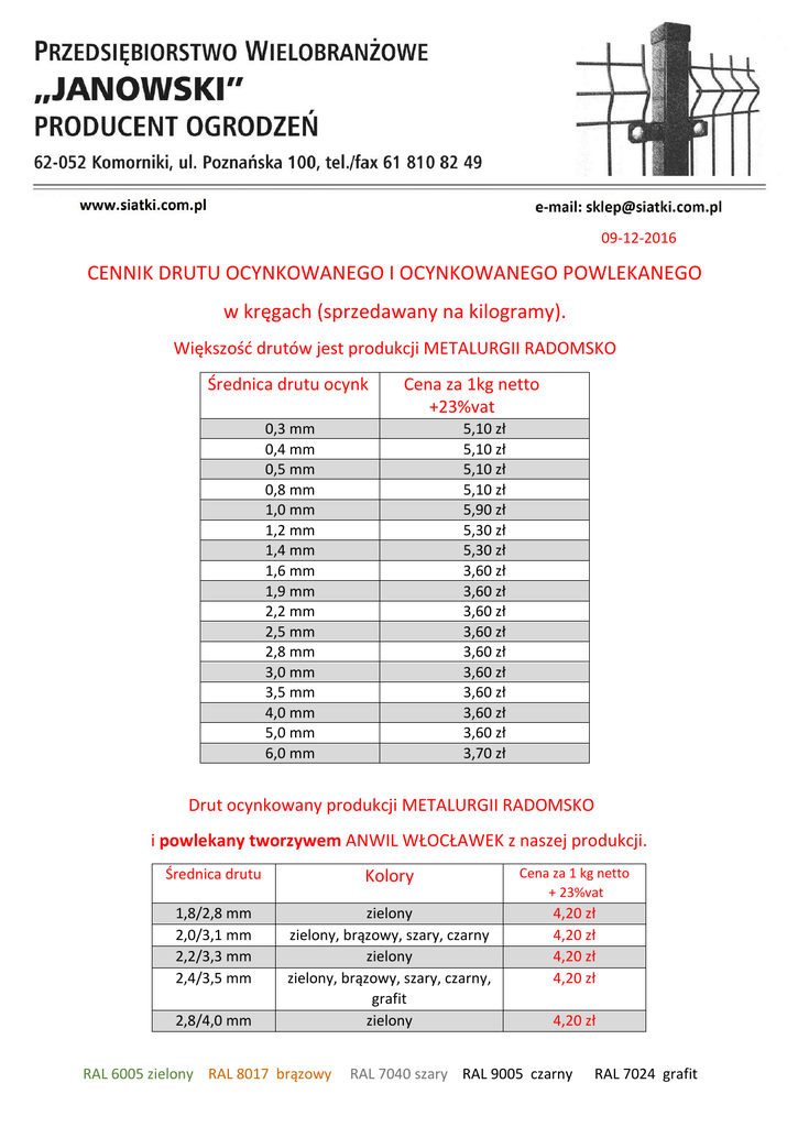 09-12-2016 CENNIK DRUTU OCYNKOWANEGO I OCYNKOWANEGO POWLEKANEGO w kręgach (sprzedawany na kilogramy). Większość drutów jest produkcji METALURGII RADOMSKO Średnica drutu ocynk Cena za 1kg netto +23%vat 0,3 mm 0,4 mm 0,5 mm 0,8 mm 1,0 mm 1,2 mm 1,4 mm 1,6 mm 1,9 mm 2,2 mm 2,5 mm 2,8 mm 3,0 mm 3,5 mm 4,0 mm 5,0 mm 6,0 mm 5,10 zł 5,10 zł 5,10 zł 5,10 zł 5,90 zł 5,30 zł 5,30 zł 3,60 zł 3,60 zł 3,60 zł 3,60 zł 3,60 zł 3,60 zł 3,60 zł 3,60 zł 3,60 zł 3,70 zł Drut ocynkowany produkcji METALURGII RADOMSKO i powlekany tworzywem ANWIL WŁOCŁAWEK z naszej produkcji. Średnica drutu Kolory Cena za 1 kg netto + 23%vat 1,8/2,8 mm 2,0/3,1 mm 2,2/3,3 mm 2,4/3,5 mm zielony zielony, brązowy, szary, czarny zielony zielony, brązowy, szary, czarny, grafit zielony 4,20 zł 4,20 zł 4,20 zł 4,20 zł 2,8/4,0 mm RAL 6005 zielony RAL 8017 brązowy 4,20 zł RAL 7040 szary RAL 9005 czarny RAL 7024 grafit