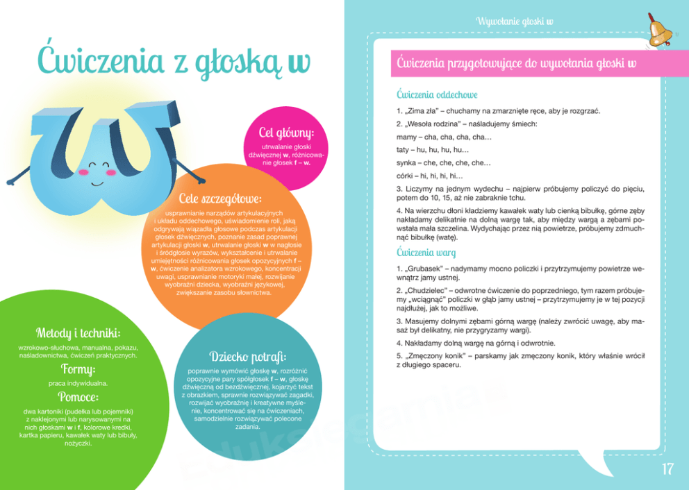 Wywołanie głoski w Ćwiczenia z głoską w Ćwiczenia przygotowujące do wywołania głoski w Ćwiczenia oddechowe 1. „Zima zła” – chuchamy na zmarznięte ręce, aby je rozgrzać. Cel główny: utrwalanie głoski dźwięcznej w, różnicowanie głosek f – w. 2. „Wesoła rodzina” – naśladujemy śmiech: mamy – cha, cha, cha, cha… taty – hu, hu, hu, hu… synka – che, che, che, che… córki – hi, hi, hi, hi… Cele szczegółowe: usprawnianie narządów artykulacyjnych i układu oddechowego, uświadomienie roli, jaką odgrywają wiązadła głosowe podczas artykulacji głosek dźwięcznych, poznanie zasad poprawnej artykulacji głoski w, utrwalanie głoski w w nagłosie i śródgłosie wyrazów, wykształcenie i utrwalanie umiejętności różnicowania głosek opozycyjnych f – w, ćwiczenie analizatora wzrokowego, koncentracji uwagi, usprawnianie motoryki małej, rozwijanie wyobraźni dziecka, wyobraźni językowej, zwiększanie zasobu słownictwa. Formy: praca indywidualna. Pomoce: dwa kartoniki (pudełka lub pojemniki) z naklejonymi lub narysowanymi na nich głoskami w i f, kolorowe kredki, kartka papieru, kawałek waty lub bibuły, nożyczki. 4. Na wierzchu dłoni kładziemy kawałek waty lub cienką bibułkę, górne zęby nakładamy delikatnie na dolną wargę tak, aby między wargą a zębami powstała mała szczelina. Wydychając przez nią powietrze, próbujemy zdmuchnąć bibułkę (watę). Ćwiczenia warg 1. „Grubasek” – nadymamy mocno policzki i przytrzymujemy powietrze wewnątrz jamy ustnej. 2. „Chudzielec” – odwrotne ćwiczenie do poprzedniego, tym razem próbujemy „wciągnąć” policzki w głąb jamy ustnej – przytrzymujemy je w tej pozycji najdłużej, jak to możliwe. 3. Masujemy dolnymi zębami górną wargę (należy zwrócić uwagę, aby masaż był delikatny, nie przygryzamy wargi). Metody i techniki: wzrokowo-słuchowa, manualna, pokazu, naśladownictwa, ćwiczeń praktycznych. 3. Liczymy na jednym wydechu – najpierw próbujemy policzyć do pięciu, potem do 10, 15, aż nie zabraknie tchu. 4. Nakładamy dolną wargę na górną i odwrotnie. Dziecko potrafi: poprawnie wymówić głoskę w, rozróżnić opozycyjne pary spółgłosek f – w, głoskę dźwięczną od bezdźwięcznej, kojarzyć tekst z obrazkiem, sprawnie rozwiązywać zagadki, rozwijać wyobraźnię i kreatywne myślenie, koncentrować się na ćwiczeniach, samodzielnie rozwiązywać polecone zadania. 5. „Zmęczony konik” – parskamy jak zmęczony konik, który właśnie wrócił z długiego spaceru. 17 Utrwalanie głoski w Możesz powiesić na nim ubrania, by uniknąć prasowania. Czytanie i rysowanie Wysłuchaj i powtórz lub, jeśli już potrafisz, przeczytaj wierszyk. Mocno akcentuj głoskę w. Narysuj to, o czym mowa w wierszyku. Żyrafa Weronika Mama i tata piją ją rano, z mlekiem lub ze śmietaną. Dzieci jej pić nie mogą, dlatego dostają zbożową. We wtorek żyrafa Weronika spotkała swego przyjaciela konika. Razem postanowili nie czekać ani chwili i na trawce wesoło poskakać. I choć ani żyrafa, ani koń nie potrafią latać, skakali tak wysoko, że dostrzegło ich pilota Wacława bystre oko. Uśmiechnął się wesoło i swym samolotem nad łączką zatoczył koło. Jest nim komar i biedronka, jest nim mucha oraz stonka. Jest nim motyl, także osa. I to nie są żadne gady, to, drodzy Państwo, są małe… Dostojna dama w czarnobiały strój ubrana. Po łące wolno spaceruje i trawę spokojnie sobie żuje. 22 23