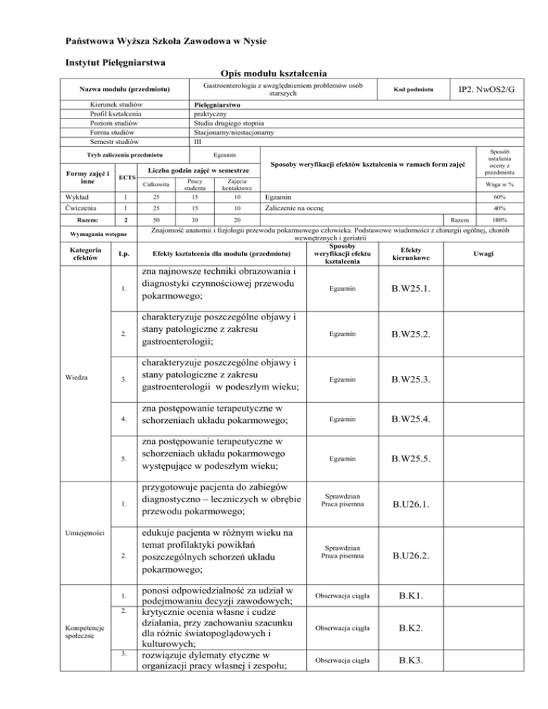 Państwowa Wyższa Szkoła Zawodowa w Nysie Instytut Pielęgniarstwa Opis modułu kształcenia Gastroenterologia z uwzględnieniem problemów osób starszych Nazwa modułu (przedmiotu) Kierunek studiów Profil kształcenia Poziom studiów Forma studiów Semestr studiów Egzamin Liczba godzin zajęć w semestrze ECTS Całkowita Pracy studenta Zajęcia kontaktowe Sposoby weryfikacji efektów kształcenia w ramach form zajęć 1 25 15 10 Egzamin Ćwiczenia 1 25 15 10 Zaliczenie na ocenę Razem: 2 50 30 20 Kategoria efektów Lp. 1. 2. Wiedza 3. 4. 5. 1. Umiejętności 2. 1. 2. Kompetencje społeczne 3. Sposób ustalania oceny z przedmiotu Waga w % Wykład Wymagania wstępne IP2. NwOS2/G Pielęgniarstwo praktyczny Studia drugiego stopnia Stacjonarny/niestacjonarny III Tryb zaliczenia przedmiotu Formy zajęć i inne Kod podmiotu 60% 40% Razem 100% Znajomość anatomii i fizjologii przewodu pokarmowego człowieka. Podstawowe wiadomości z chirurgii ogólnej, chorób wewnętrznych i geriatrii Sposoby Efekty Efekty kształcenia dla modułu (przedmiotu) weryfikacji efektu Uwagi kierunkowe kształcenia zna najnowsze techniki obrazowania i diagnostyki czynnościowej przewodu pokarmowego; Egzamin B.W25.1. Egzamin B.W25.2. Egzamin B.W25.3. Egzamin B.W25.4. Egzamin B.W25.5. przygotowuje pacjenta do zabiegów diagnostyczno – leczniczych w obrębie przewodu pokarmowego; Sprawdzian Praca pisemna B.U26.1. edukuje pacjenta w różnym wieku na temat profilaktyki powikłań poszczególnych schorzeń układu pokarmowego; Sprawdzian Praca pisemna B.U26.2. Obserwacja ciągła B.K1. Obserwacja ciągła B.K2. Obserwacja ciągła B.K3. charakteryzuje poszczególne objawy i stany patologiczne z zakresu gastroenterologii; charakteryzuje poszczególne objawy i stany patologiczne z zakresu gastroenterologii w podeszłym wieku; zna postępowanie terapeutyczne w schorzeniach układu pokarmowego; zna postępowanie terapeutyczne w schorzeniach układu pokarmowego występujące w podeszłym wieku; ponosi odpowiedzialność za udział w podejmowaniu decyzji zawodowych; krytycznie ocenia własne i cudze działania, przy zachowaniu szacunku dla różnic światopoglądowych i kulturowych; rozwiązuje dylematy etyczne w organizacji pracy własnej i zespołu; 4. 5. 6. 7. przestrzega praw autorskich i praw podmiotu badań; ponosi odpowiedzialność za bezpieczeństwo własne i osób znajdujących się pod jego opieką; przestrzega zasad etyki zawodowej w relacji z pacjentem i zespołem terapeutycznym oraz w pracy badawczej; dba o wizerunek własnego zawodu. Obserwacja ciągła B.K4. Obserwacja ciągła B.K5. Obserwacja ciągła B.K6. Obserwacja ciągła B.K1. Prowadzący Forma zajęć Prowadzący zajęcia (tytuł/stopień naukowy, imię i nazwisko) Wykład Ćwiczenia Treści kształcenia Wykład Metody dydaktyczne Wykład z wykorzystaniem technik multimedialnych, dyskusja Liczba godzin Lp. Tematyka zajęć Tematyczne efekty kształcenia W wyniku kształcenia student: 1. 2. 3. 4. 5. 6. 7. 8. Objawy- „typowe” dla chorób przewodu pokarmowego. Choroby chirurgiczne górnego odcinka przewodu pokarmowego - zasady leczenia operacyjnego Choroby chirurgiczne dolnego odcinka przewodu pokarmowego - zasady leczenia operacyjnego Choroby chirurgiczne gruczołów trawiennych (wątroba, trzustka) oraz dróg żółciowych – zasady leczenia operacyjnego Badania diagnostyczne wykonywane w gastrologii. Rola pielęgniarki w przygotowaniu pacjenta do badań specjalistycznych. Opieka okołooperacyjna nad chorym w starszym wieku ze schorzeniami górnego odcinka przewodu pokarmowego. - wymienia typowe dolegliwości świadczące o schorzeniach przewodu pokarmowego, - różnicuje objawy poszczególnych schorzeń. - opisuje schorzeniami jamy ustnej i gardła, - omawia choroby przełyku i żołądka, - omawia zasady i metody leczenia . 1 - opisuje schorzeniami jelita cienkiego, - omawia choroby jelita grubego, - omawia zasady i metody leczenia. 2 - opisuje schorzeniami wątroby i dróg żółciowych, - omawia choroby trzustki, - omawia zasady i metody leczenia 1 - omawia badania diagnostyczne wykonywane w gastrologii, - prezentuje zadania i role pielęgniarki w przygotowaniu psychicznym i fizycznym do badań diagnostycznych - omawia opiekę pielęgniarską chorego po zabiegu operacyjnym - wymienia możliwe powikłania po zabiegach operacyjnych mając na uwadze starszy wiek chorego, planuje edukację zdrowotną chorego i jego rodziny, Opieka okołooperacyjna - omawia opiekę pielęgniarską chorego po nad chorym w starszym zabiegu operacyjnym wieku ze schorzeniami - wymienia możliwe powikłania po zabiegach dolnego odcinka przewodu operacyjnych mając na uwadze starszy wiek pokarmowego. chorego, planuje edukację zdrowotną chorego i jego rodziny, Opieka okołooperacyjna - omawia opiekę pielęgniarską chorego po nad pacjentem w starszym zabiegu operacyjnym wieku ze schorzeniami - wymienia możliwe powikłania po zabiegach chirurgicznymi gruczołów operacyjnych mając na uwadze starszy wiek 2 1 1 1 1 trawiennych i dróg żółciowych. chorego, - planuje edukację zdrowotną chorego i jego rodziny, Razem liczba godzin: Ćwiczenia Lp. Metody dydaktyczne Tematyka zajęć 10 Praca przedstawiona w formie prezentacji multimedialnej Tematyczne efekty kształcenia Liczba godzin W wyniku kształcenia student: 1. Profilaktyka osób w starszym wieku dotycząca schorzeń górnego odcinka przewodu pokarmowego 2. Profilaktyka osób w starszym wieku dotycząca schorzeń dolnego odcinka przewodu pokarmowego - przedstawia profilaktykę schorzeń górnego odcinka pokarmowego, - opisuje rolę pielęgniarki w edukacji pacjenta, - prezentuje działanie edukacyjne przygotowujące chorego do samoopieki i samopielęgnacji. - prezentuje wskazówki pielęgnacyjne i dietetyczne z uwzględnieniem stanu i starszego wieku pacjenta. - przedstawia profilaktykę schorzeń dolnego odcinka pokarmowego, -prezentuje działanie edukacyjno-zdrowotne w stosunku do chorego i jego rodziny, 