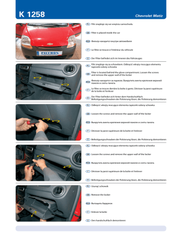 K 1258 Chevrolet Matiz PL Filtr znajduje się we wnętrzu samochodu GB Filter is placed inside the car RUS Фильтр находится внутри автомобиля F Le filtre se trouve à l’intérieur du véhicule D Der Filter befindet sich im Inneren des Fahrzeuges PL Filtr znajduje się za schowkiem. Odkręcić wkręty mocujące elementu tapicerki osłony schowka GB Filter is located behind the glove compartment. Loosen the screws and remove the upper wall of the locker RUS Фильтр находится за ящиком. Выкрутить винты крепения верхней панели и снять панель F Le filtre se trouve derrière la boîte à gants. Dévisser la paroi supérieure de la boîte et l’enlever D Der Filter befindet sich hinter dem Handschuhfach. Befestigungsschrauben der Polsterung lösen, die Polsterung demontieren PL Odkręcić wkręty mocujące elementu tapicerki osłony schowka GB Loosen the screws and remove the upper wall of the locker RUS Выкрутить винты крепения верхней панели и снять панель F Dévisser la paroi supérieure de la boîte et l’enlever D Befestigungsschrauben der Polsterung lösen, die Polsterung demontieren PL Odkręcić wkręty mocujące elementu tapicerki osłony schowka GB Loosen the screws and remove the upper wall of the locker RUS Выкрутить винты крепения верхней панели и снять панель F Dévisser la paroi supérieure de la boîte et l’enlever D Befestigungsschrauben der Polsterung lösen, die Polsterung demontieren PL Usunąć schowek GB Remove the locker RUS Вытащить бардачок F Enlever la boîte D Den handschuhfach demontieren K 1258 Chevrolet Matiz PL Ostrożnie usunąć zabrudzony filtr, następnie zamontować nowy oraz wykonać powyższe czynności w kolejności odwrotnej GB Gently remove the old filter, put in the new one and carry out the opposite to all the previously mentioned operations in the reversed order RUS Осторожно удалить загрязненный фильтр, затем вмонтировать новый и выполнить те же действия в обратной последовательности F Enlever soigneusement le filtre usagé, en installer un nouveau et réaliser les opérations mentionnées ci-dessus dans l’ordre inverse D Das verschmutzte Filter vorsichtig entfernen, das neue einlegen und die oben genannten Arbeitsschritte in umgekehrter Reihenfolge durchführen