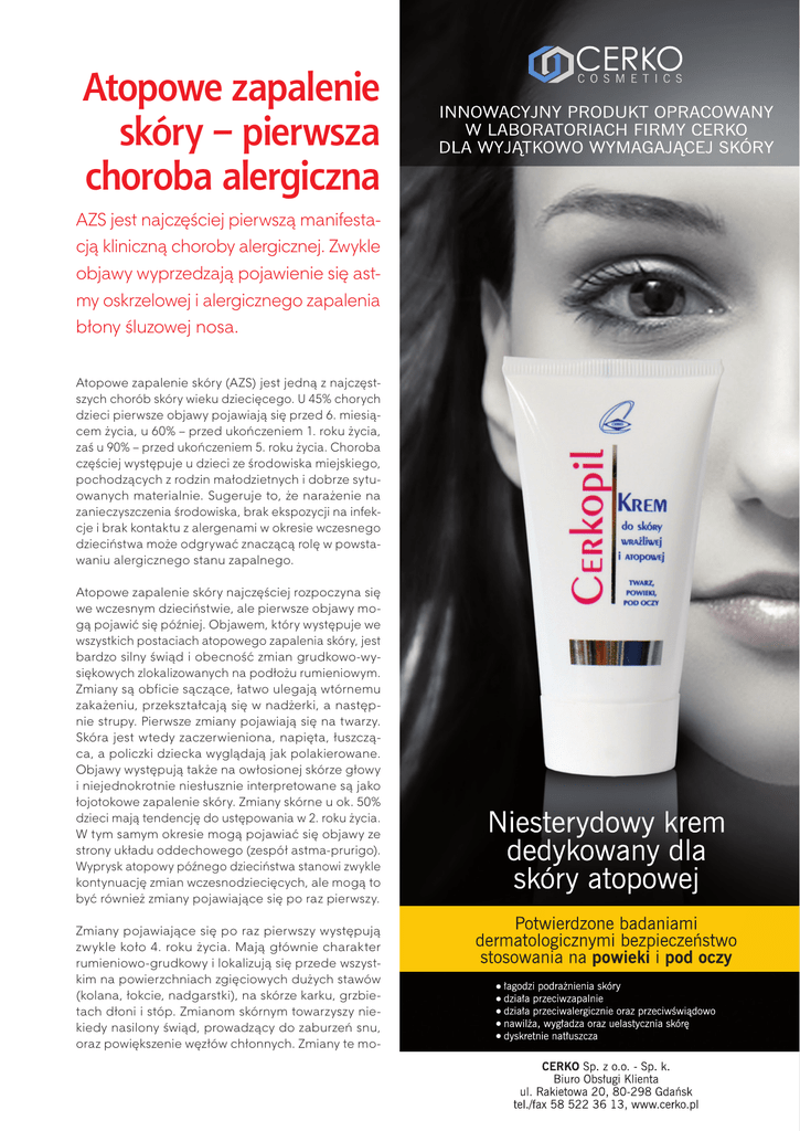 Farmakoterapia Atopowe zapalenie skóry – pierwsza choroba alergiczna AZS jest najczęściej pierwszą manifestacją kliniczną choroby alergicznej. Zwykle objawy wyprzedzają pojawienie się astmy oskrzelowej i alergicznego zapalenia błony śluzowej nosa. Atopowe zapalenie skóry (AZS) jest jedną z najczęstszych chorób skóry wieku dziecięcego. U 45% chorych dzieci pierwsze objawy pojawiają się przed 6. miesiącem życia, u 60% – przed ukończeniem 1. roku życia, zaś u 90% – przed ukończeniem 5. roku życia. Choroba częściej występuje u dzieci ze środowiska miejskiego, pochodzących z rodzin małodzietnych i dobrze sytuowanych materialnie. Sugeruje to, że narażenie na zanieczyszczenia środowiska, brak ekspozycji na infekcje i brak kontaktu z alergenami w okresie wczesnego dzieciństwa może odgrywać znaczącą rolę w powstawaniu alergicznego stanu zapalnego. Atopowe zapalenie skóry najczęściej rozpoczyna się we wczesnym dzieciństwie, ale pierwsze objawy mogą pojawić się później. Objawem, który występuje we wszystkich postaciach atopowego zapalenia skóry, jest bardzo silny świąd i obecność zmian grudkowo-wysiękowych zlokalizowanych na podłożu rumieniowym. Zmiany są obficie sączące, łatwo ulegają wtórnemu zakażeniu, przekształcają się w nadżerki, a następnie strupy. Pierwsze zmiany pojawiają się na twarzy. Skóra jest wtedy zaczerwieniona, napięta, łuszcząca, a policzki dziecka wyglądają jak polakierowane. Objawy występują także na owłosionej skórze głowy i niejednokrotnie niesłusznie interpretowane są jako łojotokowe zapalenie skóry. Zmiany skórne u ok. 50% dzieci mają tendencję do ustępowania w 2. roku życia. W tym samym okresie mogą pojawiać się objawy ze strony układu oddechowego (zespół astma-prurigo). Wyprysk atopowy późnego dzieciństwa stanowi zwykle kontynuację zmian wczesnodziecięcych, ale mogą to być również zmiany pojawiające się po raz pierwszy. Zmiany pojawiające się po raz pierwszy występują zwykle koło 4. roku życia. Mają głównie charakter rumieniowo-grudkowy i lokalizują się przede wszystkim na powierzchniach zgięciowych dużych stawów (kolana, łokcie, nadgarstki), na skórze karku, grzbietach dłoni i stóp. Zmianom skórnym towarzyszy niekiedy nasilony świąd, prowadzący do zaburzeń snu, oraz powiększenie węzłów chłonnych. Zmiany te mo19 Farmakoterapia gą ustąpić ok. 10.–12. roku życia lub przejść w następną fazę, którą jest wyprysk atopowy okresu młodzieńczego i osób dorosłych. Wyprysk atopowy okresu młodzieńczego i osób dorosłych pojawia się zwykle w okresie dojrzewania i rzadko utrzymuje się do wieku dorosłego. Zmiany te umiejscowione są symetrycznie. Głównym objawem jest uporczywy świąd, a na zmienionej chorobowo skórze pojawiają się liczne przeczosy i nadżerki pokryte krwistymi strupami. Świąd ma charakter stały lub napadowy, jego nasilenie w nocy często powoduje bezsenność, wyczerpanie i rozdrażnienie. Leczenie atopowego zapalenia skóry Etiologia i patomechanizm AZS nie są w pełni poznane, dlatego leczenie tej choroby polega przede wszystkim na zwalczaniu objawów. Stosując leczenie zewnętrzne i środki do pielęgnacji skóry, należy pamiętać o tym, że pacjent może się uczulić na stosowane preparaty. Prawidłowe leczenie zmian skórnych poprzez zmniejszenie stanu zapalnego skóry ogranicza możliwości alergizacji pacjenta. Pielęgnacja Jednym z najczęściej występujących objawów mniejszych tej choroby jest suchość skóry, spowodowana nieprawidłowym metabolizmem lipidów naskórkowych. U chorych stwierdza się podwyższony poziom kwasu linolenowego oraz obniżony poziom kwasu g-linolenowego i kwasu arachidonowego w surowicy krwi. Skóra ulega odwodnieniu, staje się bardziej podatna na niekorzystne działanie czynników środowiskowych i podrażnienia. Występowaniu suchości skóry bardzo często towarzyszy nasilony świąd, który prowokuje chorego do drapania się, co z kolei nasila stan zapalny w skórze i wzrost wrażliwości na czynniki drażniące. W efekcie choroba się nasila. Zwalczanie suchości skóry u dzieci z alergicznymi chorobami skóry powinno być jednym z najważniejszych elementów postępowania leczniczego. Służą do tego preparaty natłuszczające, które stosowane zewnętrznie wspomagają tworzenie okluzyjnego filmu lipidowego i wzmacniają barierę lipidową cementu naskórkowego. Zabezpieczając skórę przed utratą wody, zwiększają jej elastyczność i zmniejszają uczucie świądu. Emolienty mogą być stosowane w różnej formie. W sprzedaży doHENNA WAX szampon do włosów stępne są olejki, Pilomax emulsje i płyny do kąpieli leczniczej, Najskuteczniejszą regenerację i wzmocnienie włosów zapewniają dermokosmetyki dostępne żele i mydła do myw aptekach. Bardzo ważnymi elementami kuracji cia niezawierające regenerującej są szampony głęboko oczyszczadetergentów, a takjące. Składniki zawarte w środkach stylizacyjnych że balsamy i kremy i odżywkach do codziennego stosowania (m.in. do ciała. U pacjenoleje i silikony) wytwarzają na osłonce włosa trudne do usunięcia złogi, które uniemożliwiają penetów z atopowym trację kory włosa przez aktywne składniki maski. zapaleniem skóry Dlatego zaleca się, by przed użyciem maski umyć szczególnie wskawłosy głęboko oczyszczającym szamponem, który zane są kąpiele – rozchyla łuski, usuwa złogi i przygotowuje włos do działają one nawilkontaktu z maską. Szampony oczyszczające należy stosować bezpośrednio przed aplikacją maski, żająco i usuwają jako integralną część kuracji wzmacniającej. z powierzchni skóry alergeny oraz sub- 20 stancje nieswoiście drażniące. Kąpiele nie powinny jednak odbywać się w gorącej wodzie, ponieważ niszczy ona naturalny płaszcz lipidowy skóry. Temperatura wody powinna być zbliżona do temperatury ciała. Kąpiele nie mogą trw
