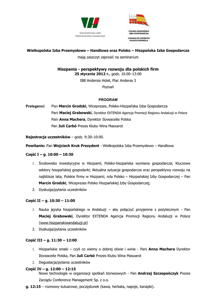 Wielkopolska Izba Przemysłowo – Handlowa oraz Polsko – Hiszpańska Izba Gospodarcza mają zaszczyt zaprosić na seminarium Hiszpania - perspektywy rozwoju dla polskich firm 25 stycznia 2012 r., godz. 10.00–13:00 IBB Andersia Hotel, Plac Andersa 3 Poznań PROGRAM Prelegenci: Pan Marcin Grodzki, Wiceprezes, Polsko-Hiszpańska Izba Gospodarcza Pani Maciej Grabowski, Dyrektor EXTENDA Agencja Promocji Regionu Andaluzji w Polsce Pani Anna Machera, Dyrektor Iloveaceite Polska Pan Juli Carbó Prezes Klubu Wina Masxarot Rejestracja uczestników – godz. 9:30–10:00. Powitanie: Pan Wojciech Kruk Prezydent - Wielkopolska Izba Przemysłowo – Handlowa Część I – g. 10:00 – 10:30 1. Środowisko inwestycyjne w Hiszpanii; Polsko-hiszpańska wymiana gospodarcza; Kluczowe sektory hiszpańskiej gospodarki; Aktualna sytuacja gospodarcza oraz perspektywy rozwoju na najbliższe lata; Polskie firmy w Hiszpanii; rola Polsko – Hiszpańskiej Izby Gospodarczej – Pan Marcin Grodzki, Wiceprezes Polsko Hiszpańskiej Izby Gospodarczej; 2. Dyskusja/pytania uczestników Część II – g. 10:30 – 11:00 1. Nauka języka hiszpańskiego w Andaluzji – aby połączyć przyjemne z pożytecznym - Pan Maciej Grabowski, Dyrektor EXTENDA Agencja Promocji Regionu Andaluzji w Polsce (www.hiszpanskiwandaluzji.pl) 2. Dyskusja/pytania uczestników Część III – g. 11:30 – 12:00 1. Hiszpańskie smaki – czyli co wiemy o dobrej oliwie i winie - Pani Anna Machera Dyrektor Iloveaceite Polska, Pan Juli Carbó Prezes Klubu Wina Masxarot 2. Degustacja/pytania uczestników Część IV – g. 12:00 – 12:15 Nowe technologie w organizacji spotkań biznesowych - Pan Andrzej Szczepańczyk Prezes Zarządu Conference Management Sp. z o.o. g. 12:15 – rozmowy kuluarowe, poczęstunek (kawa, herbata, napoje, kanapki).