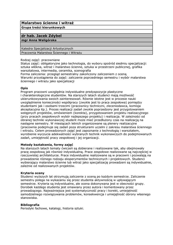 Malarstwo ścienne i witraż Grupa treści kierunkowych dr hab. Jacek Zdybel mgr Anna Waligórska Katedra Specjalizacji Artystycznych Pracownia Malarstwa Ściennego i Witrażu Rodzaj zajęć: pracowniane Status zajęć: obligatoryjne jako technologia, do wyboru spośród siedmiu specjalizacji: sztuka włókna, witraż i malarstwo ścienne, sztuka w przestrzeni publicznej, grafika warsztatowa, intermedia, ceramika, scenografia Forma zaliczenia: przegląd semestralny zakończony zaliczeniem z oceną Warunki przystąpienia do zajęć: zaliczenie poprzedniego semestru i wybór malarstwa ściennego i witrażu jako specjalizacji Opis Program pracowni uwzględnia indywidualne predyspozycje plastyczne i charakterologiczne studentów. Na starszych latach studenci mają możliwość ukierunkowywania swoich zainteresowań. Równie istotne jest w procesie nauki uwzględnienie konieczności współpracy (zwykle jest to praca zespołowa) pomiędzy studentami jak i osobami trzecimi (pracownicy techniczni, zleceniodawca, komisja akceptacyjna itp.). Proces realizacji zadań zwykle poprzedzony jest przygotowaniem wstępnych projektów, omówieniem (korekta), przygotowaniem projektu realizacyjnego (przy pracach zespołowych wybór najlepszego projektu) i realizacja. W zależności od obranej techniki wykonawczej student może mieć przedłużony czas na realizacją na następne semestry. W miesiącach letnich organizowane są plenery realizacyjne (pracownia podejmuje się zadań poza strukturami uczelni z zakresu malarstwa ściennego i witrażu. Celem prowadzonych zajęć jest zapoznanie z technologią i warsztatem, wyrobienie wyczucia adekwatności wybranych technik wykonawczych do podejmowanych zadań, umiejętność pracy zespołowej i jej organizacji. Metody kształcenia, formy zajęć Na starszych latach tematy ćwiczeń są dobierane i realizowane tak, aby obejmowały pracę zespołową jak również indywidualną. Prace zespołowe realizowane są najczęściej w rzeczywistej architekturze. Prace indywidualne realizowane są w pracowni i pozwalają na prowadzenie różnego rodzaju eksperymentów technicznych i projektowych. Studenci wybierający malarstwo ścienne lub witraż jako specjalizację prowadzeni są indywidualnie, zależnie od realizowanych projektów. Kryteria oceny Studenci wyższych lat otrzymują zaliczenie z oceną po każdym semestrze. Zaliczenie semestru polega na wykazaniu się przez studenta aktywnością w upływającym semestrze. Kryteria są indywidualne, ale ocena dokonywana jest w obecności grupy. Dorobek każdego studenta jest omawiany przez autora i komentowany przez prowadzącego. Najważniejsza jest systematyczność pracy i korekt, umiejętność samodzielnego rozwiązywania problemów, konsekwencja i umiejętność obrony własnego stanowiska. Bibliografia Periodyki fachowe, katalogi, historia sztuki.