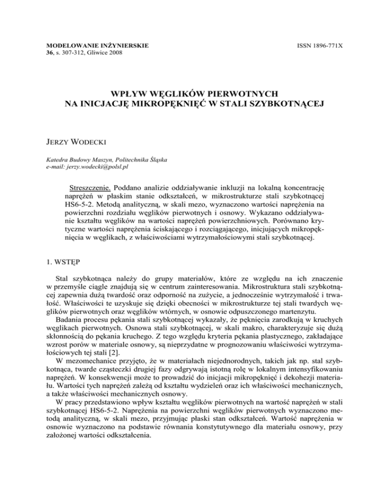 MODELOWANIE INśYNIERSKIE 36, s. 307-312, Gliwice 2008 ISSN 1896-771X WPŁYW WĘGLIKÓW PIERWOTNYCH NA INICJACJĘ MIKROPĘKNIĘĆ W STALI SZYBKOTNĄCEJ JERZY WODECKI Katedra Budowy Maszyn, Politechnika Śląska e-mail: [email protected] Streszczenie. Poddano analizie oddziaływanie inkluzji na lokalną koncentrację napręŜeń w płaskim stanie odkształceń, w mikrostrukturze stali szybkotnącej HS6-5-2. Metodą analityczną, w skali mezo, wyznaczono wartości napręŜenia na powierzchni rozdziału węglików pierwotnych i osnowy. Wykazano oddziaływanie kształtu węglików na wartości napręŜeń powierzchniowych. Porównano krytyczne wartości napręŜenia ściskającego i rozciągającego, inicjujących mikropęknięcia w węglikach, z właściwościami wytrzymałościowymi stali szybkotnącej. 1. WSTĘP Stal szybkotnąca naleŜy do grupy materiałów, które ze względu na ich znaczenie w przemyśle ciągle znajdują się w centrum zainteresowania. Mikrostruktura stali szybkotnącej zapewnia duŜą twardość oraz odporność na zuŜycie, a jednocześnie wytrzymałość i trwałość. Właściwości te uzyskuje się dzięki obecności w mikrostrukturze tej stali twardych węglików pierwotnych oraz węglików wtórnych, w osnowie odpuszczonego martenzytu. Badania procesu pękania stali szybkotnącej wykazały, Ŝe pęknięcia zarodkują w kruchych węglikach pierwotnych. Osnowa stali szybkotnącej, w skali makro, charakteryzuje się duŜą skłonnością do pękania kruchego. Z tego względu kryteria pękania plastycznego, zakładające wzrost porów w materiale osnowy, są nieprzydatne w prognozowaniu właściwości wytrzymałościowych tej stali [2]. W mezomechanice przyjęto, Ŝe w materiałach niejednorodnych, takich jak np. stal szybkotnąca, twarde cząsteczki drugiej fazy odgrywają istotną rolę w lokalnym intensyfikowaniu napręŜeń. W konsekwencji moŜe to prowadzić do inicjacji mikropęknięć i dekohezji materiału. Wartości tych napręŜeń zaleŜą od kształtu wydzieleń oraz ich właściwości mechanicznych, a takŜe właściwości mechanicznych osnowy. W pracy przedstawiono wpływ kształtu węglików pierwotnych na wartość napręŜeń w stali szybkotnącej HS6-5-2. NapręŜenia na powierzchni węglików pierwotnych wyznaczono metodą analityczną, w skali mezo, przyjmując płaski stan odkształceń. Wartość napręŜenia w osnowie wyznaczono na podstawie równania konstytutywnego dla materiału osnowy, przy załoŜonej wartości odkształcenia. 308 WPŁYW WYDZIELEŃ WĘGLIKÓW PIERWOTNYCH NA INICJACJĘ MIKROPĘKNIĘĆ ... 2. METODA ANALITYCZNA OBLICZANIA NAPRĘśEŃ NA POWIERZCHNI INKLUZJI W analizie, w skali mezo, stanu napręŜeń na powierzchni wydzieleń węglików pierwotnych przyjęto model inkluzji w kształcie walca, otoczonej osnową, w obecności napręŜenia rozciągającego S (rys. 1). 2a m p x q Θ n r y S Rys. 1. Schemat modelu inkluzji NapręŜenia w otoczeniu inkluzji wyznaczono z zaleŜności [3]: σr = 2 2 4 S 1 + 2α1 β − 2α2 − β a 4(1 − β ) a 3(1 − β ) a 1 1 cos 2 + + − + Θ 2 2α2 + β − 1 r 1 − β + 4α1 β r 1 − β + 4α1 β r (1) σΘ = 2 4 S 1 + 2α1 β − 2α2 − β a 3(1 − β ) a 1 − − 1 + cos 2 Θ 2 2α2 + β − 1 r 1 − β + 4α1 β r (2) S 2(1 − β ) a 3(1 − β ) a = − 1 + − 2 1 − β + 4α1 β r 1 − β + 4α1 β r 2 σ rΘ gdzie: 4 sin 2Θ S – napręŜenie rozciągające, E – moduł Younga, ν – współczynnik Poissona, E G= – moduł Kirchhoffa, 2(1 + ν ) G1 – moduł Kirchhoffa osnowy, G2 – moduł Kirchhoffa inkluzji, G β= 2, G1 a – promień inkluzji, 1 − νi dla płaskiego stanu odkształceń, i = 1, 2, αi = (1 + νi )−1 dla płaskiego stanu napręŜeń. (3) J. WODECKI 309 Do obliczenia napręŜeń na powierzchni węglików pierwotnych przyjęto właściwości mechaniczne charakteryzujące stal szybkotnącą HS6-5-2 (Tablica 1). Tablica 1. Właściwości mechaniczne węglików pierwotnych i osnowy stali HS6-5-2 [1, 2] Właściwość Moduł Younga, GPa Współczynnik Poissona Węgliki MC M6 C Osnowa 351 286 240 0,19 0,30 Stosowane kryterium zniszczenia maksymalne napręŜenie rozciągające odkształcenie plastyczne Wartość krytyczna dla przyjętego kryterium 1500 MPa 0,1% Próby rozciągania in-situ wykonane przy zastosowaniu mikroskopu skaningowego wykazały, Ŝe pęknięcia próbek wykonanych ze stali szybkotnącej następują juŜ przy małych wartościach odkształcenia plastycznego osnowy. Podobne wyniki uzyskano, stosując obliczenia modelowe metodą elementów skończonych. Wykazano, Ŝe zarodkowanie mikropęknięć w osnowie występuje przy jej odkształceniu plastycznym ε = 0,1%. Te mikropęknięcia wywoływały z kolei pękanie znajdujących się w ich pobliŜu węglików [1]. W badaniach pękania stali HS6-5-2, przeprowadzonych metodą analityczną, przyjęto więc, Ŝe napręŜenia występujące w osnowie powstaną na skutek jej odkształcenia plastycznego o wartości ε = 0,1%. Dla określenia wartości napręŜenia rozciągającego S w równaniach (1) ÷ (3), zastosowano równanie konstytutywne, które dla osnowy stali szybkotnącej ma postać [1] σ = 1500 + 1101 [1 − exp (− ε / 0,00369)] gdzie: (4) σ – napręŜenie normalne przy rozciąganiu, MPa, ε – odkształcenie plastyczne w kierunku σ. Na podstawie zaleŜności (4) wyznaczono wartość S = 1761 MPa. Pozostałe wartości współczynników występujących w równaniach (1) ÷ (3) podano w tablicy 2. 310 WPŁYW WYDZIELEŃ WĘGLIKÓW PIERWOTNYCH NA INICJACJĘ MIKROPĘKNIĘĆ ... Tablica 2. Wartości współczynników równań (1) ÷ (3), dla modelu inkluzji – węglik otoczony osnową Wartość Typ węglika Osnowa obliczona MC M6 C Moduł Kirchhoffa, 120 147 120 MPa α1 0,70 - - α2 - 0,81 0,81 β - 1,70 1,35 Wartości napręŜeń określonych na podstawie zaleŜności (1) ÷ (3) w punktach q, n, p, m inkluzji (rys. 1) przedstawiono w tablicy 3. Tablica 3. Wartości napręŜeń 